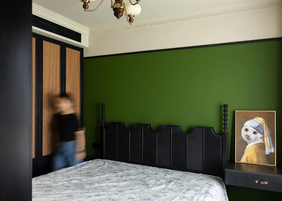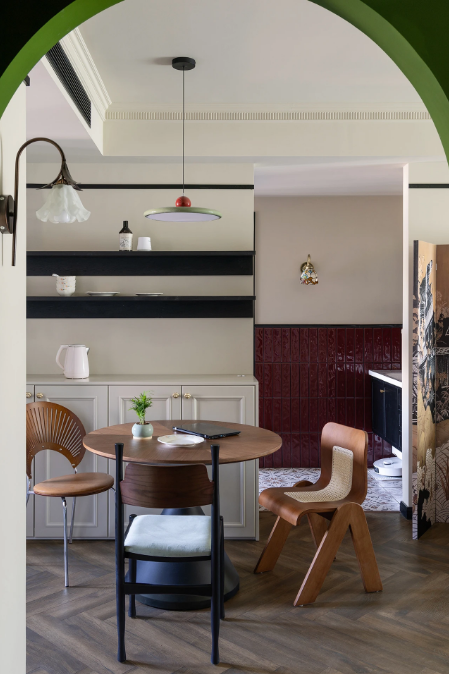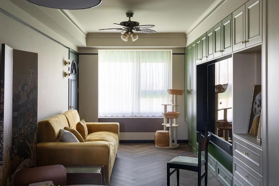 這是一套套內(nèi)69平米的精裝房交付的三居室,屋主是一對性格開朗的小夫妻,原裝風(fēng)格不符合屋主喜好,于是進(jìn)行了全屋改造,拆除地面,水電局改,吊頂,造型,刷漆...最終呈現(xiàn)了一場復(fù)古南洋風(fēng)格的視覺盛宴。 一進(jìn)門,就給這個(gè)家定了基調(diào):復(fù)古與質(zhì)感。復(fù)古的綠色+拱形門洞,玄關(guān)仿佛變身成為連接外界與室內(nèi)的時(shí)空隧道,氛圍感十足! 餐廳選擇使用靈活的圓形餐桌,從進(jìn)門,視覺上就不會(huì)顯得擁堵。直徑90公分的餐桌,小巧玲瓏,平時(shí)靠著餐邊柜,二人就餐正好。 推拉門居中并換成了拱形玻璃門(水波紋)的樣式,空間利用率大大提升。 客餐廳之間的門洞通往衛(wèi)生間干區(qū):洗手臺(tái)。這里進(jìn)行了徹底的翻新改造。 半高的磚墻是由瓦工師傅一片一片瓷磚粘貼上去的,每一片磚都有自己的紋理和變化,這份精致感是任何大面積材料所無法給予的。 客餐廳的所有墻面頂部,都有一條貫穿的黑色木質(zhì)線條,給空間提氣。 客廳通過硬裝的局部改造,將沙發(fā)與電視墻的位置進(jìn)行對調(diào),更加符合屋主的生活習(xí)慣。 窗臺(tái)之上也做了儲(chǔ)物柜,上翻蓋板,頂部與窗戶底沿取齊,落地高度為60公分。