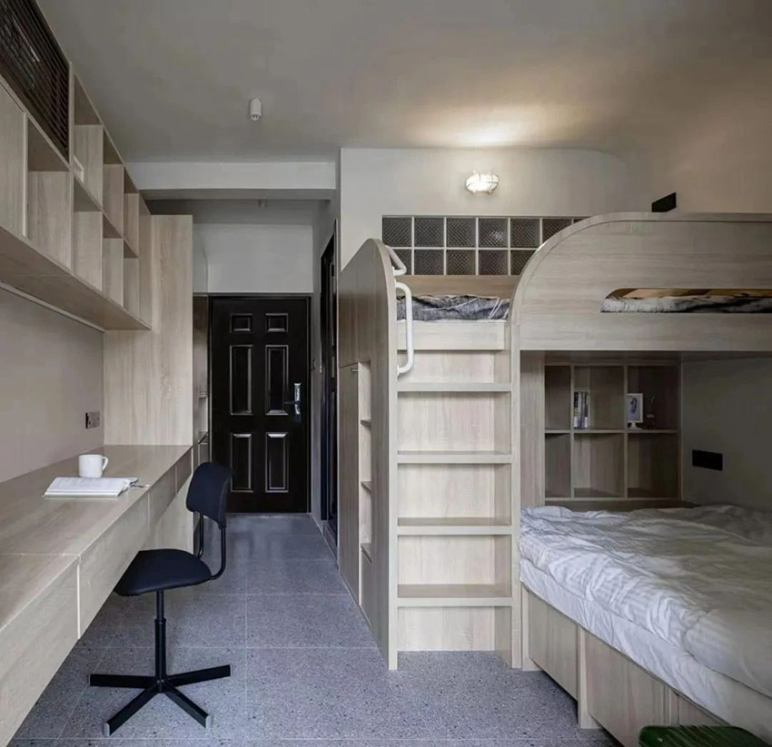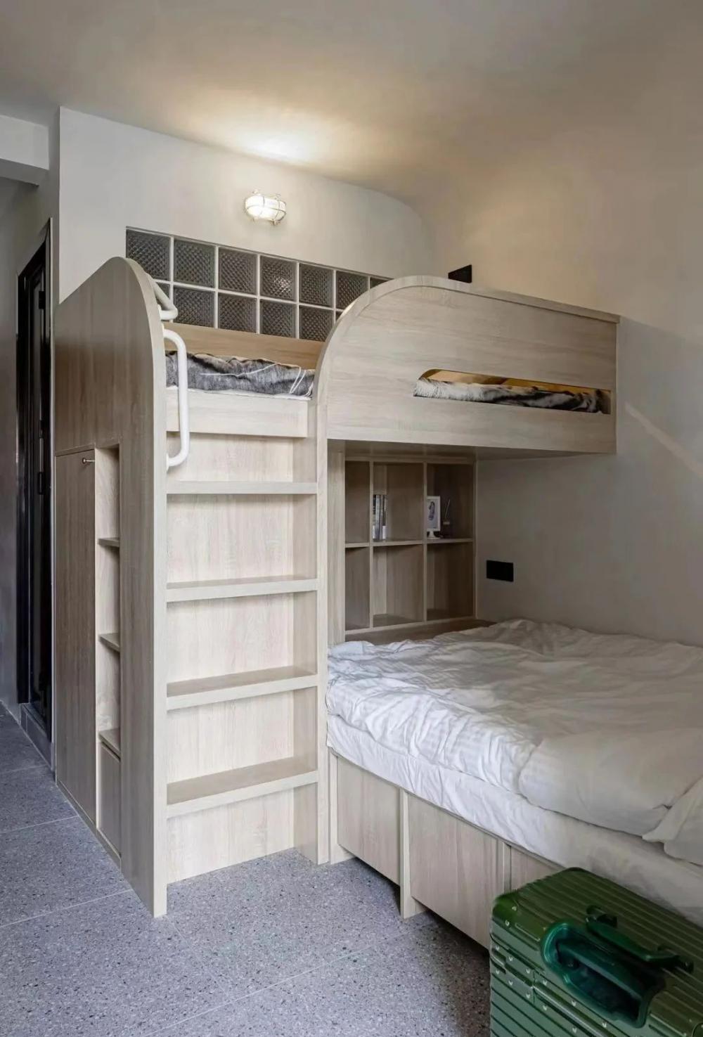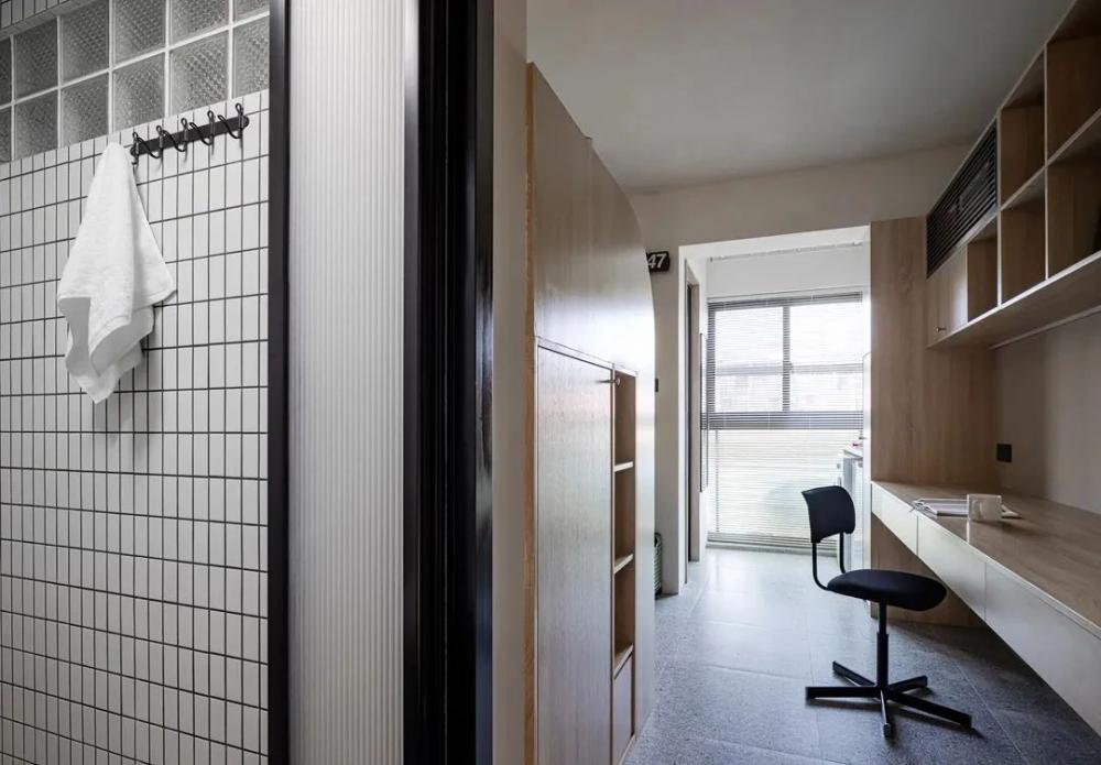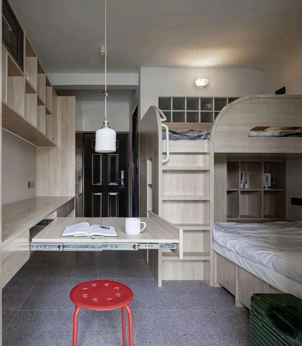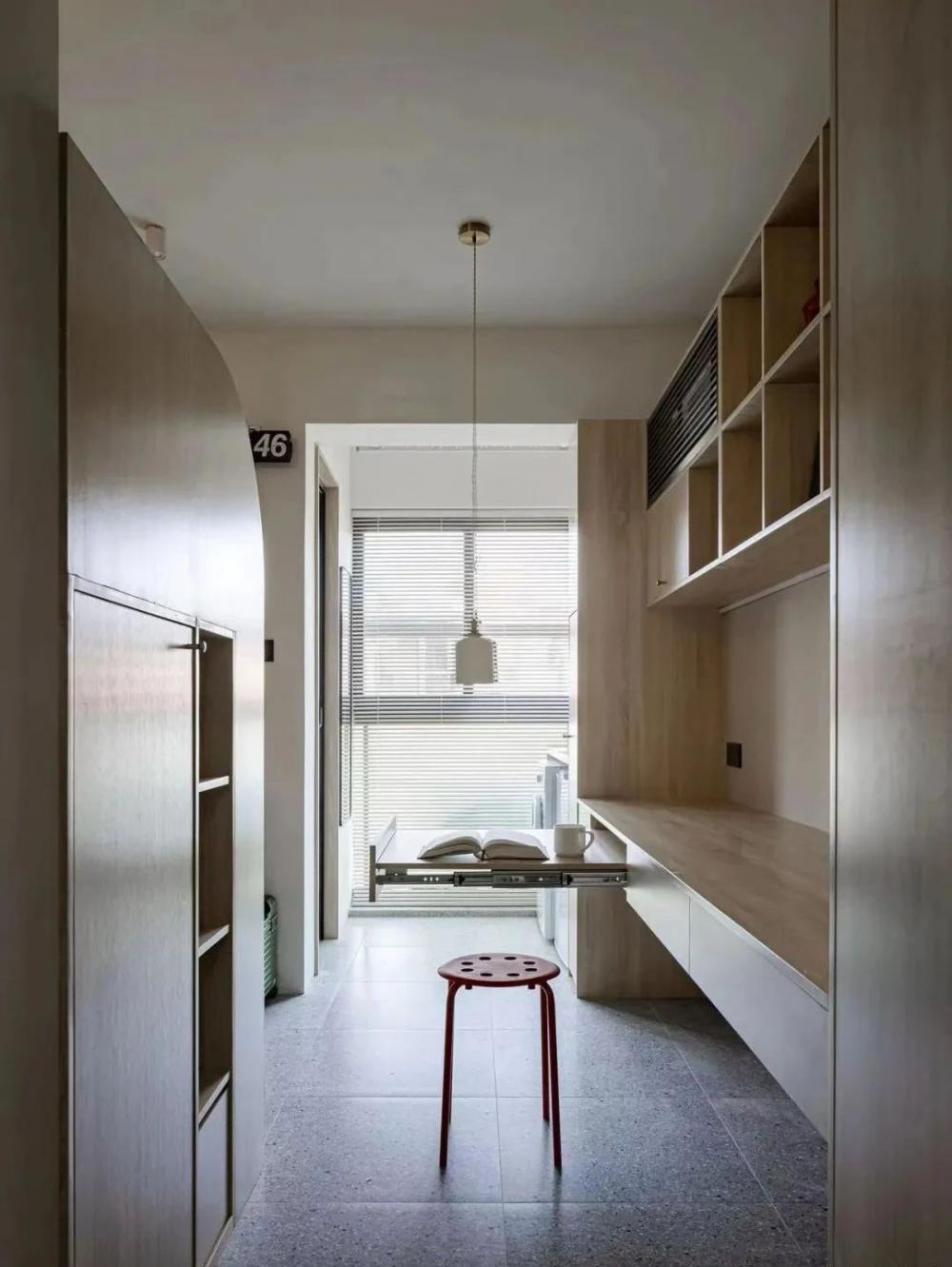 實在想不到,只有?24㎡ 要怎么保證一個家庭的居住需求。今天這個家,算是讓我開眼了。 原本只能放一張桌、一張床、一個小衣柜的空間,在設計師的幫助下,竟然裝下了鞋帽柜、衣柜、書柜、榻榻米、洗衣柜、上下兩張床,書桌兼餐桌……而且房間還更加通透了? 這套為了孩子上學購買的二手學區(qū)房,面積只有 24㎡,需要擁有一個滿足孩子學習和日常生活起居的空間。 在 2.8 米見方的空間,將書桌、餐桌、兒童床、大人床、衣柜、書柜、收納進行排列重組,實現(xiàn)了空間利用最大化。 進門玄關只有一個開門的寬度,在做鞋帽柜的時候,中間部分做了一個鏤空臺面,既是方便玄關小物隨手拿取,同時還巧妙地把入戶門把手放入,避免把手撞擊。 全屋墻頂面使用白色水泥漆,相比較乳膠漆的直白要柔和一些,也更耐造,書桌墻面單獨刷了一個淺咖色作為區(qū)域劃分,為小空間增加一抹柔和,久居也不乏味。 吊柜底部陰角明裝低壓燈帶,來帶柔和的氛圍。 空調就藏在吊柜的百葉風口里,管道也暗藏在內部,隱藏式收納,讓視覺上空間顯大。 2.6 米長的書桌,還是一個隱藏抽拉餐桌,承載不同的功能。 孩子可以在這里做作業(yè)、做手工。拉開后,這個1m2 不到的桌面,可以滿足三個人就餐。 臥室上下床不同方位的疊放,滿足大人和小孩的日常生活。 兒童床下也不浪費,雙人床尾的空間做了一個書柜+臺面,頂面也嵌入線性燈光,是屬于下鋪的一個小角落。 夜晚孩子睡了,大人也能擁有一點自己的閱讀時間。臺面也是一個隱藏的上翻柜,內部空間可以用來儲物。 雙人床是儲物榻榻米的形式,床邊做了 4 個抽屜,每個抽屜都是一個透氣裝置,抽屜下口不落地,通到每個床板和儲物格子上預留的氣孔,解決榻榻米無法透氣的問題。 廚房選擇小磚,豐富的線條讓視覺有放大的感覺。 陽臺的臺面既是洗衣機的操作臺面,也是廚房擴充的小家電安置處。墻面延伸了書桌墻面的淺咖色,配合木質和光線帶來柔和的氛圍感受 入戶即衛(wèi)生間,面積不大,但還是做了干濕分離。