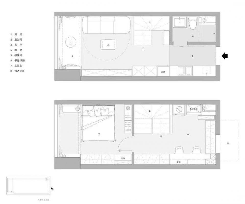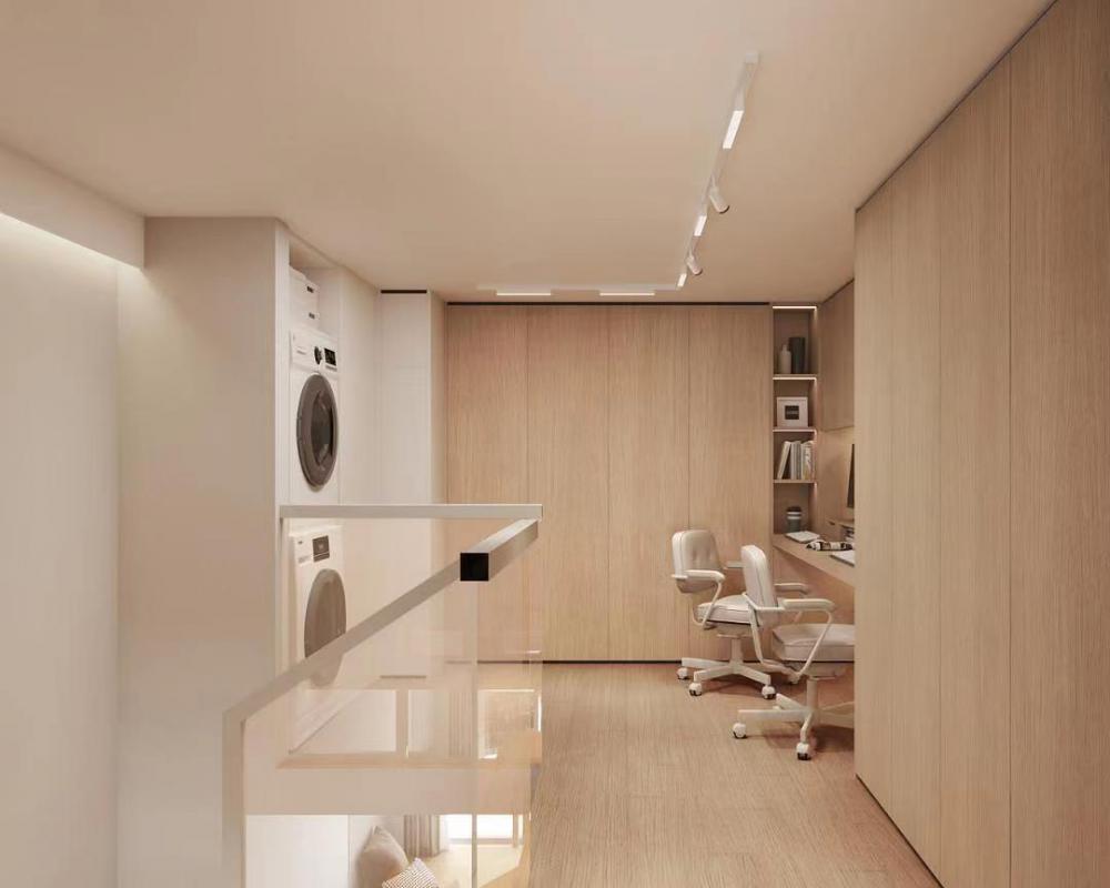 公寓分為上下兩層結(jié)構(gòu),一層為公共活動區(qū)域,設(shè)有客餐廳和廚衛(wèi)功能,二層屬于姑娘們的私人空間,休息區(qū)和辦公區(qū)互不干擾。全屋功能齊全,麻雀雖小,五臟俱全。