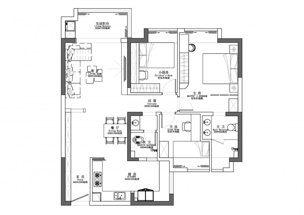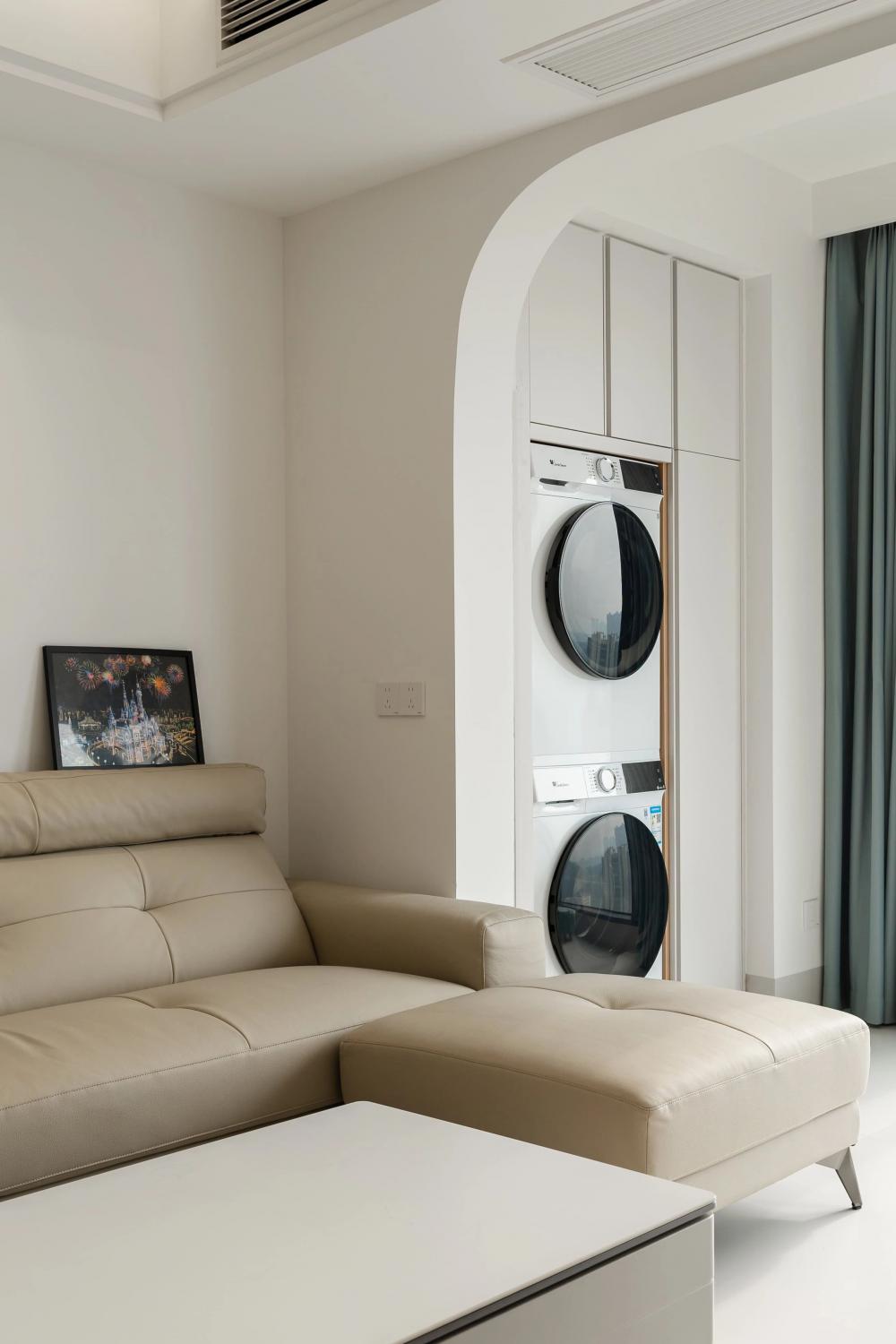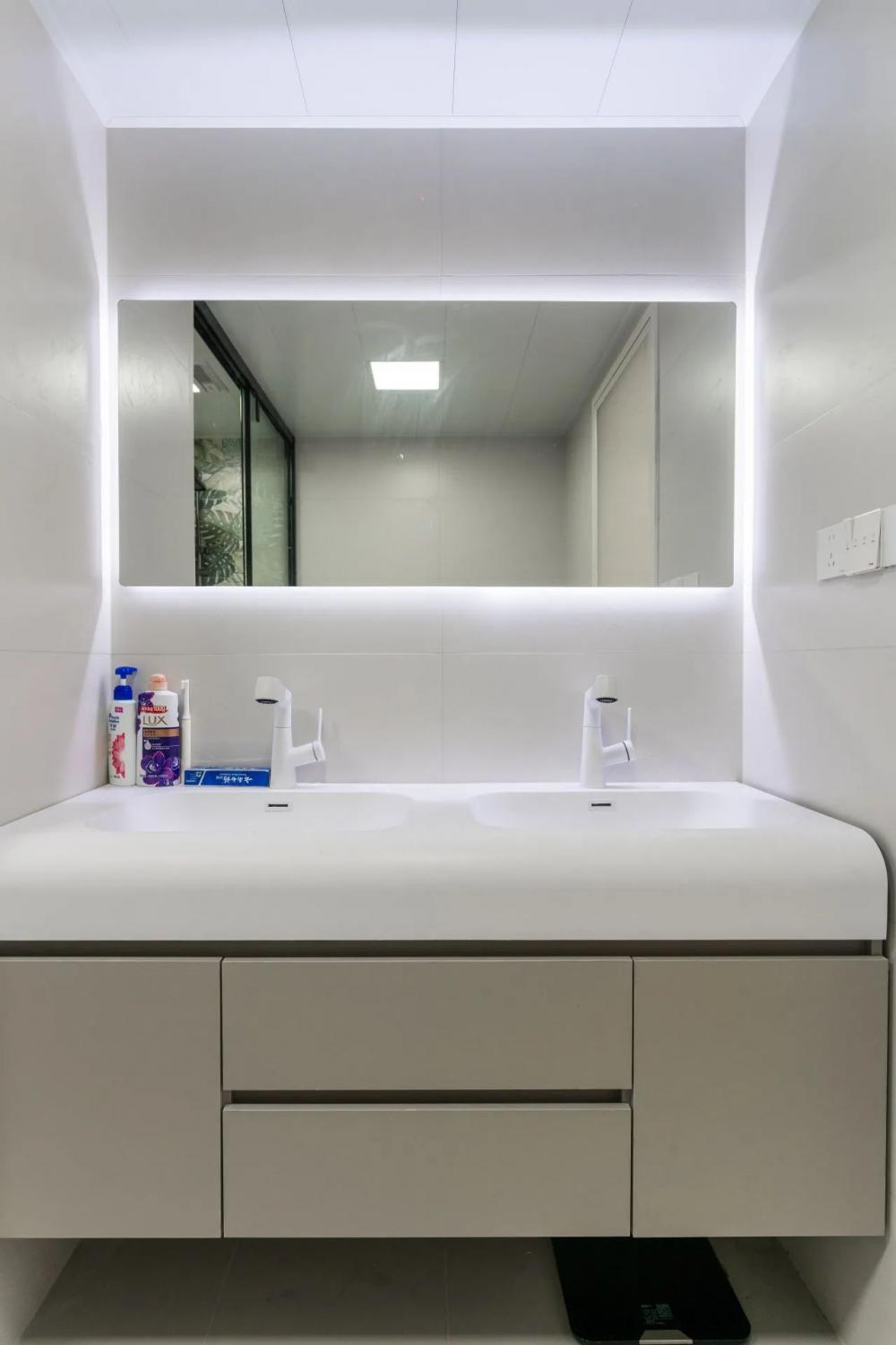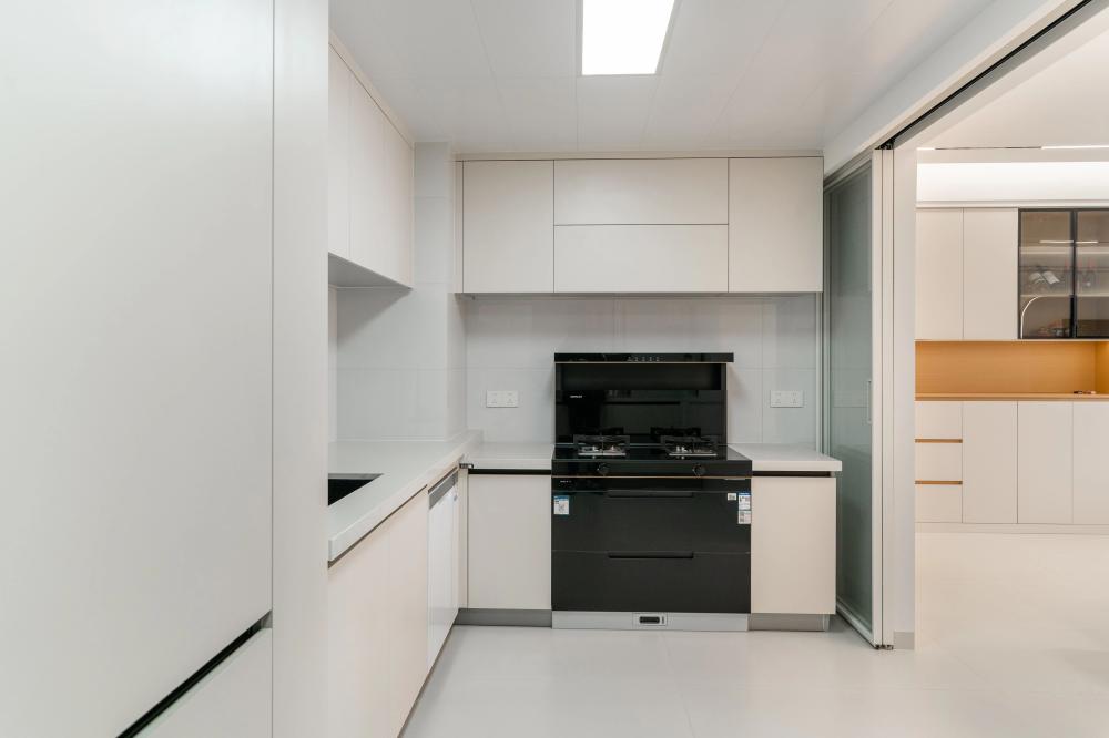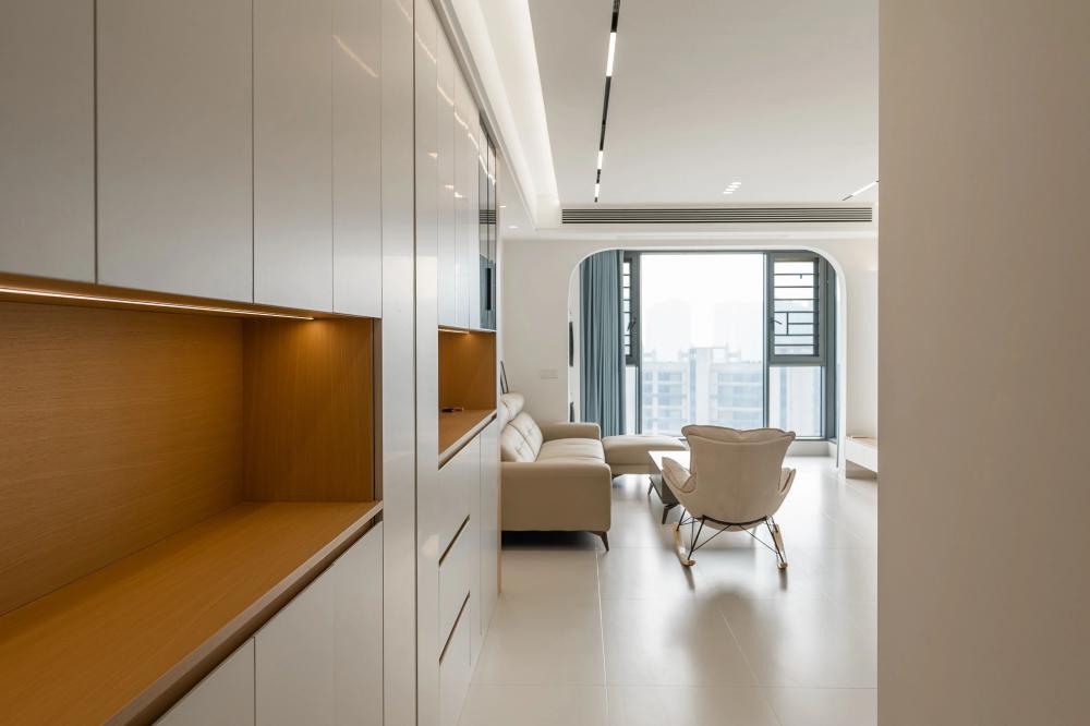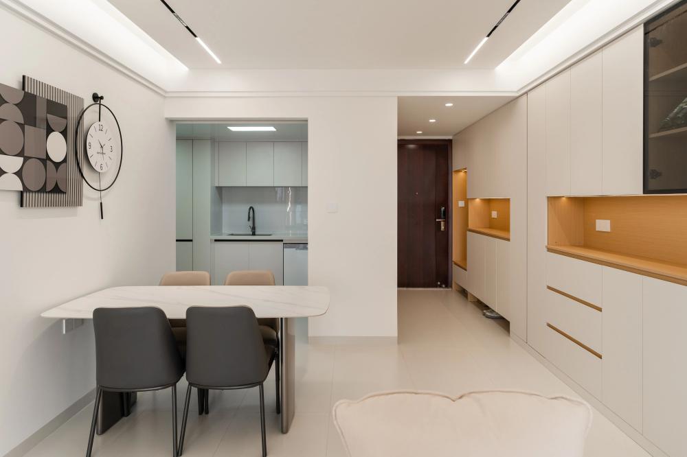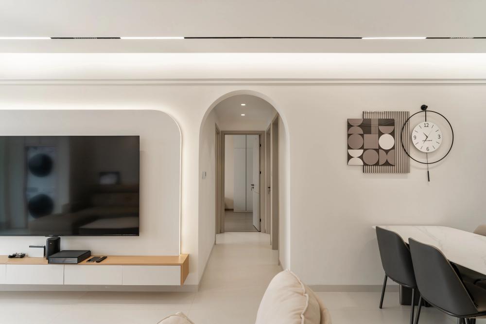 ▲?戶型圖解析:客廳區(qū)域?qū)挸髁?,通過采用磁吸軌道燈、筒燈、射燈、線條燈等多種燈具的組合,營造出層次豐富、光線柔和的視覺效果。廚房部分則將次陽臺打通,大大拓寬了操作空間,使得烹飪和備餐更加便捷高效。 ▲?入戶玄關(guān)采用“鞋柜+餐邊柜”一體化設(shè)計(jì),既實(shí)用又節(jié)省空間。局部留空便于換鞋及隨手放置物品,木質(zhì)元素搭配內(nèi)嵌燈帶。原木與白色調(diào)交織出簡單而溫馨的氛圍。頂面采用無主燈設(shè)計(jì),巧妙拓寬視覺空間,開闊明亮。 ▲?L型布局的廚房以白色為主,簡約大方。設(shè)計(jì)亮點(diǎn)在于將冰箱嵌入櫥柜,優(yōu)化空間利用。黑色家電與銀色元素點(diǎn)綴,干凈整潔。 ▲?采用客餐廳一體設(shè)計(jì),以白色為主色調(diào),搭配氛圍燈帶與線燈,營造明亮溫柔空間。大電視柜與簡約時(shí)鐘點(diǎn)綴,簡潔明亮,充滿現(xiàn)代感。 ▲?主臥簡約硬裝,通刷乳膠漆顯整潔。床尾定制梳妝臺與衣柜一體,巧妙利用空間。轉(zhuǎn)角圓弧設(shè)計(jì)防磕碰,安全又美觀,現(xiàn)代舒適臥室典范。 ▲?采用極簡風(fēng)格,暗裝衛(wèi)浴設(shè)施與白色浴室柜融為一體,彰顯簡約之美。黑白搭配經(jīng)典大氣,LED鏡燈提供溫馨照明,舒適宜居的衛(wèi)浴環(huán)境。