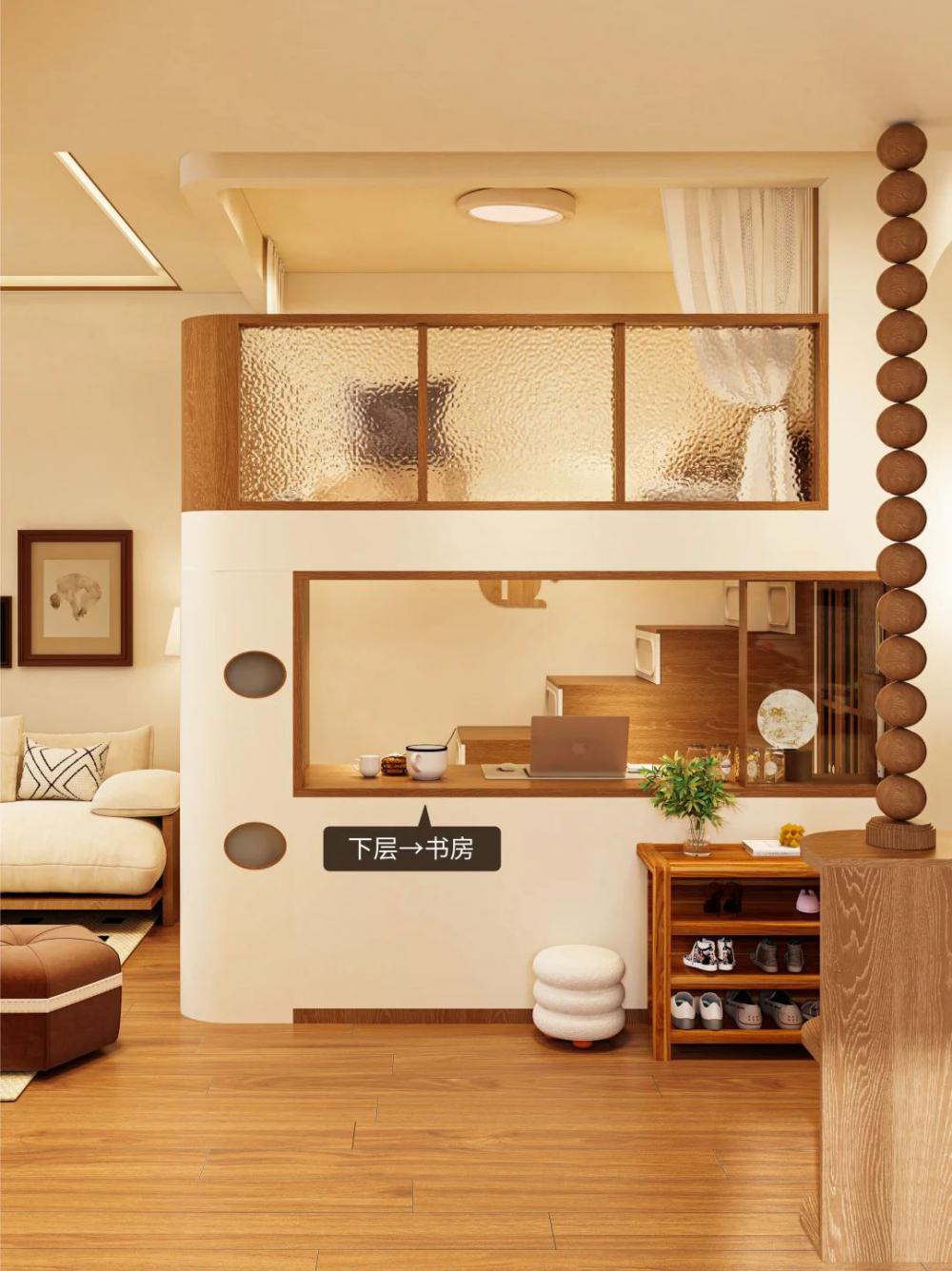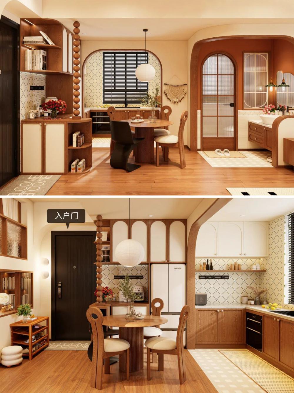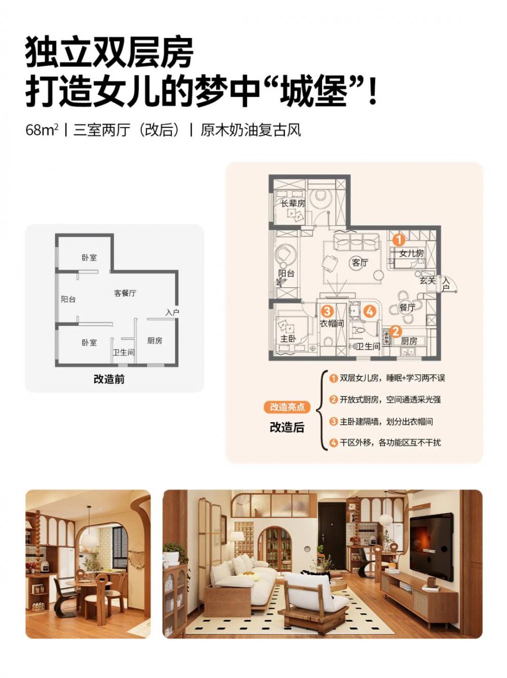 簡介: 面積66平,原木奶油復(fù)古風(fēng) - 業(yè)主為了女兒上學(xué)便利買了這套 僅兩室的二手房,三代人住的很不舒服?? 靠我發(fā)揮改造,業(yè)主直接輕松坐擁?? ?雙層女兒房 ?開放廚房 ?干濕分離衛(wèi)生間 68㎡老破小爆改?原木奶油復(fù)古風(fēng)三居 業(yè)主說:找你設(shè)計(jì)小戶型,合作太愉快啦?? - ??屋主日志 三代5人,夫妻倆+父母+上小學(xué)的女兒?? 女兒想要專屬的睡眠和學(xué)習(xí)區(qū)域?? 解決廚房昏暗以及與餐廳距離遠(yuǎn)的問題 改善早八衛(wèi)生間多人使用時(shí)的擁擠狀況?? - ??雙層女兒房 客餐做雙層布局,空間利用率翻兩倍?? 睡眠區(qū)放上層,圍欄環(huán)繞睡覺隨意翻滾?? 下層打造書柜+書桌,獨(dú)立小書房顯現(xiàn)? 側(cè)面開扇窗,客廳都跟著放大20㎡?? - ??開放廚房 拆除廚房隔墻+內(nèi)推,打造拱形門洞?? 改成開放式設(shè)計(jì),昏暗壓抑一鍵消除?? 外部放置餐桌,餐廚0距離互動感強(qiáng)? - 干濕分離衛(wèi)生間 轉(zhuǎn)移主臥門洞,將洗漱臺外移走廊?? 底部懸空,方便掃地機(jī)器人清潔?? 濕區(qū)做玻璃隔斷,各功能“互不干擾”?? |
