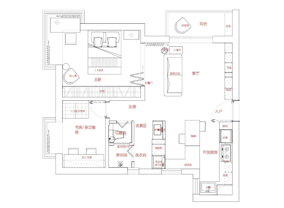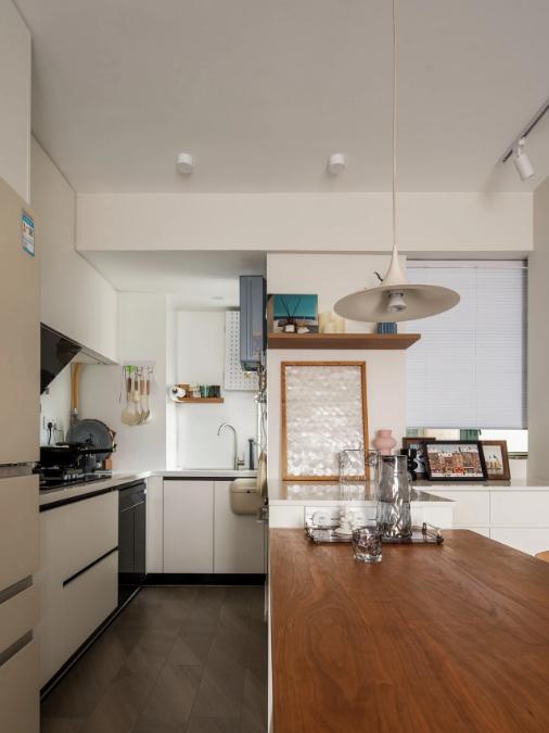 本案業(yè)主是一對年輕夫妻,因為是舊房改造,對原來的格局不是很滿意,最首要的要求就是希望衛(wèi)生間能做到四分離,整體氛圍希望是柔和偏一點奶油色系的溫馨。改造后的家是什么樣子的,一起來看看吧! 原戶型沒有玄關(guān),所以在客廳背景墻處設(shè)了一整面墻的定制柜,入戶一側(cè)為玄關(guān)柜,以滿足入戶收納的需求。 廚房墻體拆除做開放式,L型料理臺連接吧臺形成U型操作空間。根據(jù)業(yè)主的身高和操作習(xí)慣,定制島臺灶臺的高度,更多的考慮了使用的舒適性。廚房空間雖不大,但是功能規(guī)劃合理,下廚也會變得得心應(yīng)手。 餐桌連接吧臺,吧臺豐富了餐廳的使用。與餐邊柜連接做L型操作臺,餐桌與吧臺的高度差,預(yù)留了軌道插座的位置,打火鍋很方便。 客廳以奶油色系為主色調(diào),搭配木色的家具作為點綴,深色木地板沉穩(wěn),整體看上去素雅恬靜,給人一種舒適安寧的愜意感。 電視沒有上墻使客廳的擺放更多變,沙發(fā)和落地?zé)舻目梢苿有?,空間有了更多的靈活性。 邊幾用木色小推車代替,方便移動和多場景使用。 主臥改變開門位置,與客廳用折疊推拉門進行隔斷,完全敞開的時候,整個空間看上去更寬敞。主臥以奶油色和櫻桃木為主色調(diào),與全屋的色調(diào)一致。 飄窗短的一方做梳妝臺,充分利用空間的同時也滿足了梳妝收納的需求。 書房做雙人辦公桌,書架是可自由組裝的,滿足不同高度的書籍?dāng)[放。 下方用收納柜做劃分,墻邊放置了一面全身鏡豐富空間的使用。角落放置了奶油色的皮質(zhì)沙發(fā)椅,展開后變成躺椅,工作累了或者閱讀時隨意一躺,別提有多舒適~ 衛(wèi)生間借餐廳的部分面積進行外擴,做四分離布局,集洗漱、洗衣、馬桶、洗浴于一體的多功能空間。馬桶區(qū)用折疊推拉門,節(jié)省空間,與淋浴區(qū)用長虹玻璃做隔斷,空間更通透明亮。 淋浴區(qū)同樣以折疊推拉門作為空間的隔斷,洗衣機烘干機嵌入柜體。洗漱臺側(cè)邊做鏤空柜,用于日常用品的擺放,下方預(yù)留的空間做掃地機器人的出入口。側(cè)邊薄柜,做抽拉式收納,空間利用最大化。