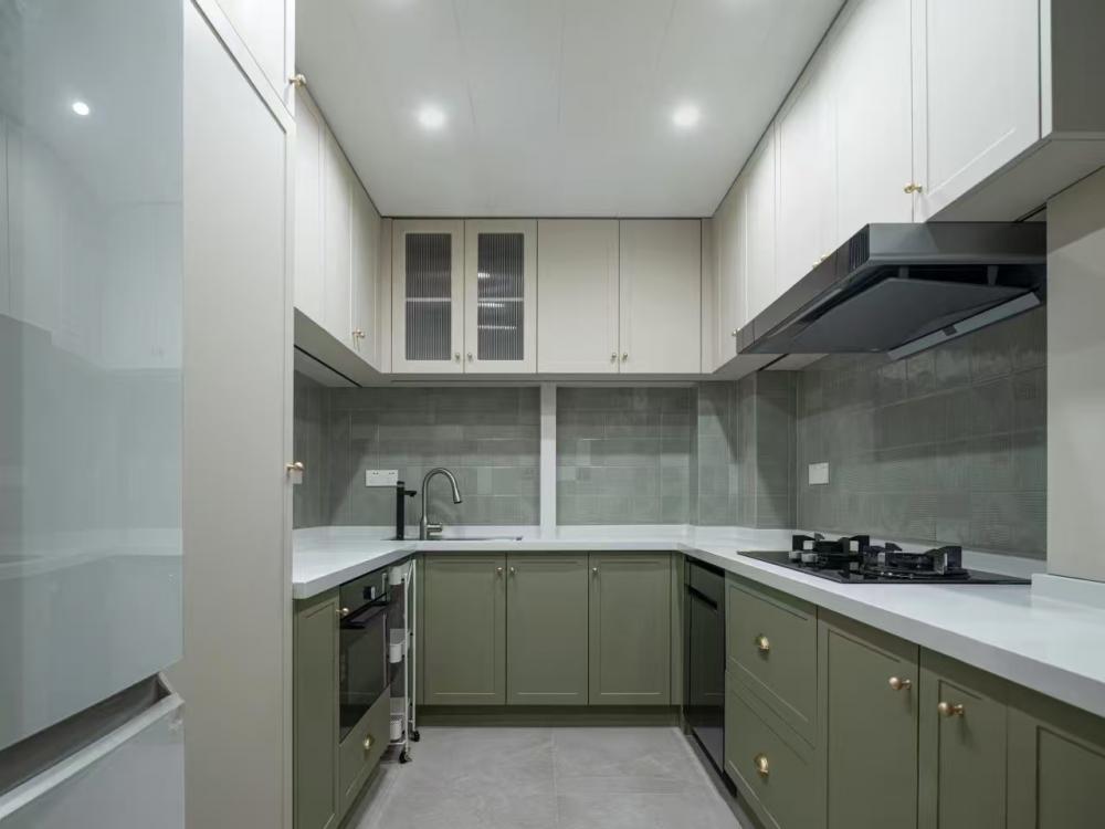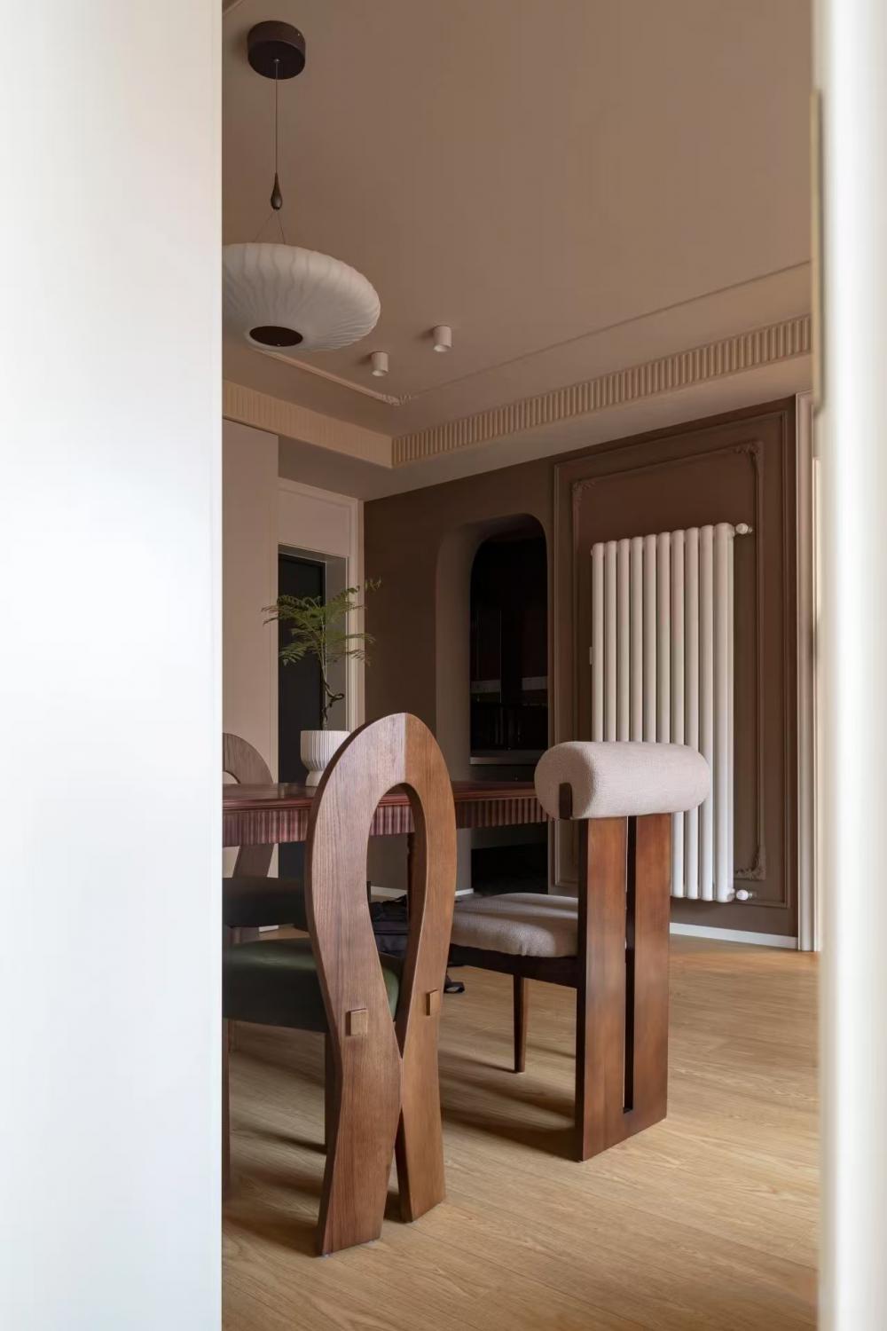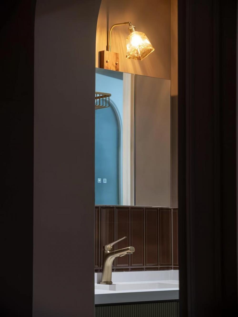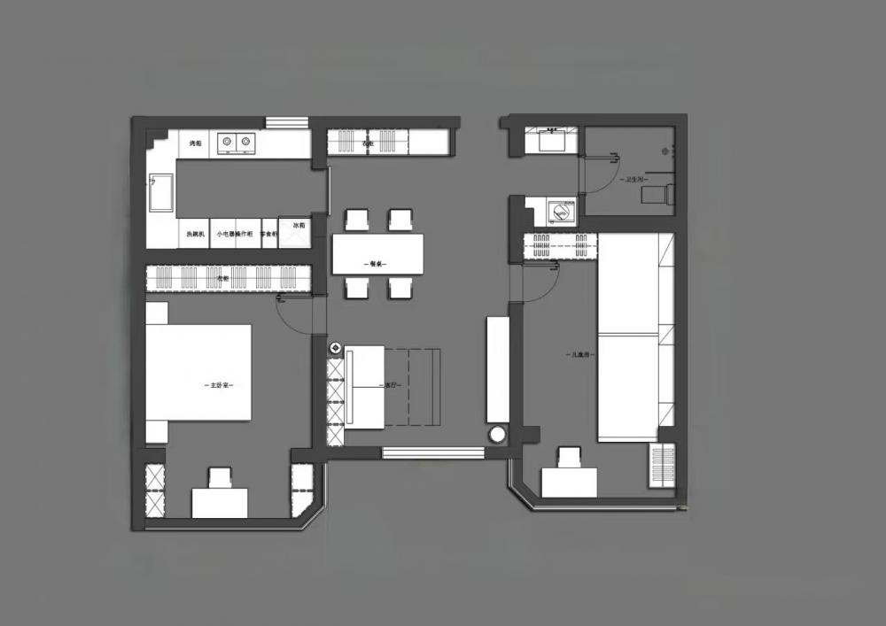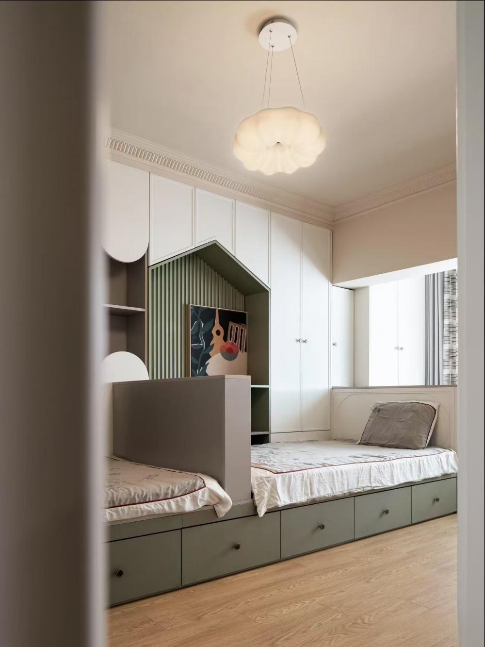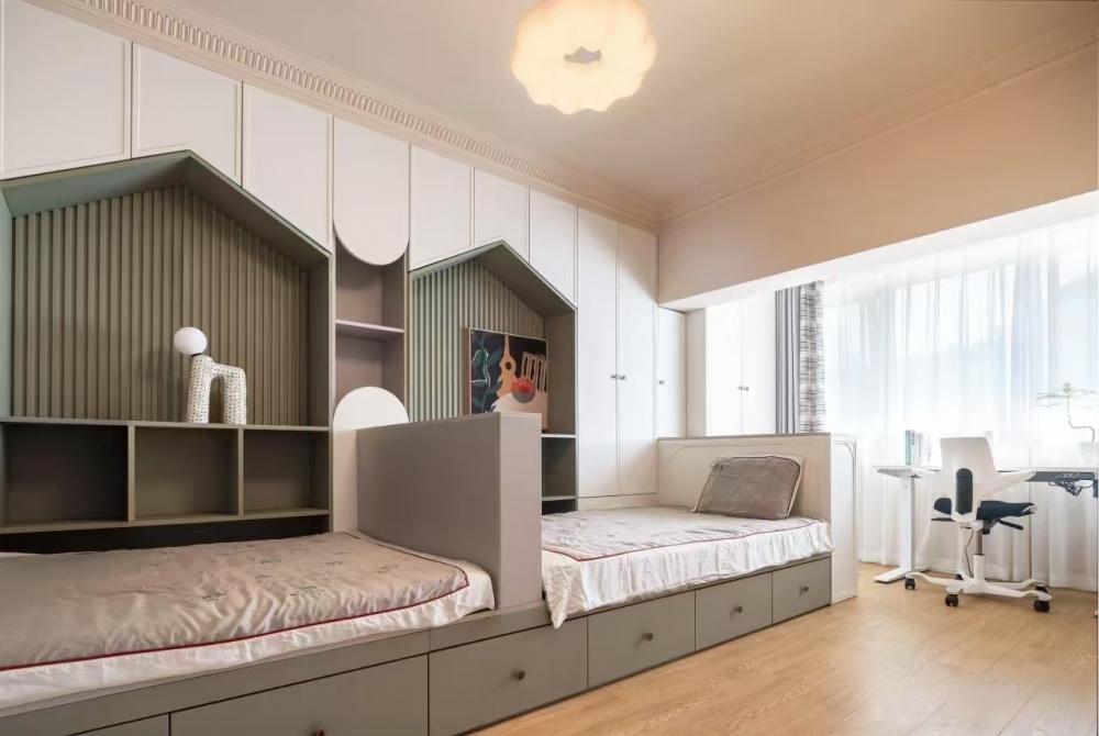 這是一套96㎡的學(xué)區(qū)房改造,業(yè)主家庭成員結(jié)構(gòu)是四口之家 衛(wèi)生間做了干濕分離,利用原次臥使與衛(wèi)生間較厚隔墻,將隔墻切薄,移動衛(wèi)生間門洞,將空間一分為二,北側(cè)為洗臉盆洗漱,南側(cè)為洗衣機(jī)、烘干機(jī)及收納柜。這樣早晨起床的時候可以避免家人搶廁所的情況,極大的節(jié)約了時間。 對廚房的原門洞進(jìn)行調(diào)整,這樣廚房南北兩側(cè)櫥柜可用實(shí)體墻隔開,避免漏櫥柜側(cè)板。同時廚房門洞外掛移門,不占用廚房內(nèi)部空間。女主早晨起床做飯時可以減少噪音,不影響孩子休息。 主次臥皆是將門洞南移,可將衣柜滿墻制作,擴(kuò)大收納空間;對于學(xué)區(qū)房來說寸土寸金,更多的收納空間可以存放孩子的各種用品,藏而不亂。主次臥都有書桌,業(yè)主想兩娃分開學(xué)習(xí)互不打擾。 去客廳化設(shè)計(jì)是業(yè)主一直秉承的家庭理念,無需預(yù)留電視機(jī),客廳不是那么重要的娛樂空間。在這個環(huán)境下,可以和孩子們一起互動,親子,做手辦等。 客廳不能拒絕的是沙發(fā)后排的收納柜,簡單而又超級使用,未來孩子獲得的榮譽(yù)獎杯,書籍刊物以及小小的工藝品,皆可放于此處。 餐廳家具選用了柚木質(zhì)感的中古風(fēng)家具,木制框架加軟包飾面不規(guī)則的造型設(shè)計(jì),處處都是設(shè)計(jì)細(xì)節(jié)的展現(xiàn)。 如果廚房門洞做推拉門太小做單開門又太擋空間該怎么辦呢?不妨試試上面的外掛移門,可以解決此類問題。 重色系臥室配色很容易讓人否定,擔(dān)心色調(diào)太重會導(dǎo)致心理上的不適,但是實(shí)際上重色是具有包裹感,給人營造沉靜穩(wěn)定的心態(tài)。 兒童房業(yè)主要求做雙床,為了極大的提高利用率,此房間采用定制床方案,兩個孩子在床上方都有自己的衣柜及玩具收納格。 廚房采用全烤漆飾面門板,單獨(dú)配的金色法式門把手。 衛(wèi)生間復(fù)古系的配色,將衛(wèi)生間打造成為小眾化衛(wèi)生間設(shè)計(jì),摒棄了常規(guī)300*600瓷磚的思維定式,也不同于大片瓷磚的一體性。要做的無非就是在細(xì)節(jié)中琢磨,在私彩中沉浸。