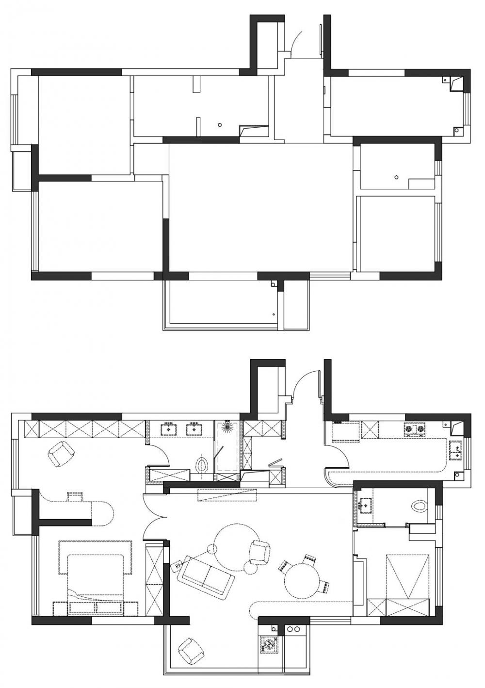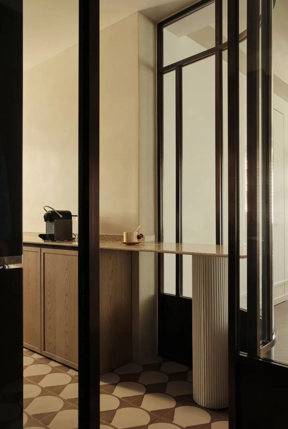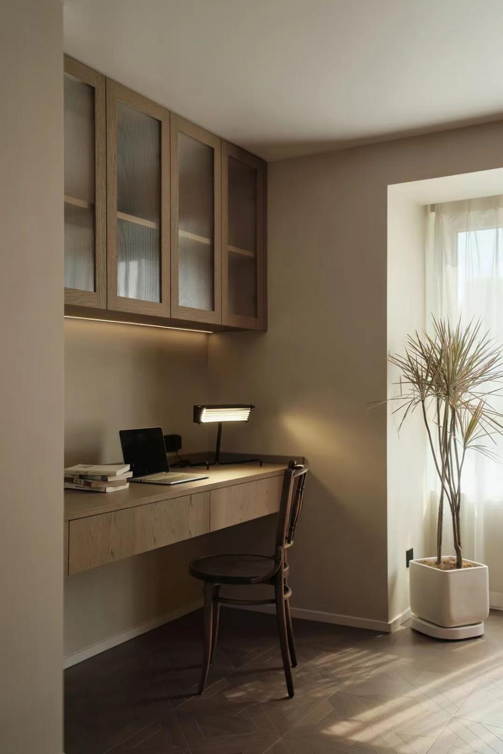 原戶型是比較中規(guī)中矩的剛需房結(jié)構(gòu), 119㎡三室兩廳一廚兩衛(wèi)。 優(yōu)點(diǎn)是空間利用率較高, 戶型方正且布局較為合理, 對(duì)于空間的需求不止于此, 追求通透感,喜歡豐富有趣的造型。 改造要點(diǎn)提示: 1、入戶區(qū)借用主衛(wèi)部分區(qū)域,打造步入式儲(chǔ)藏間,一站式解決鞋物收納; 2、三室改兩室,打通與主臥相連的次臥,形成一個(gè)寬敞舒適的酒店式套房,含衣帽間、書(shū)房、衛(wèi)生間; 3、客餐一體,布局隨性,空間寬敞愜意。 在打造咖啡屋般的復(fù)古氣質(zhì)之余, 所呈現(xiàn)的隨意慵懶感也是一大亮點(diǎn)- 餐廳卡座以及客廳的隨性布局, 處處體現(xiàn)著居家生活的精致愜意, 在這方不被打擾的小世界里, 可自在療愈,沉浸式放松與享受。