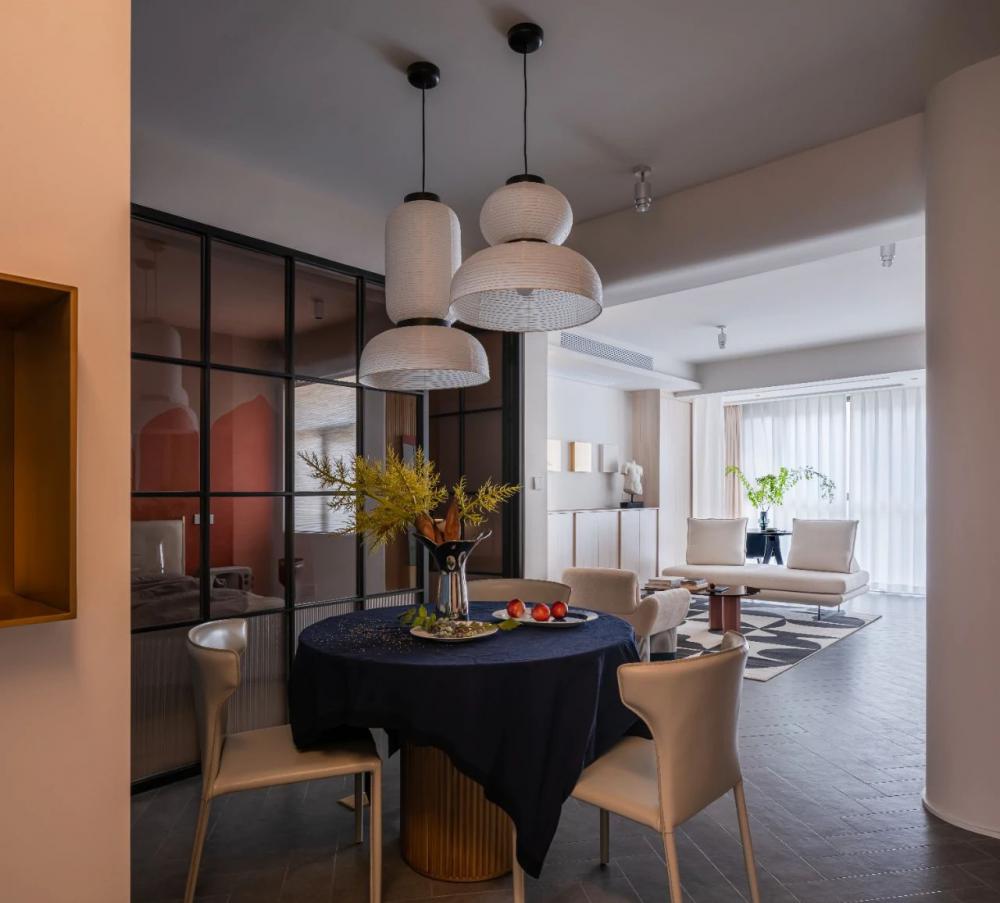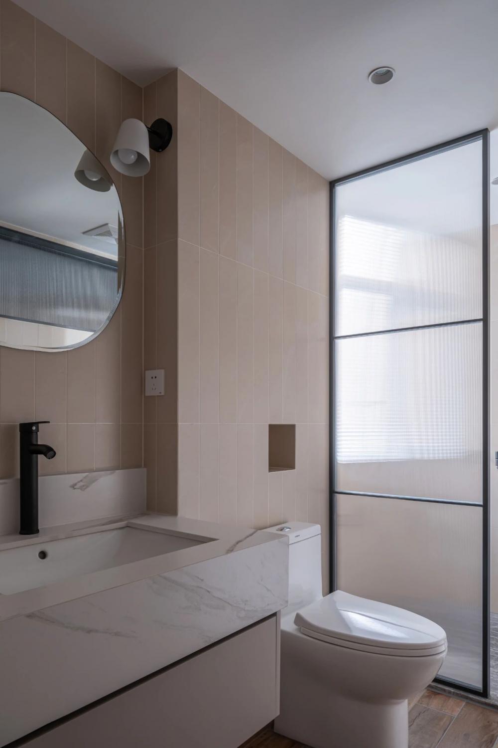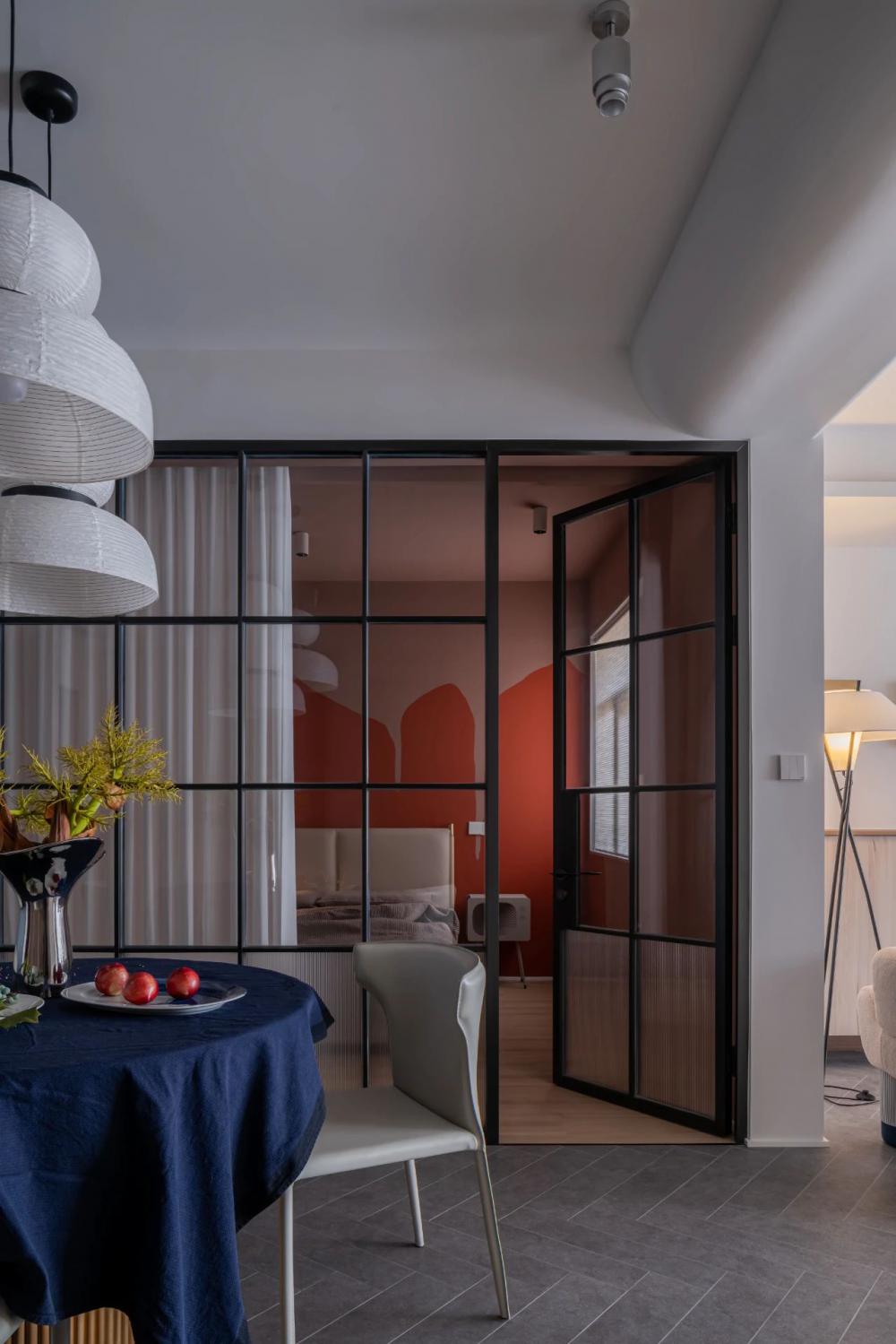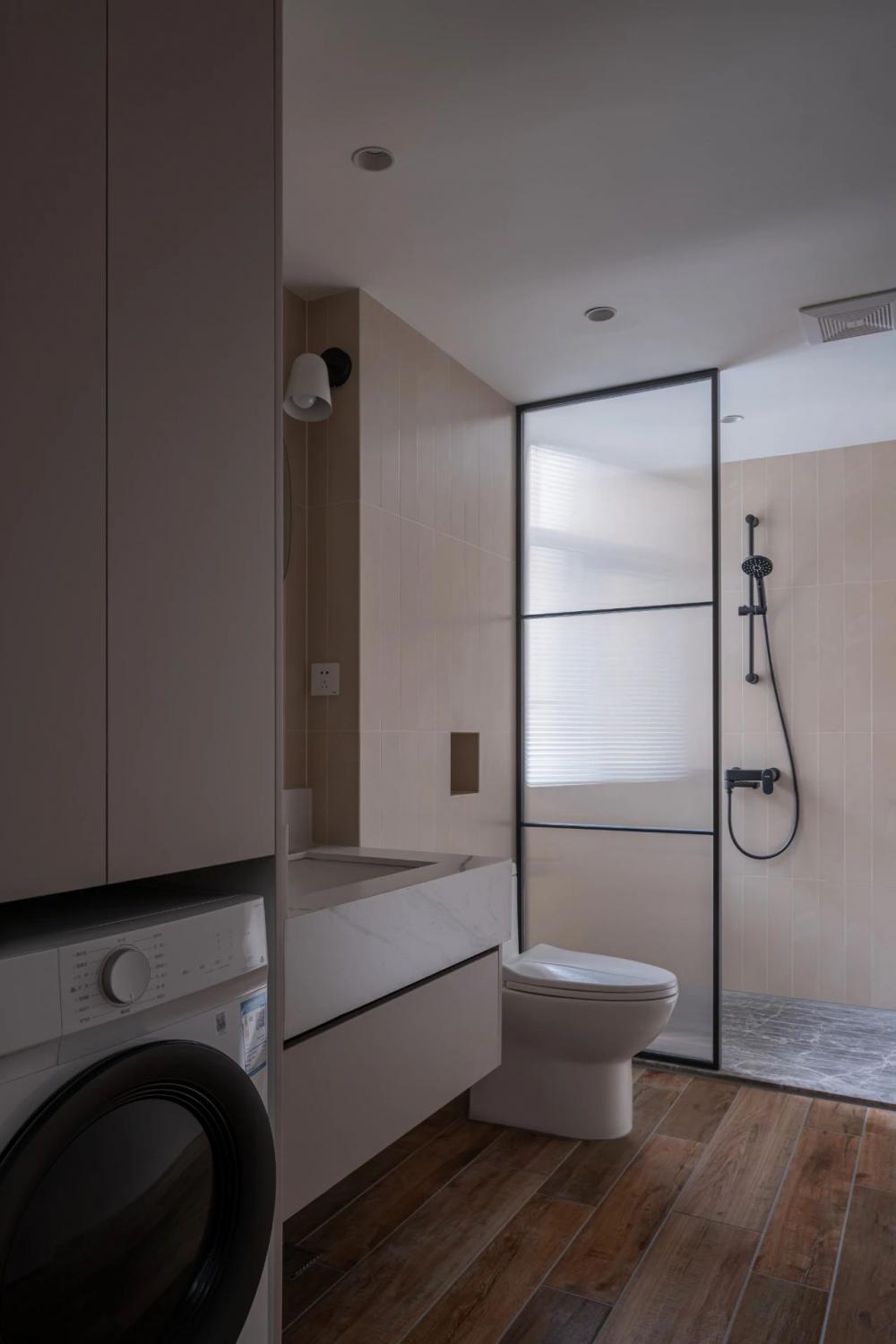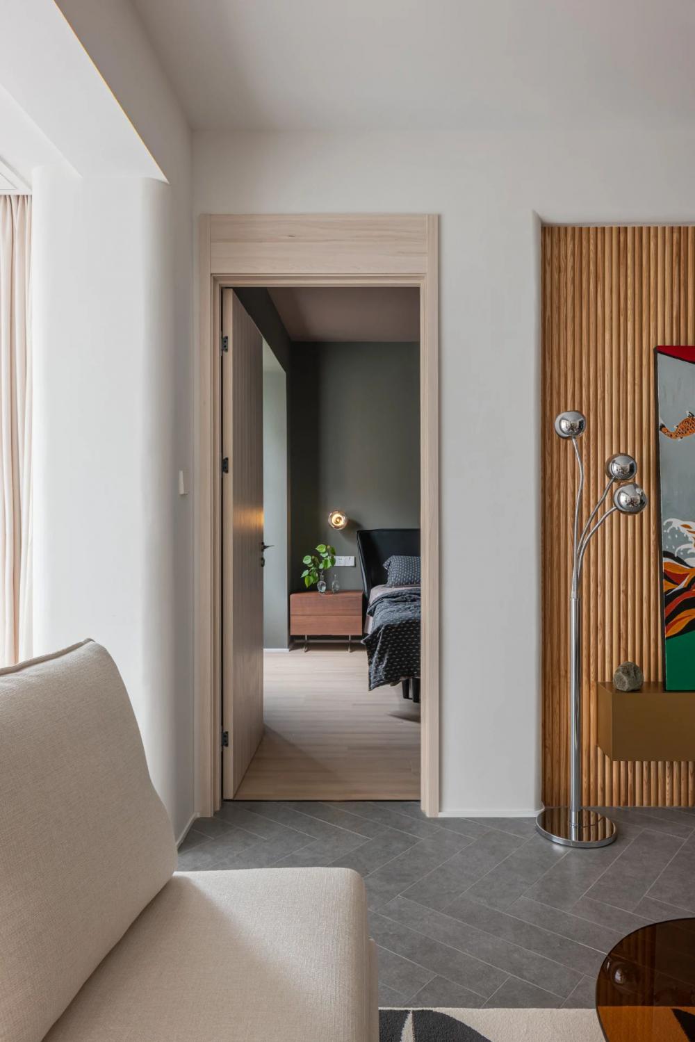 設(shè)計策略:1. 取消客廳陽臺并入到客廳,最大程度的滿足客廳區(qū)域的的空間尺度。2. 拆除次臥的墻體,改造成金屬框玻璃門+窗簾。3. 改變了主臥開門的位置,拉長了兩間臥室之間的距離感。4. 右移了衛(wèi)生間區(qū)域,把原始衛(wèi)生間干區(qū)的位置,給到了餐廳空間。5. 把原廚房的生活小陽臺給到了衛(wèi)生間,自此形成一個相對大尺度的衛(wèi)生間。 客廳合并了原獨立陽臺后,大尺幅落地窗把采光最大程度地引入室內(nèi)。 餐廳的背后(視線最左側(cè))是一組頂天立地的儲物柜,旁邊墻體嵌入了一個金屬盒,可以隨手放置鑰匙,手機,小包包等,功能與美學巧妙融合。 選用了兩種寬窄度的磚進行拼接來增加地面的細節(jié)感。全房踢腳線亦是采用了20mm的白色極窄實木腳線。 PS:地磚用原始600*600規(guī)格的正方形磚,加工成了120*600和150*600兩種規(guī)格的條形磚。 選用了兩種寬窄度的磚進行拼接來增加地面的細節(jié)感。全房踢腳線亦是采用了20mm的白色極窄實木腳線。 區(qū)別于傳統(tǒng)客廳沙發(fā)面對電視墻的布局手法,圍合式的客廳布局更符合當下青年群體在家聚會和情感交流的需求。 客廳左側(cè)的主墻面設(shè)置成一組儲物柜,充分滿足剛需戶型對于收納的需求,懸挑設(shè)計方便清潔。突出的旁板設(shè)計勇于打破常規(guī),增添細節(jié)感。 客廳減少了吊頂方面的工作,有限的吊頂結(jié)構(gòu)一是為了解決客廳風管機的放置,二是削弱梁體在客餐廳中間進門瞬間直指眼球的不適感。 墻面整潔有序地分布著的幾何體塊,呼應(yīng)玄關(guān)左側(cè)的金屬功能盒和電視墻的長條金屬電視柜,材質(zhì)沖突達到小小的構(gòu)件樂趣。 角落里的高腳落地燈安靜地散發(fā)著她的光芒,燈下的絨面沙發(fā)更顯柔軟。這一切的軟裝陳設(shè)都在素凈的基調(diào)下盡顯隨性自由的空間氛圍。 電視墻是客廳相對削弱的功能載體,濃郁的色彩與素雅的軟裝形成鮮明對比。 木制與金屬的交相輝映,棱角分明的金屬體塊與30mm半圓線條的有機融合。比起電視背景墻,我更愿意稱之為是客餐廳裝飾畫的小型陳列區(qū)。 餐廳和兒童房之間采用金屬框玻璃門+窗簾,既保證隱私性,又讓兩個空間緊密聯(lián)系了起來,互相擴充空間的視覺尺度,充當彼此的背景板。 主臥的門被分布在了客廳的另外一邊,縮短主臥和客廳距離的同時,擴大了主臥內(nèi)部的儲物容量,又能跟次臥保持更獨立的空間感受。 深色的臥室內(nèi)部和客廳的白凈形成鮮明對比,兩種不同的色系場域,表達著生活里兩種截然不同需求。 輕松兼規(guī)整感是衛(wèi)生間給我們的第一視覺印象,墻磚選用了一款米色的條形磚進行鋪貼,干區(qū)地面采用了不同規(guī)格尺度的木紋磚。 衛(wèi)生間整合了家政區(qū),洗漱、清洗臟衣,一氣呵成,動線更加便利。
