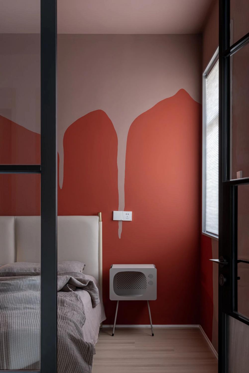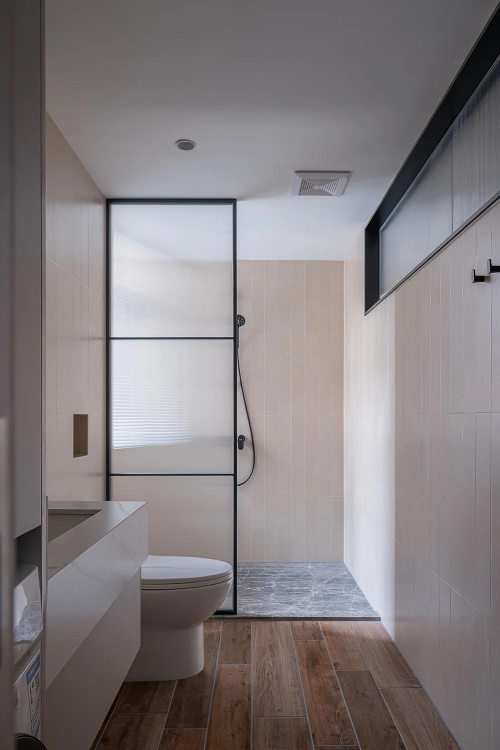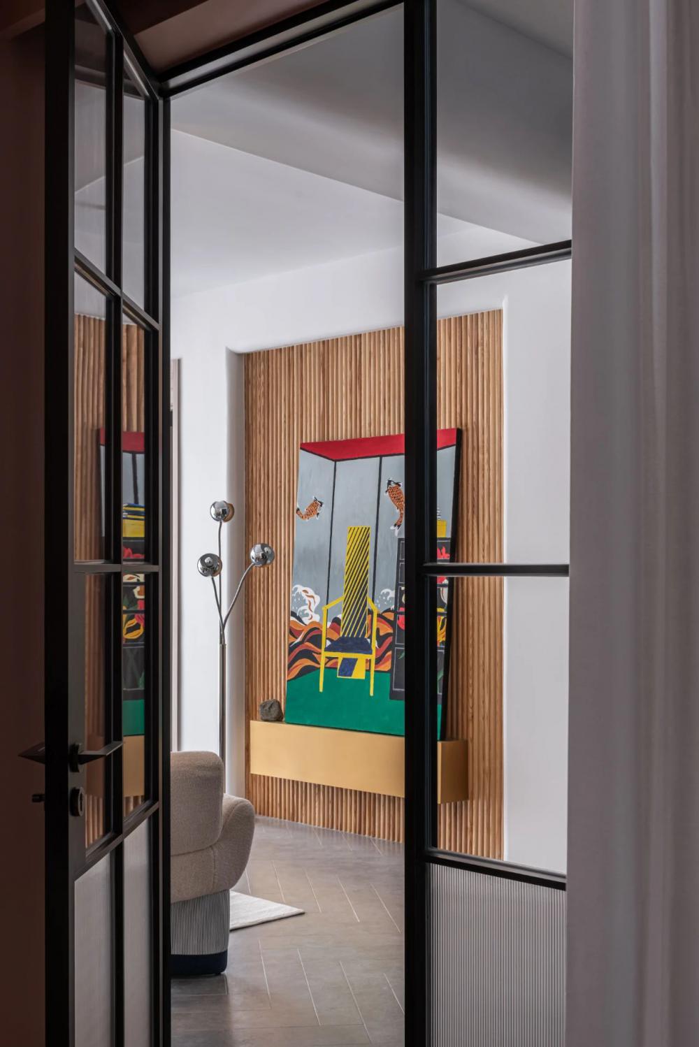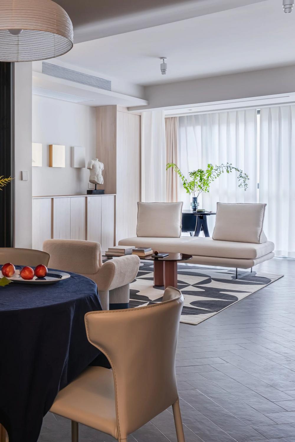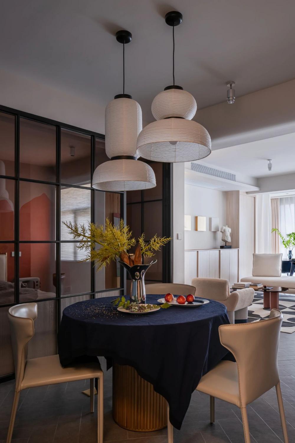 設(shè)計策略:1. 取消客廳陽臺并入到客廳,最大程度的滿足客廳區(qū)域的的空間尺度。2. 拆除次臥的墻體,改造成金屬框玻璃門+窗簾。3. 改變了主臥開門的位置,拉長了兩間臥室之間的距離感。4. 右移了衛(wèi)生間區(qū)域,把原始衛(wèi)生間干區(qū)的位置,給到了餐廳空間。5. 把原廚房的生活小陽臺給到了衛(wèi)生間,自此形成一個相對大尺度的衛(wèi)生間。 客廳合并了原獨立陽臺后,大尺幅落地窗把采光最大程度地引入室內(nèi)。 餐廳的背后(視線最左側(cè))是一組頂天立地的儲物柜,旁邊墻體嵌入了一個金屬盒,可以隨手放置鑰匙,手機,小包包等,功能與美學巧妙融合。 選用了兩種寬窄度的磚進行拼接來增加地面的細節(jié)感。全房踢腳線亦是采用了20mm的白色極窄實木腳線。 PS:地磚用原始600*600規(guī)格的正方形磚,加工成了120*600和150*600兩種規(guī)格的條形磚。 選用了兩種寬窄度的磚進行拼接來增加地面的細節(jié)感。全房踢腳線亦是采用了20mm的白色極窄實木腳線。 區(qū)別于傳統(tǒng)客廳沙發(fā)面對電視墻的布局手法,圍合式的客廳布局更符合當下青年群體在家聚會和情感交流的需求。 客廳左側(cè)的主墻面設(shè)置成一組儲物柜,充分滿足剛需戶型對于收納的需求,懸挑設(shè)計方便清潔。突出的旁板設(shè)計勇于打破常規(guī),增添細節(jié)感。 客廳減少了吊頂方面的工作,有限的吊頂結(jié)構(gòu)一是為了解決客廳風管機的放置,二是削弱梁體在客餐廳中間進門瞬間直指眼球的不適感。 墻面整潔有序地分布著的幾何體塊,呼應(yīng)玄關(guān)左側(cè)的金屬功能盒和電視墻的長條金屬電視柜,材質(zhì)沖突達到小小的構(gòu)件樂趣。 角落里的高腳落地燈安靜地散發(fā)著她的光芒,燈下的絨面沙發(fā)更顯柔軟。這一切的軟裝陳設(shè)都在素凈的基調(diào)下盡顯隨性自由的空間氛圍。 電視墻是客廳相對削弱的功能載體,濃郁的色彩與素雅的軟裝形成鮮明對比。 木制與金屬的交相輝映,棱角分明的金屬體塊與30mm半圓線條的有機融合。比起電視背景墻,我更愿意稱之為是客餐廳裝飾畫的小型陳列區(qū)。 餐廳和兒童房之間采用金屬框玻璃門+窗簾,既保證隱私性,又讓兩個空間緊密聯(lián)系了起來,互相擴充空間的視覺尺度,充當彼此的背景板。 主臥的門被分布在了客廳的另外一邊,縮短主臥和客廳距離的同時,擴大了主臥內(nèi)部的儲物容量,又能跟次臥保持更獨立的空間感受。 深色的臥室內(nèi)部和客廳的白凈形成鮮明對比,兩種不同的色系場域,表達著生活里兩種截然不同需求。 輕松兼規(guī)整感是衛(wèi)生間給我們的第一視覺印象,墻磚選用了一款米色的條形磚進行鋪貼,干區(qū)地面采用了不同規(guī)格尺度的木紋磚。 衛(wèi)生間整合了家政區(qū),洗漱、清洗臟衣,一氣呵成,動線更加便利。
