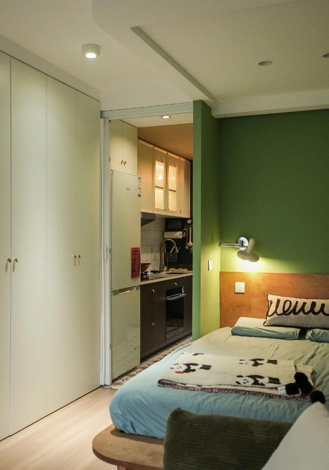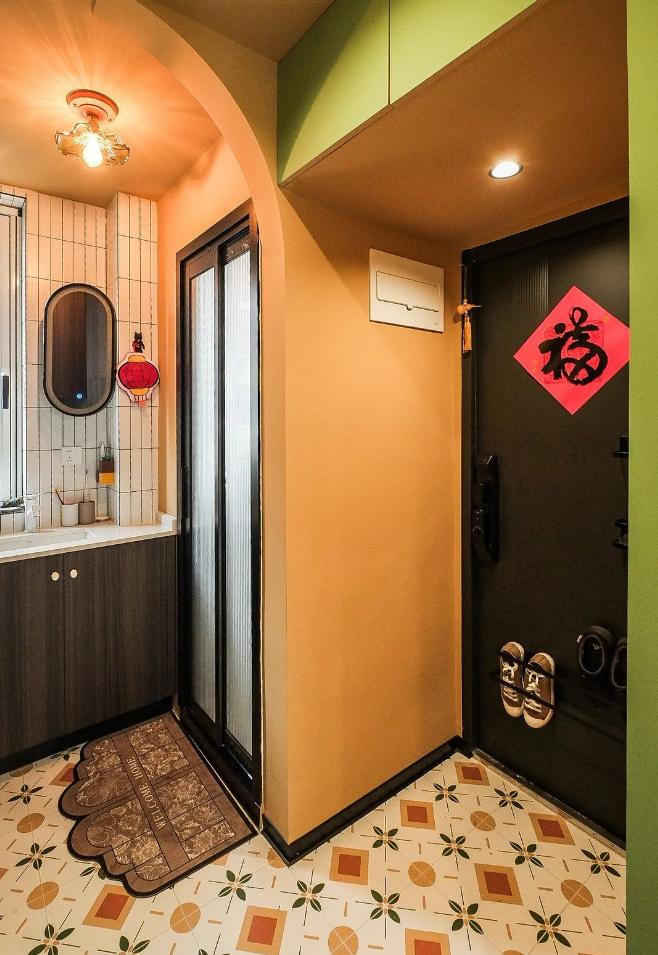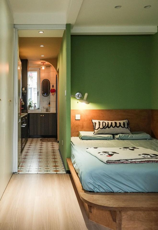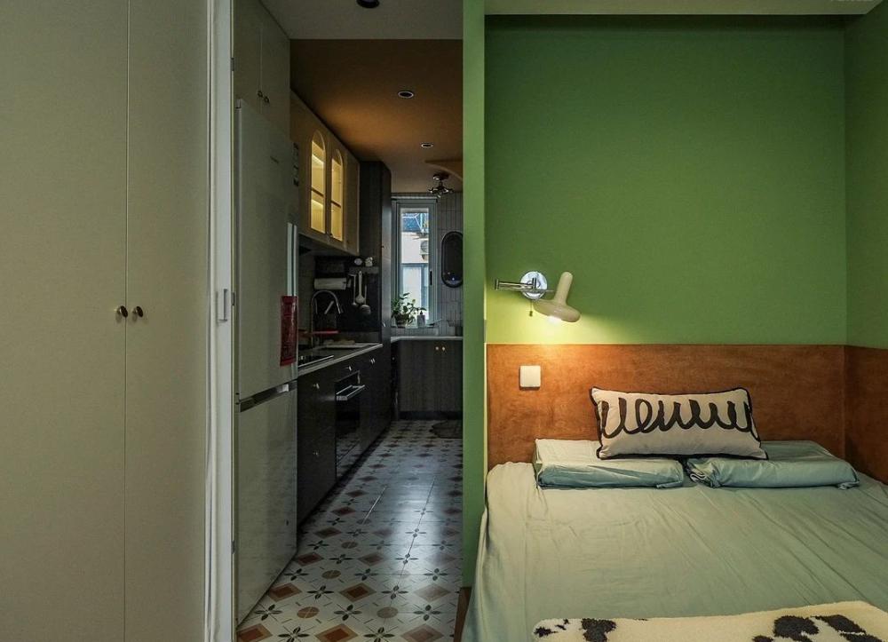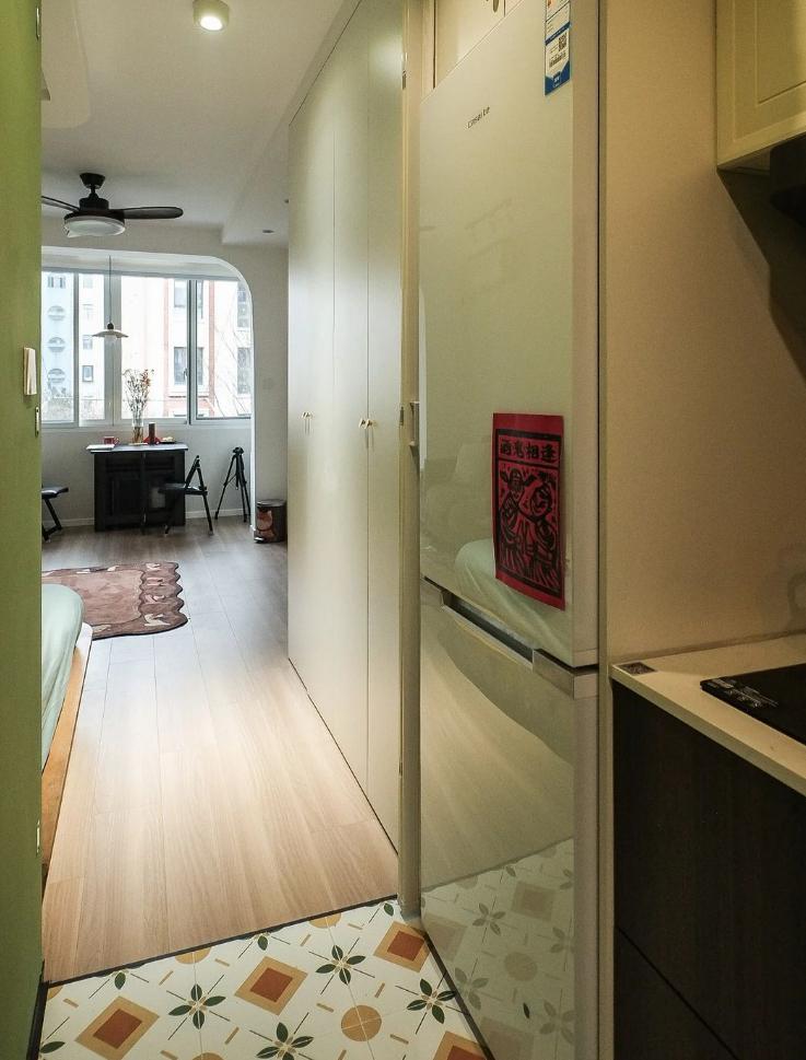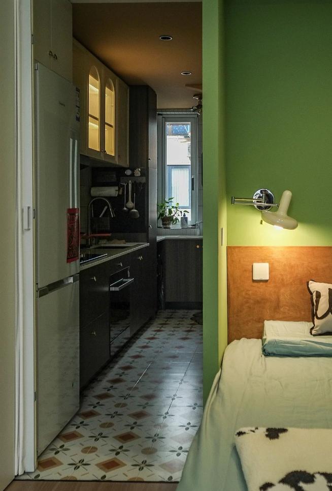 很難想象,這樣愜意松弛的生活,竟來自于一間27平的老破小,空間很極限,但生活卻一點也不將就,當(dāng)走進(jìn)這個靈動自由的小家,常常讓人感嘆,“這也太舒適了吧~” 小小的玄關(guān)沒有辦法承載太多的功能,設(shè)計師將常用鞋子的收納空間,放在了過道的右側(cè)。并增加通頂?shù)母吖瘢蟠笤黾恿耸占{的空間。 廚房和衛(wèi)生間被安排在整個房子的北側(cè),地面鋪上復(fù)古風(fēng)情的小花磚,并用呼應(yīng)地磚的橙色和綠色大面積涂刷這個空間,讓原本會顯得閉塞狹小的空間變得生動有意思起來,讓人不禁忽視空間小的缺點。 為了適應(yīng)小戶型的需求,廚房選用了深度60公分的冰箱,并結(jié)合定制柜,消除了衛(wèi)生死角,使整體視覺更加干凈整潔。此外,冰箱一側(cè)與衣柜之間預(yù)留了10公分的寬度,隱藏了一個折疊隔斷,有效避免了廚房油煙進(jìn)入客餐廳。 原來衛(wèi)生間的門開在了入戶大門的右側(cè),這讓門口變得格外擁堵,同時來客人一眼就會看到衛(wèi)生間內(nèi)部,因此設(shè)計師把門更換到了過道一側(cè),從而提升了整體的居住體驗。 在衛(wèi)生間的設(shè)計上,設(shè)計師沒有擴(kuò)大其面積,而是通過將臺盆放置在北側(cè)窗前,實現(xiàn)了干濕分離。盡管受到尺寸限制,洗手池被定制成深度40公分,小巧但實用,滿足了日常洗漱需求。 在客餐廳和臥室的布置上,設(shè)計師與屋主達(dá)成了一致,圍繞“讓空間中有更多自由活動的地方”的大方向,床的位置被安排在房子一側(cè)角落。并安裝上可以上翻的液壓桿床架,解決了床單被罩等大件物品的收納問題,讓衣柜的衣物收納更加豐富充裕。 雖然設(shè)計師最初設(shè)計了臥室地臺床位置的軟性隔斷,但屋主覺得不設(shè)隔斷能讓客餐廳看起來更加寬敞,于是選擇了更為開闊的設(shè)計。設(shè)計師充分尊重屋主的選擇,使得整個空間更加符合屋主的生活需求。