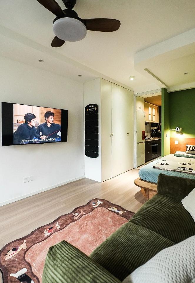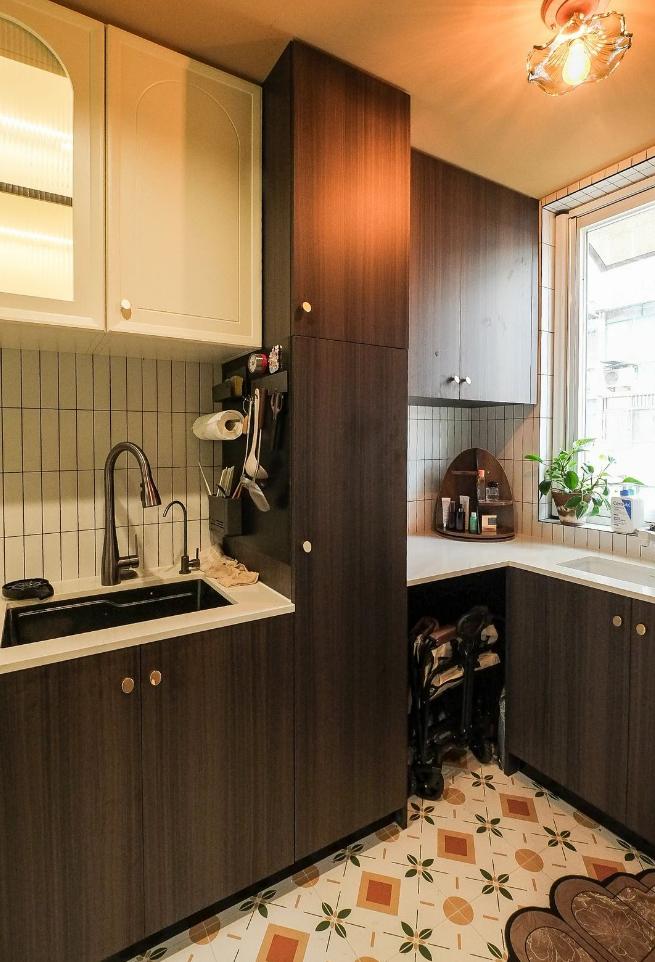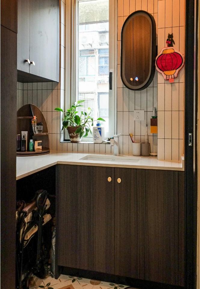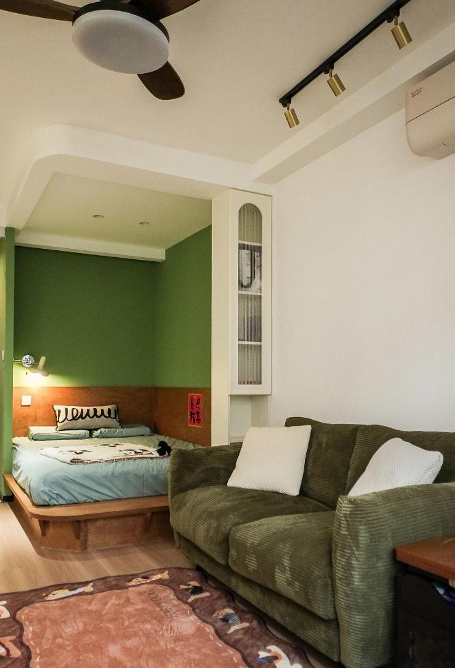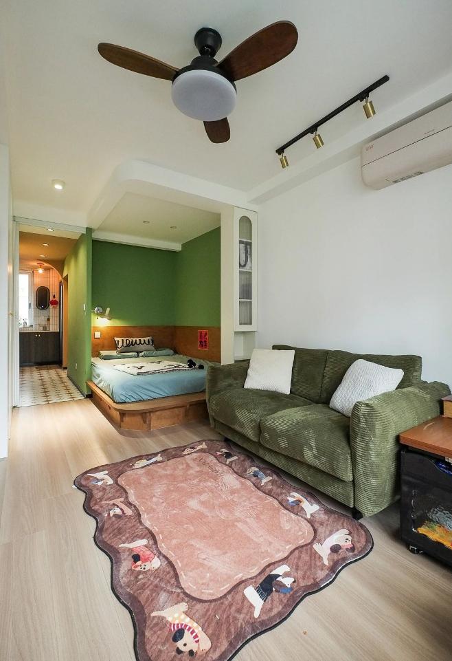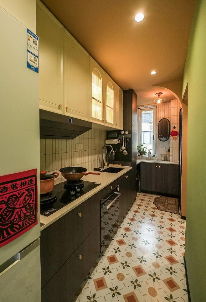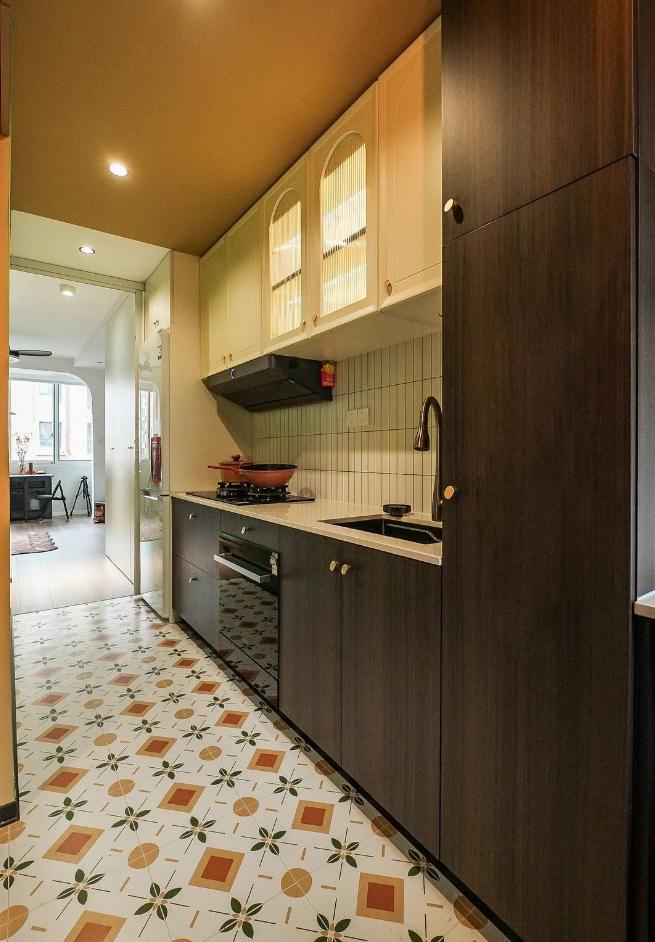很難想象,這樣愜意松弛的生活,竟來自于一間27平的老破小,空間很極限,但生活卻一點也不將就,當(dāng)走進(jìn)這個靈動自由的小家,常常讓人感嘆,“這也太舒適了吧~” 小小的玄關(guān)沒有辦法承載太多的功能,設(shè)計師將常用鞋子的收納空間,放在了過道的右側(cè)。并增加通頂?shù)母吖瘢蟠笤黾恿耸占{的空間。 廚房和衛(wèi)生間被安排在整個房子的北側(cè),地面鋪上復(fù)古風(fēng)情的小花磚,并用呼應(yīng)地磚的橙色和綠色大面積涂刷這個空間,讓原本會顯得閉塞狹小的空間變得生動有意思起來,讓人不禁忽視空間小的缺點。 為了適應(yīng)小戶型的需求,廚房選用了深度60公分的冰箱,并結(jié)合定制柜,消除了衛(wèi)生死角,使整體視覺更加干凈整潔。此外,冰箱一側(cè)與衣柜之間預(yù)留了10公分的寬度,隱藏了一個折疊隔斷,有效避免了廚房油煙進(jìn)入客餐廳。 原來衛(wèi)生間的門開在了入戶大門的右側(cè),這讓門口變得格外擁堵,同時來客人一眼就會看到衛(wèi)生間內(nèi)部,因此設(shè)計師把門更換到了過道一側(cè),從而提升了整體的居住體驗。 在衛(wèi)生間的設(shè)計上,設(shè)計師沒有擴(kuò)大其面積,而是通過將臺盆放置在北側(cè)窗前,實現(xiàn)了干濕分離。盡管受到尺寸限制,洗手池被定制成深度40公分,小巧但實用,滿足了日常洗漱需求。 在客餐廳和臥室的布置上,設(shè)計師與屋主達(dá)成了一致,圍繞“讓空間中有更多自由活動的地方”的大方向,床的位置被安排在房子一側(cè)角落。并安裝上可以上翻的液壓桿床架,解決了床單被罩等大件物品的收納問題,讓衣柜的衣物收納更加豐富充裕。 雖然設(shè)計師最初設(shè)計了臥室地臺床位置的軟性隔斷,但屋主覺得不設(shè)隔斷能讓客餐廳看起來更加寬敞,于是選擇了更為開闊的設(shè)計。設(shè)計師充分尊重屋主的選擇,使得整個空間更加符合屋主的生活需求。