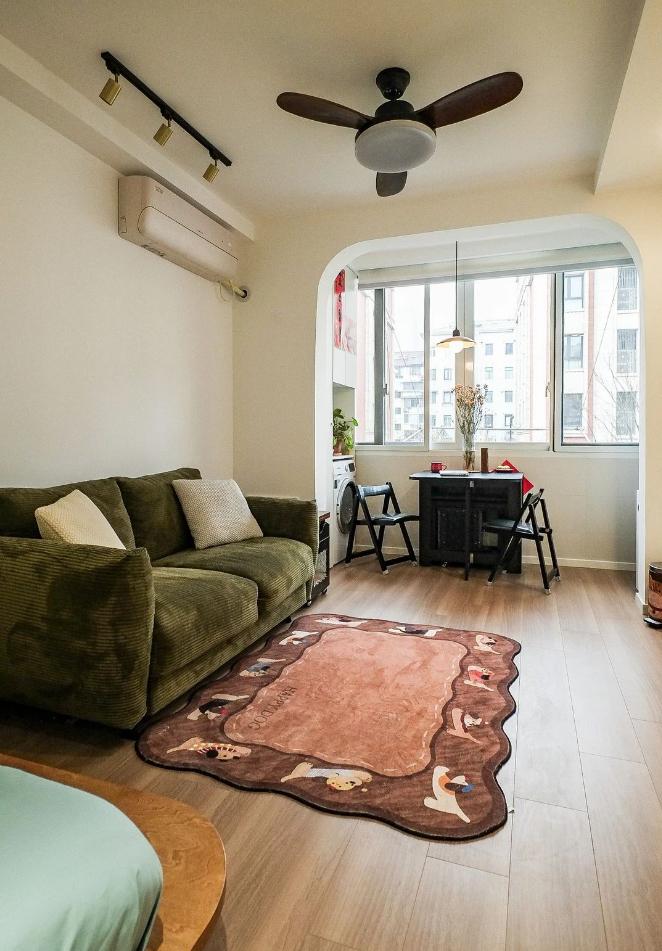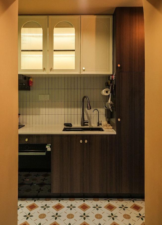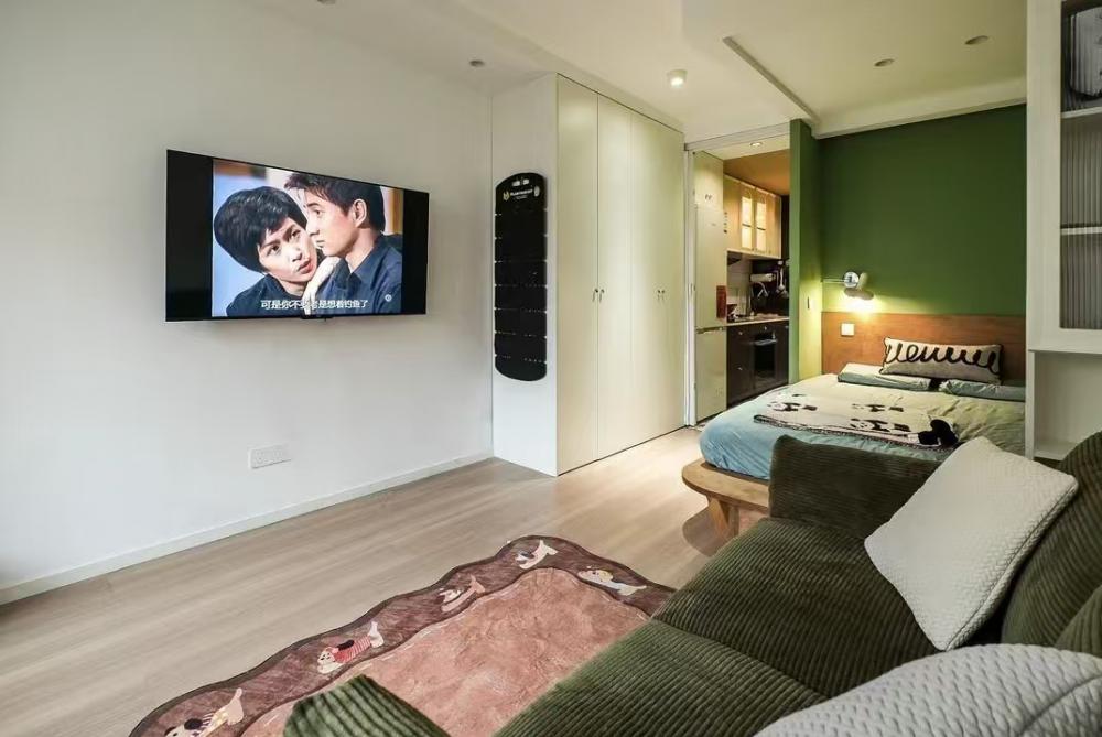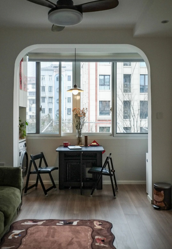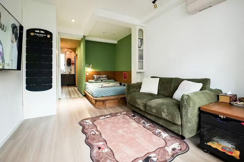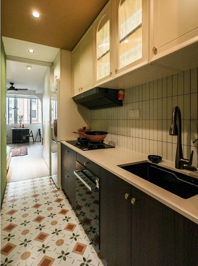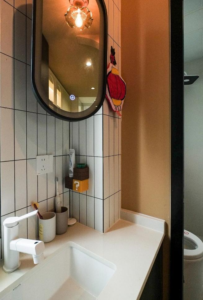 很難想象,這樣愜意松弛的生活,竟來自于一間27平的老破小,空間很極限,但生活卻一點也不將就,當(dāng)走進(jìn)這個靈動自由的小家,常常讓人感嘆,“這也太舒適了吧~” 小小的玄關(guān)沒有辦法承載太多的功能,設(shè)計師將常用鞋子的收納空間,放在了過道的右側(cè)。并增加通頂?shù)母吖瘢蟠笤黾恿耸占{的空間。 廚房和衛(wèi)生間被安排在整個房子的北側(cè),地面鋪上復(fù)古風(fēng)情的小花磚,并用呼應(yīng)地磚的橙色和綠色大面積涂刷這個空間,讓原本會顯得閉塞狹小的空間變得生動有意思起來,讓人不禁忽視空間小的缺點。 為了適應(yīng)小戶型的需求,廚房選用了深度60公分的冰箱,并結(jié)合定制柜,消除了衛(wèi)生死角,使整體視覺更加干凈整潔。此外,冰箱一側(cè)與衣柜之間預(yù)留了10公分的寬度,隱藏了一個折疊隔斷,有效避免了廚房油煙進(jìn)入客餐廳。 原來衛(wèi)生間的門開在了入戶大門的右側(cè),這讓門口變得格外擁堵,同時來客人一眼就會看到衛(wèi)生間內(nèi)部,因此設(shè)計師把門更換到了過道一側(cè),從而提升了整體的居住體驗。 在衛(wèi)生間的設(shè)計上,設(shè)計師沒有擴(kuò)大其面積,而是通過將臺盆放置在北側(cè)窗前,實現(xiàn)了干濕分離。盡管受到尺寸限制,洗手池被定制成深度40公分,小巧但實用,滿足了日常洗漱需求。 在客餐廳和臥室的布置上,設(shè)計師與屋主達(dá)成了一致,圍繞“讓空間中有更多自由活動的地方”的大方向,床的位置被安排在房子一側(cè)角落。并安裝上可以上翻的液壓桿床架,解決了床單被罩等大件物品的收納問題,讓衣柜的衣物收納更加豐富充裕。 雖然設(shè)計師最初設(shè)計了臥室地臺床位置的軟性隔斷,但屋主覺得不設(shè)隔斷能讓客餐廳看起來更加寬敞,于是選擇了更為開闊的設(shè)計。設(shè)計師充分尊重屋主的選擇,使得整個空間更加符合屋主的生活需求。