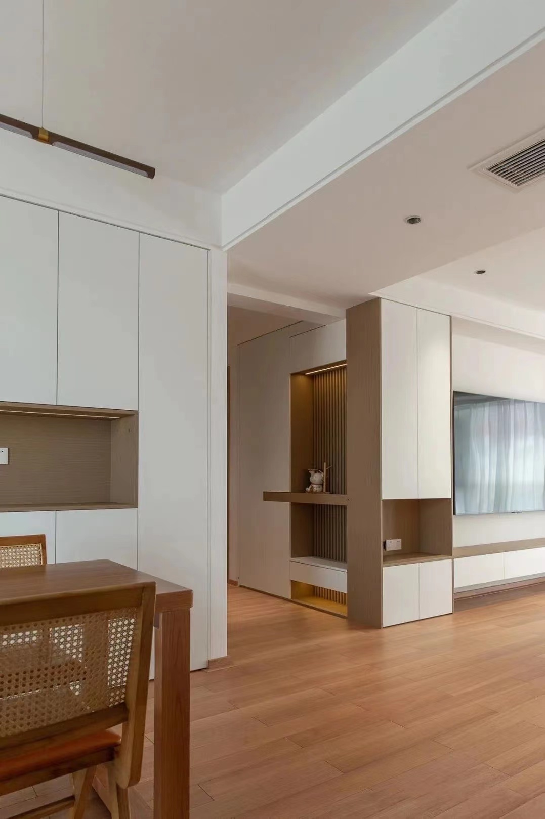 客廳:整體以木色+白色的色系搭配,無(wú)主燈設(shè)計(jì)提升空間層高,讓整體更加通透,通過(guò)簡(jiǎn)潔的軟硬裝布置,呈現(xiàn)出簡(jiǎn)約舒適的空間氛圍。