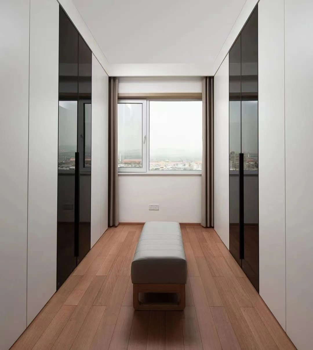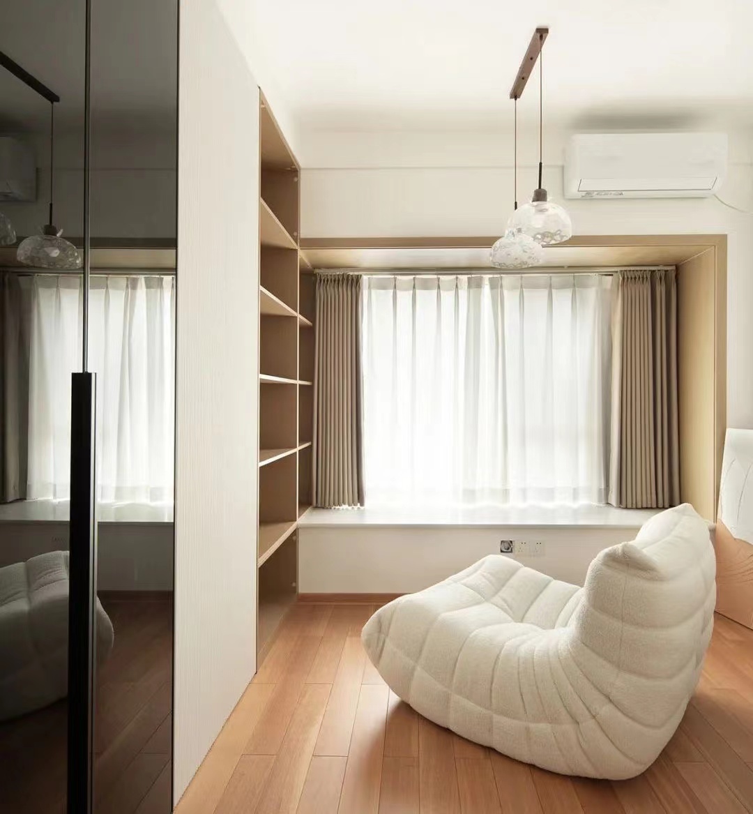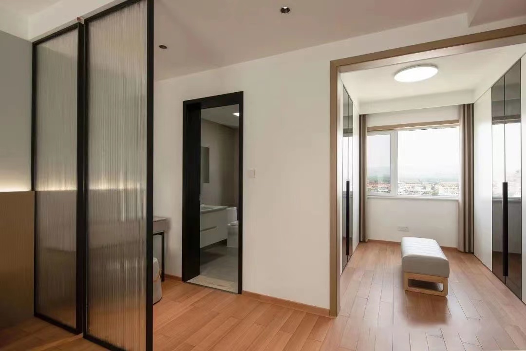 主臥:延續(xù)整屋格調(diào),靠近主衛(wèi)入口處設(shè)置梳妝區(qū),與睡眠區(qū)之間安裝長(zhǎng)虹玻璃隔斷,兼具透光性和美觀性。