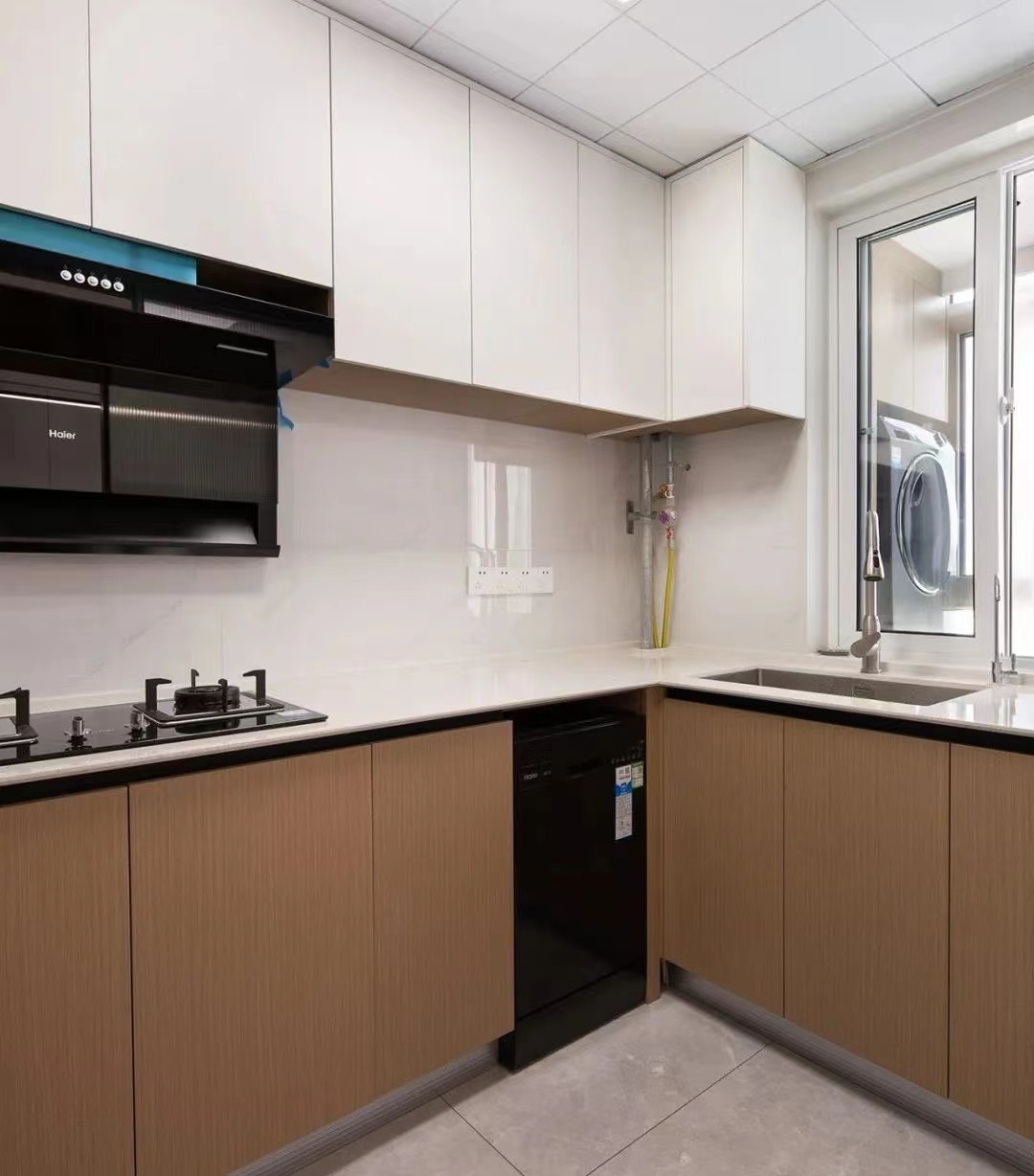 廚房:廚房是小型的L型布局,白色的吊柜+原木色地柜組合,操作動(dòng)線合理,根據(jù)洗菜、備菜、煮菜、裝盤的做飯順序布局。