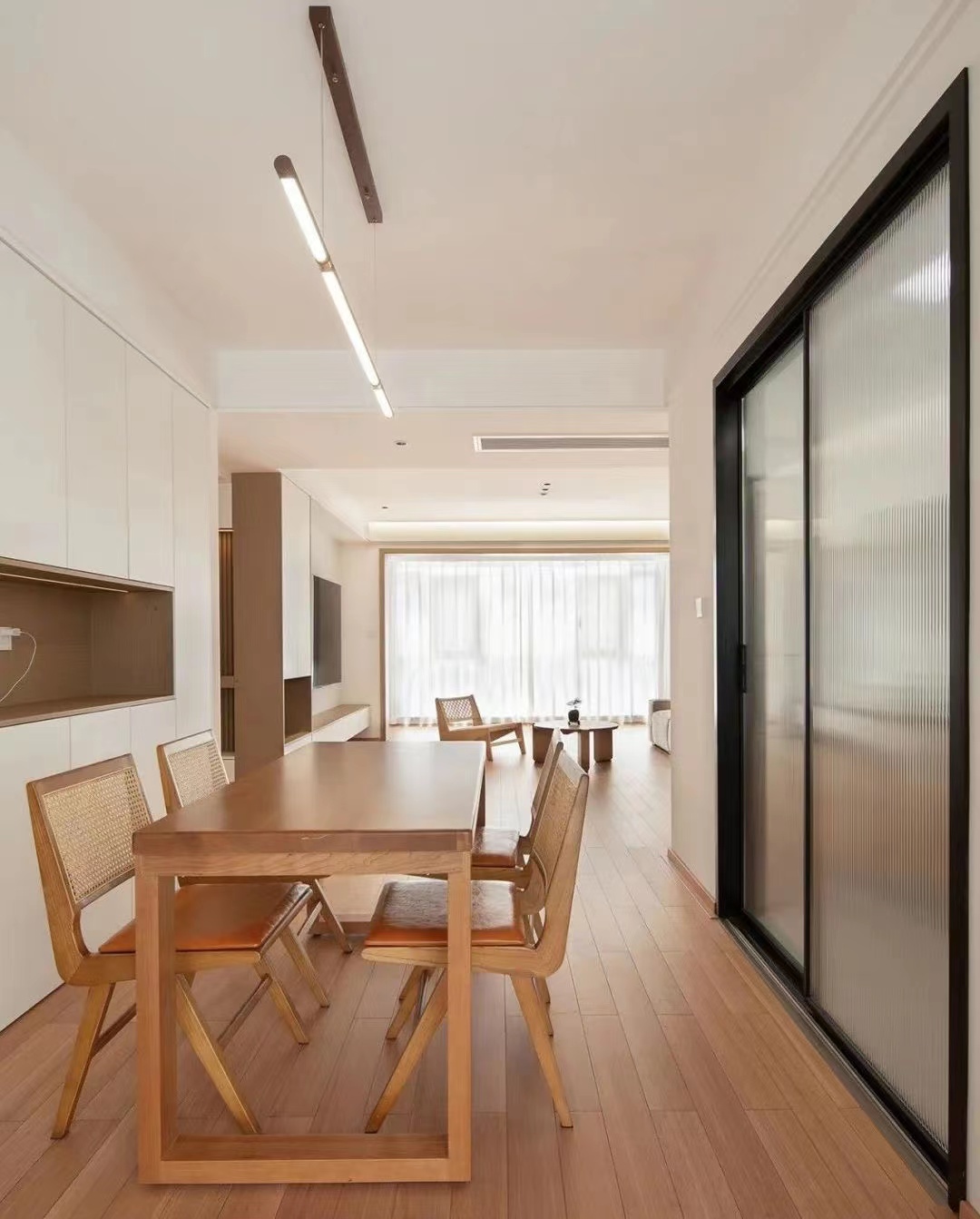 餐廳:餐廳,餐桌椅搭配選擇原木風(fēng),一張?jiān)痉阶?四把單椅擺放,呈現(xiàn)出自然材質(zhì)的溫潤(rùn),右側(cè)長(zhǎng)虹玻璃移門后是廚房空間,區(qū)域分明。