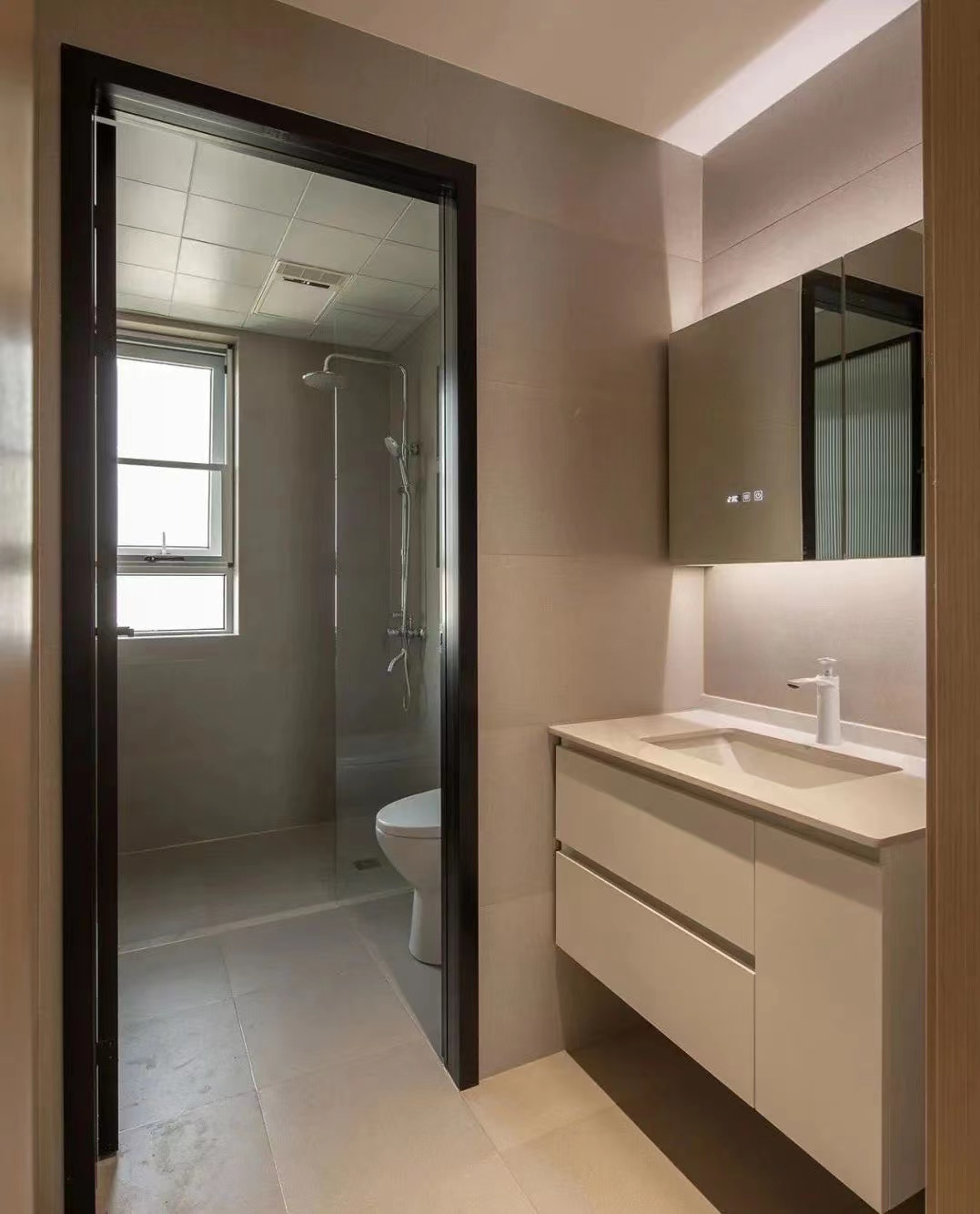 客衛(wèi);三分離的空間結(jié)構(gòu)設(shè)計(jì),讓淋浴區(qū)、馬桶間、洗漱區(qū)各自獨(dú)立,將干區(qū)外置,定制極簡(jiǎn)白色臺(tái)盆柜+鏡柜,提高生活效率。
