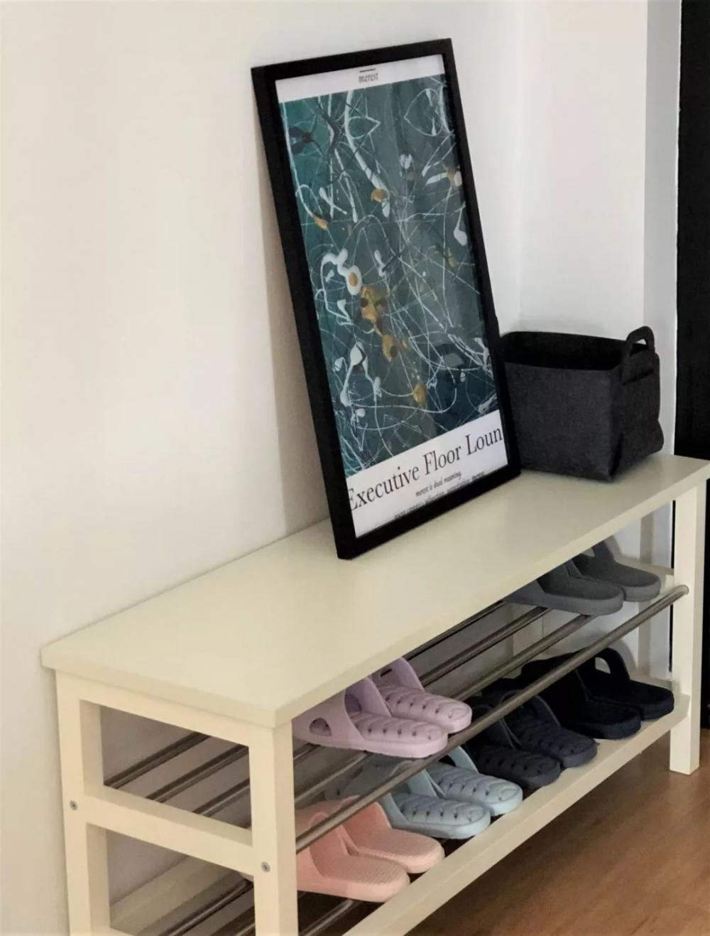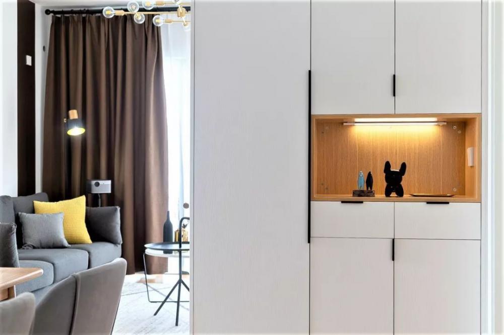 本案是一套面積為77平米的舊房改造案例,對(duì)于家,業(yè)主的期待是簡(jiǎn)單干凈,有需要過多的裝飾,有大大的廚房,可以享受美食,有獨(dú)立的書房。 設(shè)計(jì)師根據(jù)業(yè)主需求做了以下改造:封閉主臥陽臺(tái),改為書房,不做固定書柜,將來有了孩子書桌挪至次臥,書柜挪至電視柜旁當(dāng)陳列柜;開放式廚房,大冰箱挪到餐桌旁,1.5m餐桌滿足聚餐需求;去除吊頂,色調(diào)以原木白色為主,榻榻米抬高,兼顧儲(chǔ)藏功能,一面玄關(guān)柜,分割客餐廳空間。 設(shè)計(jì)師用組合型玄關(guān)&儲(chǔ)物柜,將原來的大開間,劃分為客廳、餐廳兩個(gè)獨(dú)立空間,既增加全屋收納,視覺上也有一定遮擋。玄關(guān)的感應(yīng)燈,晚上回家不必抹黑。 入戶門邊設(shè)置換鞋凳,下面是兩層鞋架,放放居家拖鞋和一些常穿的鞋。 客廳的家具都是非常簡(jiǎn)潔輕便的款式,深灰色的布藝沙發(fā),低調(diào)樸實(shí),明黃色的抱枕做為點(diǎn)綴,增添空間的活力。 電視墻留白,用作投影,閑暇時(shí)光,可以坐在沙發(fā)上看大屏電影。同時(shí)也保留了電視機(jī)插座和接口,以后要裝電視也很方便。 客廳外的休閑陽臺(tái),夏日可乘涼,冬日可曬太陽。 餐廚開放式設(shè)計(jì),新砌了70cm的短墻,將冰箱與餐邊柜移到外面,使用更方便,也能滿足多人聚餐的需求。 原木餐桌、原木餐邊柜,點(diǎn)綴清新綠植,自然溫馨。精致小物件,增添生活的趣味性。 喜歡做飯的業(yè)主,家里的瓶瓶罐罐、工具容器較多,因此廚房設(shè)計(jì)尤為重要,多儲(chǔ)物,使用方便是重點(diǎn)。高低臺(tái)的設(shè)計(jì),增加了操作的便利性。清新白格磚+橡木色櫥柜,整個(gè)廚房干凈、整潔、明亮。 主臥面積較大,定做了2.1m的大衣柜,內(nèi)部結(jié)構(gòu)也是根據(jù)業(yè)主對(duì)物品的收納需求進(jìn)行設(shè)計(jì)的,各種衣物都收納于此。藍(lán)色背景與灰色窗簾、床品的搭配,優(yōu)雅寧靜。 次臥定制了榻榻米,最外側(cè)的三個(gè)抽屜,收納常用的物品,床墊下面的柜格,儲(chǔ)藏更換頻次較低的換季被子、毯子等。 實(shí)用型衛(wèi)生間,利用鏡柜增加收納,旁邊的開放柜格,隨手放放護(hù)膚品、口杯等。抽拉式可360°旋轉(zhuǎn)的水龍頭,漱口、洗頭、清潔臺(tái)面,非常方便。