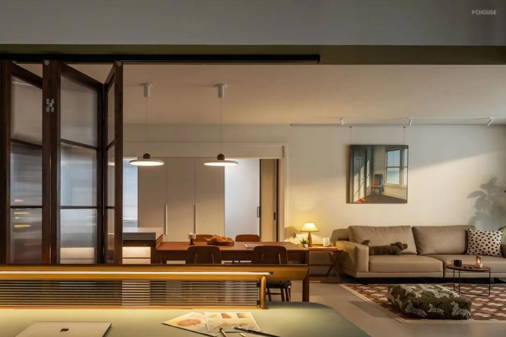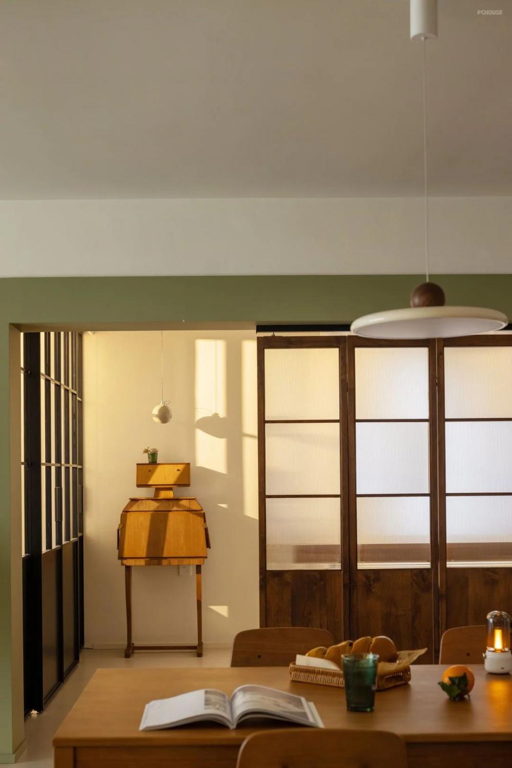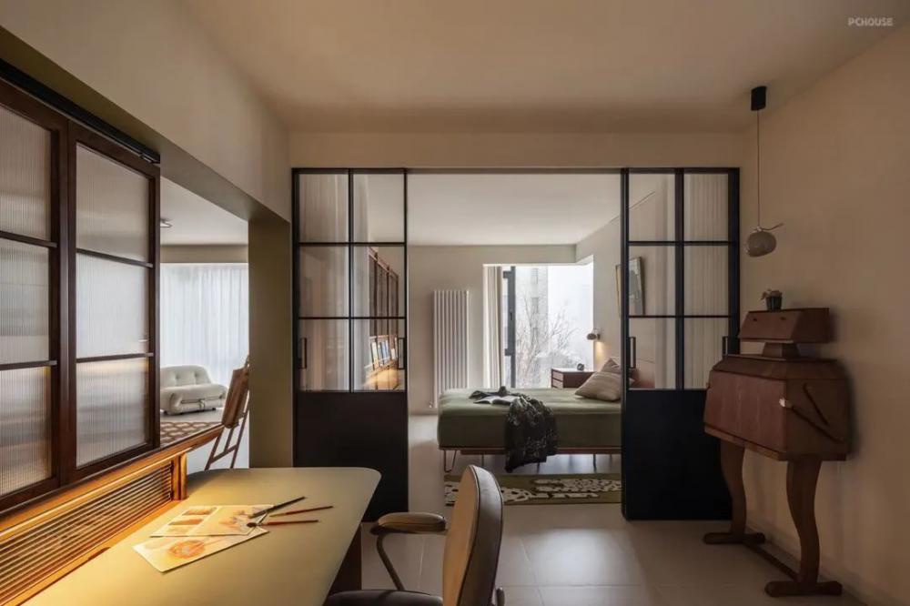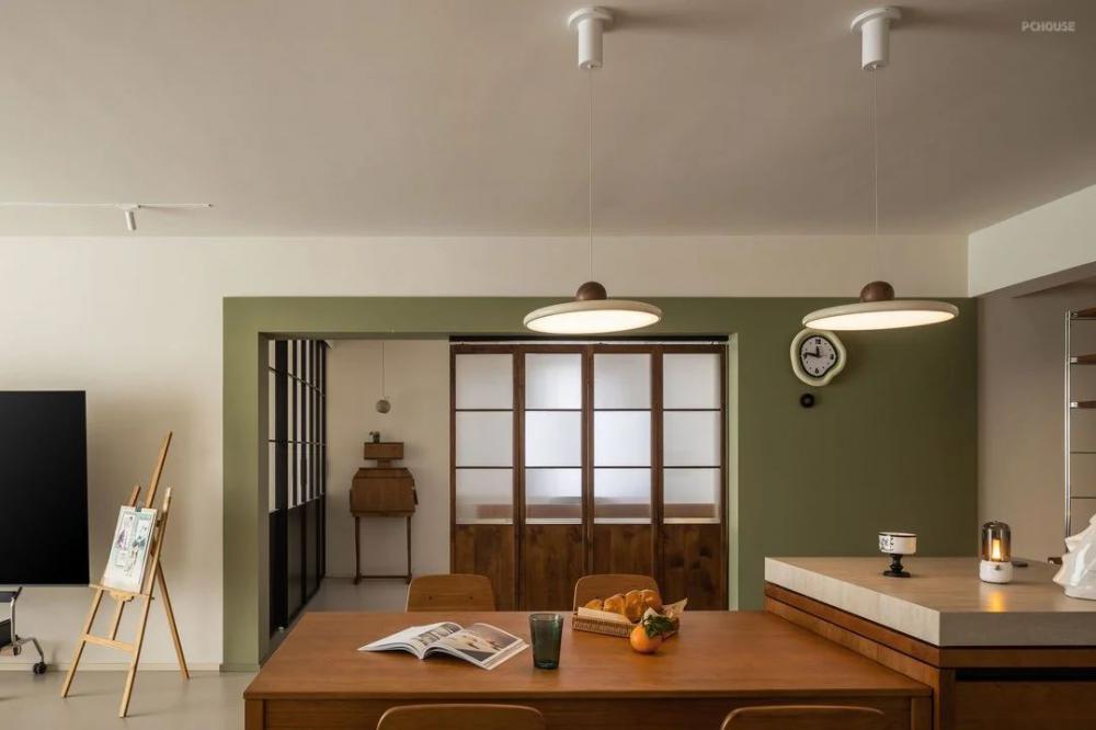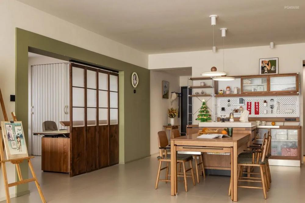 家里的收納部分都為靈活的成品隔板或者家具,減少定制產(chǎn)品的出現(xiàn),這樣的雜貨鋪風(fēng)格,加上業(yè)主收藏的各種飾品,呈現(xiàn)出濃烈的生活氣息。硬裝以極簡為主,沒有過多的造型,墻面有延伸感的裝飾畫能發(fā)散人的思緒,以家具的布局來實現(xiàn)氛圍感。島臺內(nèi)部增加的燈光讓島臺更具輕盈感,氛圍就是依靠各種不同層級的燈光來實現(xiàn)的。用折疊門的方式來做空間分區(qū),綠色的墻面涂料對空間做了更細(xì)致的劃分,從這里開始進(jìn)入到工作間、臥室。原戶型進(jìn)門時雖然預(yù)留了玄關(guān)柜的空間,但進(jìn)深相對淺,使用起來并不好用,衛(wèi)生間處的走廊也過于閉塞。在進(jìn)行墻體拆改之后,西側(cè)擴(kuò)大空間作為進(jìn)門的儲物區(qū)。南側(cè)墻體變薄來增加餐邊柜的可用空間,東側(cè)則以嵌入的方式容納定制柜和洗烘一體機(jī),干濕分區(qū)的路線也變得更為明確。原戶型進(jìn)門時雖然預(yù)留了玄關(guān)柜的空間,但進(jìn)深相對淺,使用起來并不好用,衛(wèi)生間處的走廊也過于閉塞。在進(jìn)行墻體拆改之后,西側(cè)擴(kuò)大空間作為進(jìn)門的儲物區(qū)。南側(cè)墻體變薄來增加餐邊柜的可用空間,東側(cè)則以嵌入的方式容納定制柜和洗烘一體機(jī),干濕分區(qū)的路線也變得更為明確。減少自然采光的阻隔,讓光線更多的進(jìn)入到室內(nèi),生活的煙火氣在此刻得到最大的滿足,家里成品家具除了具有功能性之外,視覺表現(xiàn)力也不差。減少自然采光的阻隔,讓光線更多的進(jìn)入到室內(nèi),生活的煙火氣在此刻得到最大的滿足,家里成品家具除了具有功能性之外,視覺表現(xiàn)力也不差。減少自然采光的阻隔,讓光線更多的進(jìn)入到室內(nèi),生活的煙火氣在此刻得到最大的滿足,家里成品家具除了具有功能性之外,視覺表現(xiàn)力也不差。減少自然采光的阻隔,讓光線更多的進(jìn)入到室內(nèi),生活的煙火氣在此刻得到最大的滿足,家里成品家具除了具有功能性之外,視覺表現(xiàn)力也不差。減少自然采光的阻隔,讓光線更多的進(jìn)入到室內(nèi),生活的煙火氣在此刻得到最大的滿足,家里成品家具除了具有功能性之外,視覺表現(xiàn)力也不差。減少自然采光的阻隔,讓光線更多的進(jìn)入到室內(nèi),生活的煙火氣在此刻得到最大的滿足,家里成品家具除了具有功能性之外,視覺表現(xiàn)力也不差。
