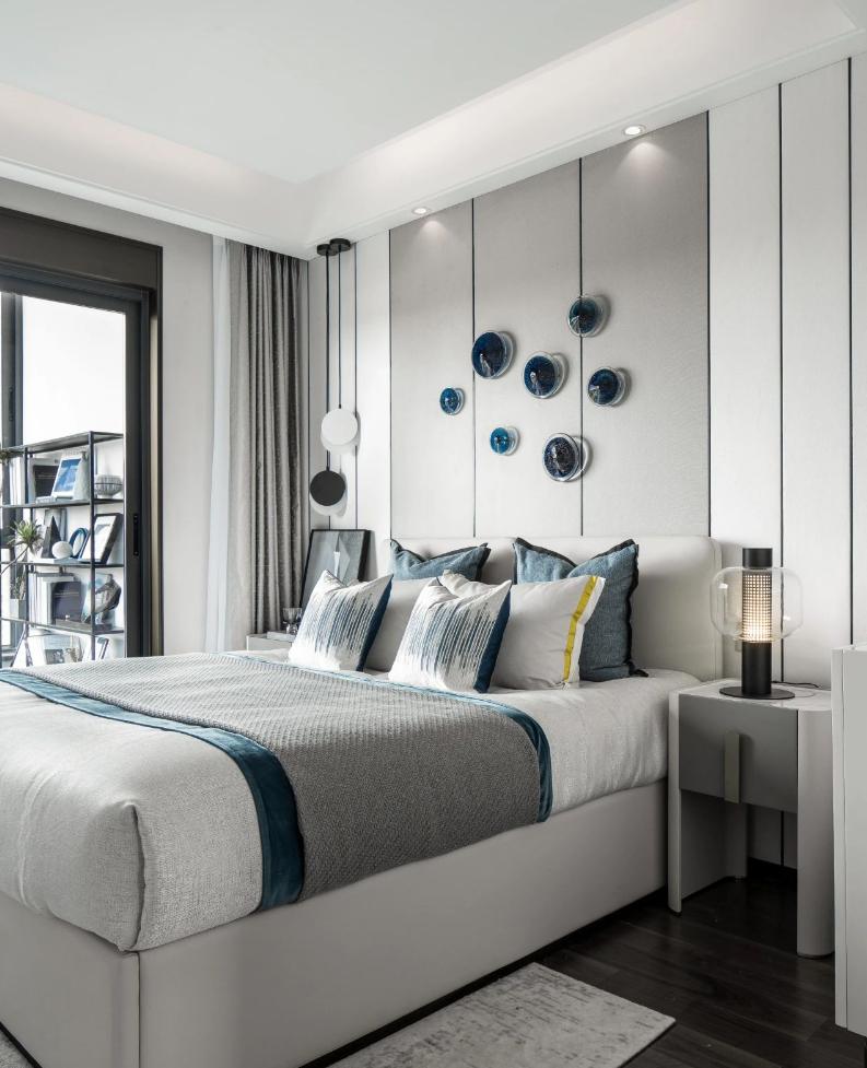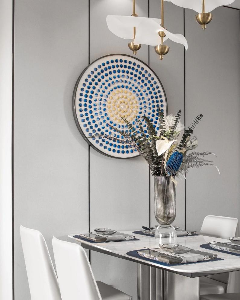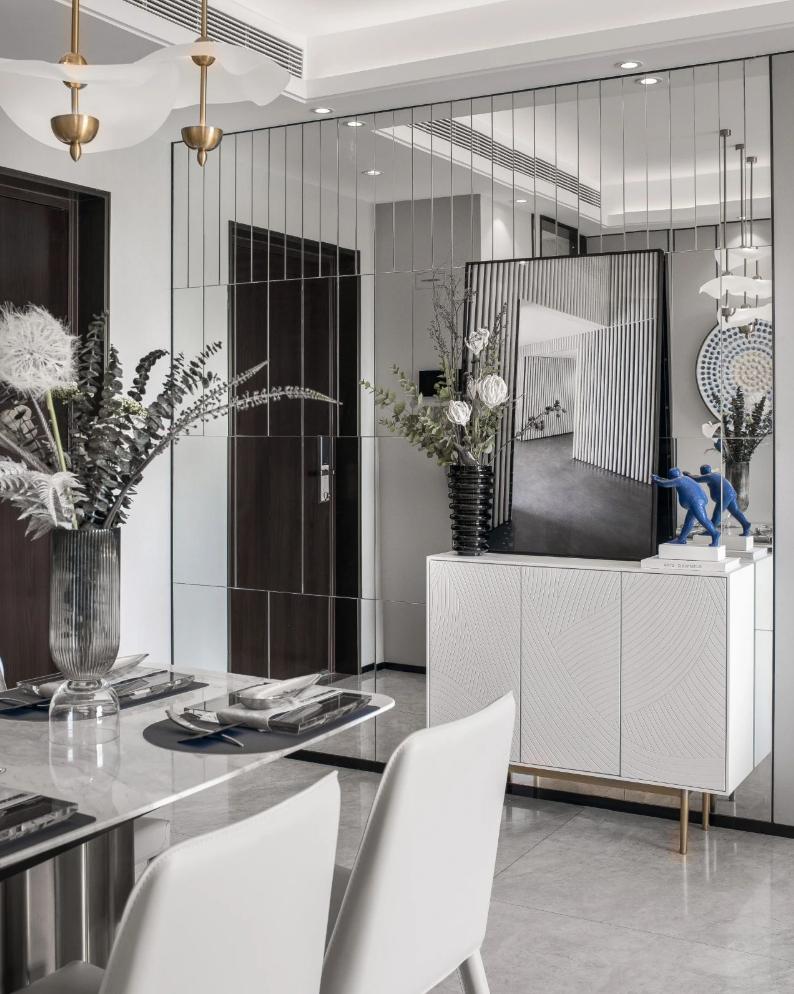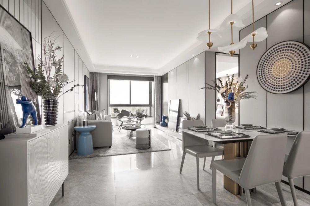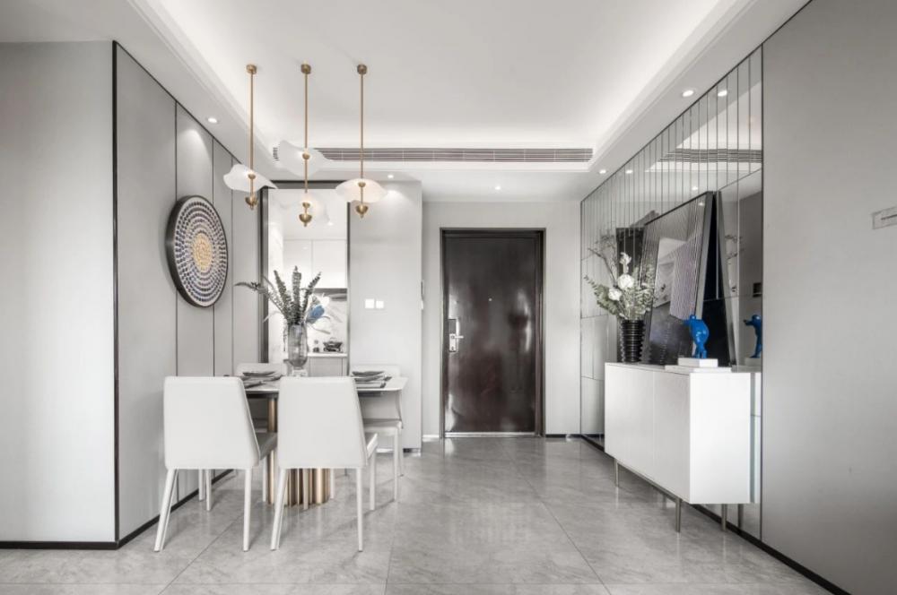 這個房子是套內(nèi)面積57平米,整體設(shè)計以年輕舒適的現(xiàn)代風(fēng)為設(shè)計主題,布置上精致優(yōu)雅的軟裝擺設(shè),點綴上精致華麗的細(xì)節(jié)設(shè)計,營造出一種優(yōu)雅端莊的高檔氛圍感。 ▲餐廳處于進(jìn)入玄關(guān)后的第一個空間,整體現(xiàn)代范的高級灰設(shè)計,搭配上優(yōu)雅精致的家居軟裝布置,營造出一種華麗優(yōu)雅的精致與檔次感。 ▲餐廳背景墻以灰色硬包的質(zhì)感,中間加入黑色線條裝飾,掛著一幅圓形的彩色珠圖案裝飾畫,布置現(xiàn)代華麗的石材臺面餐桌,還有皮質(zhì)的餐椅,讓空間顯得更加溫雅華麗。 ▲廚房也是雅白的墻面地面,布置U形操作臺,讓做飯空間也更加時尚舒適而自然。 ▲餐廳與客廳空間的風(fēng)格保持一致,客廳采取無主燈的設(shè)計,天花四周加入燈帶的裝飾,布置現(xiàn)代優(yōu)雅的家具與硬裝設(shè)計,帶來的是溫馨舒適的高級氣質(zhì)。 ▲靠窗陽臺打通后,以金屬質(zhì)感把門洞裝飾起來,陽臺側(cè)邊的置物架,擺上清新的多肉盆栽,也是顯得更加清新自在。 ▲休閑陽臺布置懶人沙發(fā)椅與收納架,也是顯得更加生機舒適。 ▲兒童房空間較小,布置榻皮藝床+書桌組合,書桌上方還有吊柜書架組合,加入藍(lán)色與黃色的的搭配,讓空間顯得更加自然舒適。 ▲臥室床頭墻也是硬包的造型,中間部分深灰色的設(shè)計還掛了一組獨特的藍(lán)色鈕扣狀裝飾。 ▲衛(wèi)生間以雅白的墻面地面,玻璃作為干濕分區(qū)的隔斷,布置簡約時尚的洗手盆,帶來一個簡潔時尚的衛(wèi)浴空間。