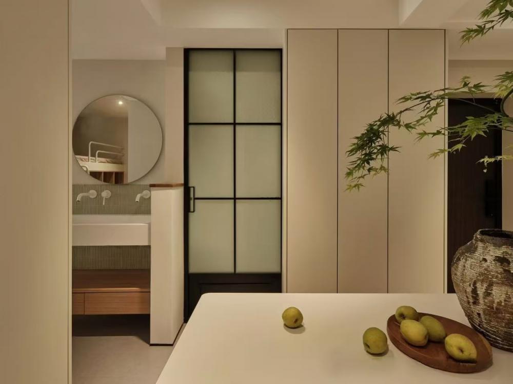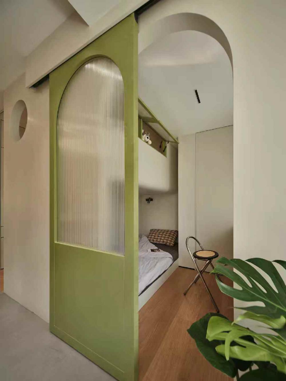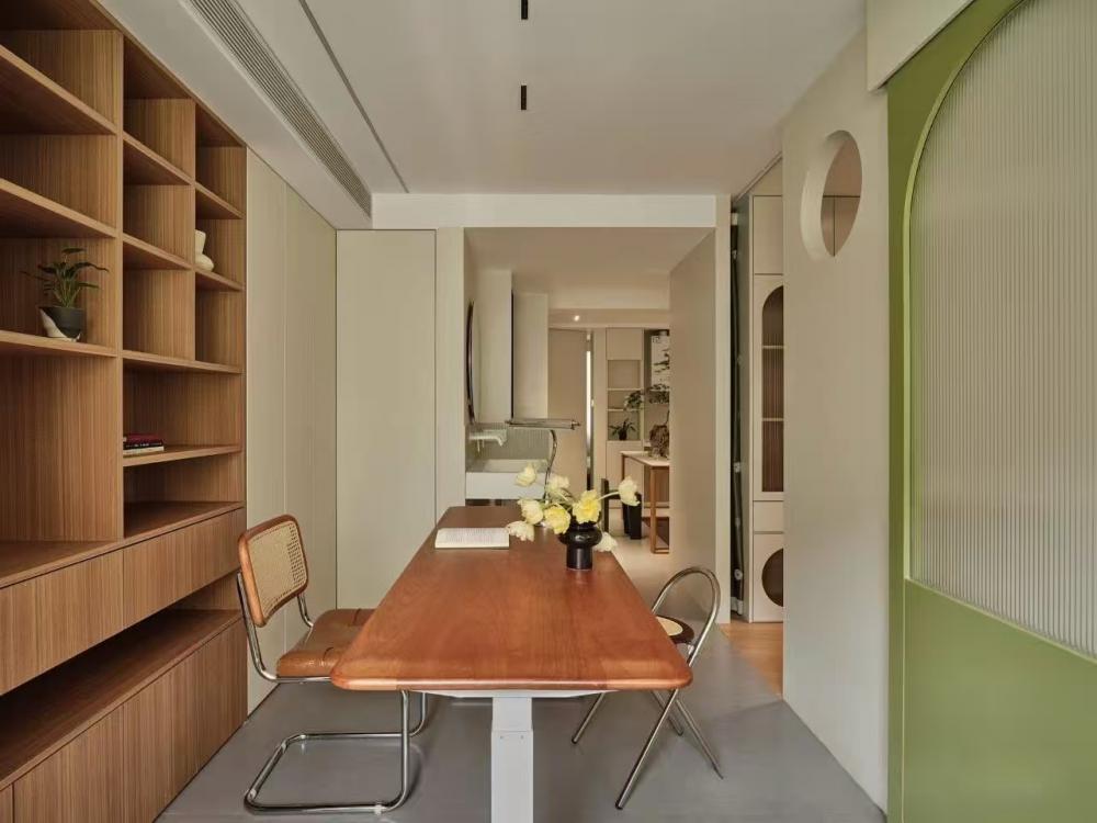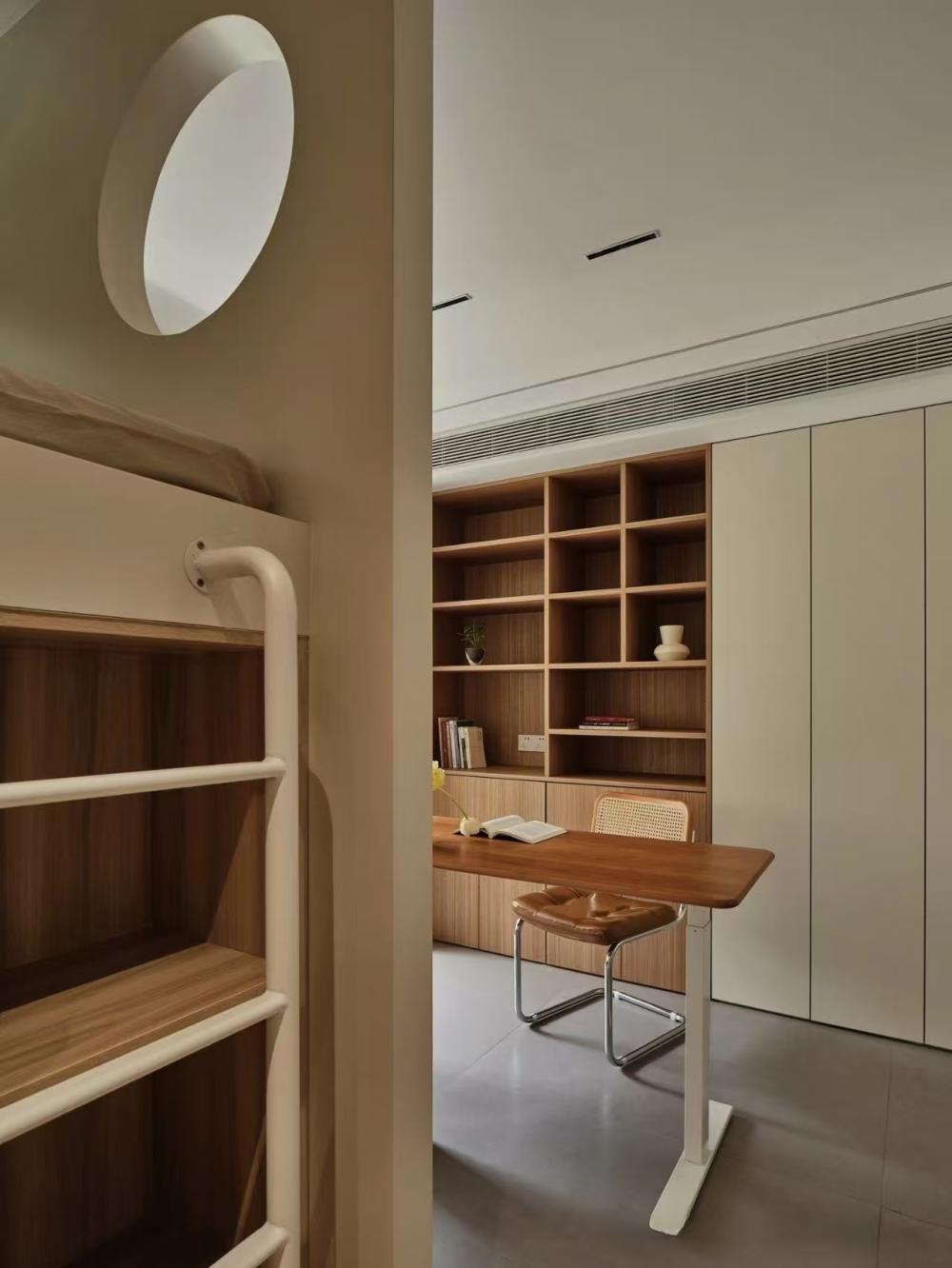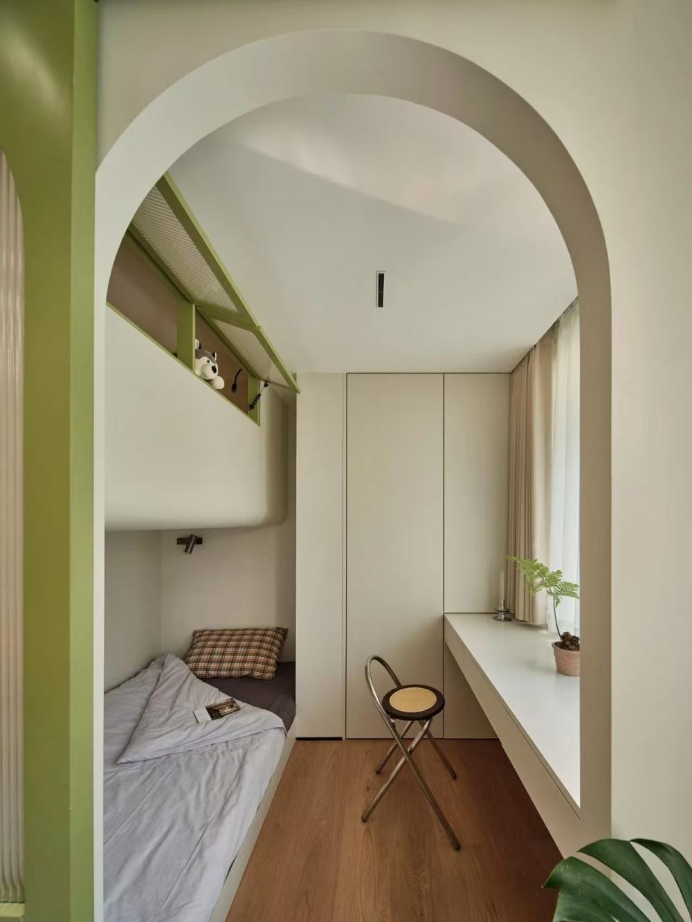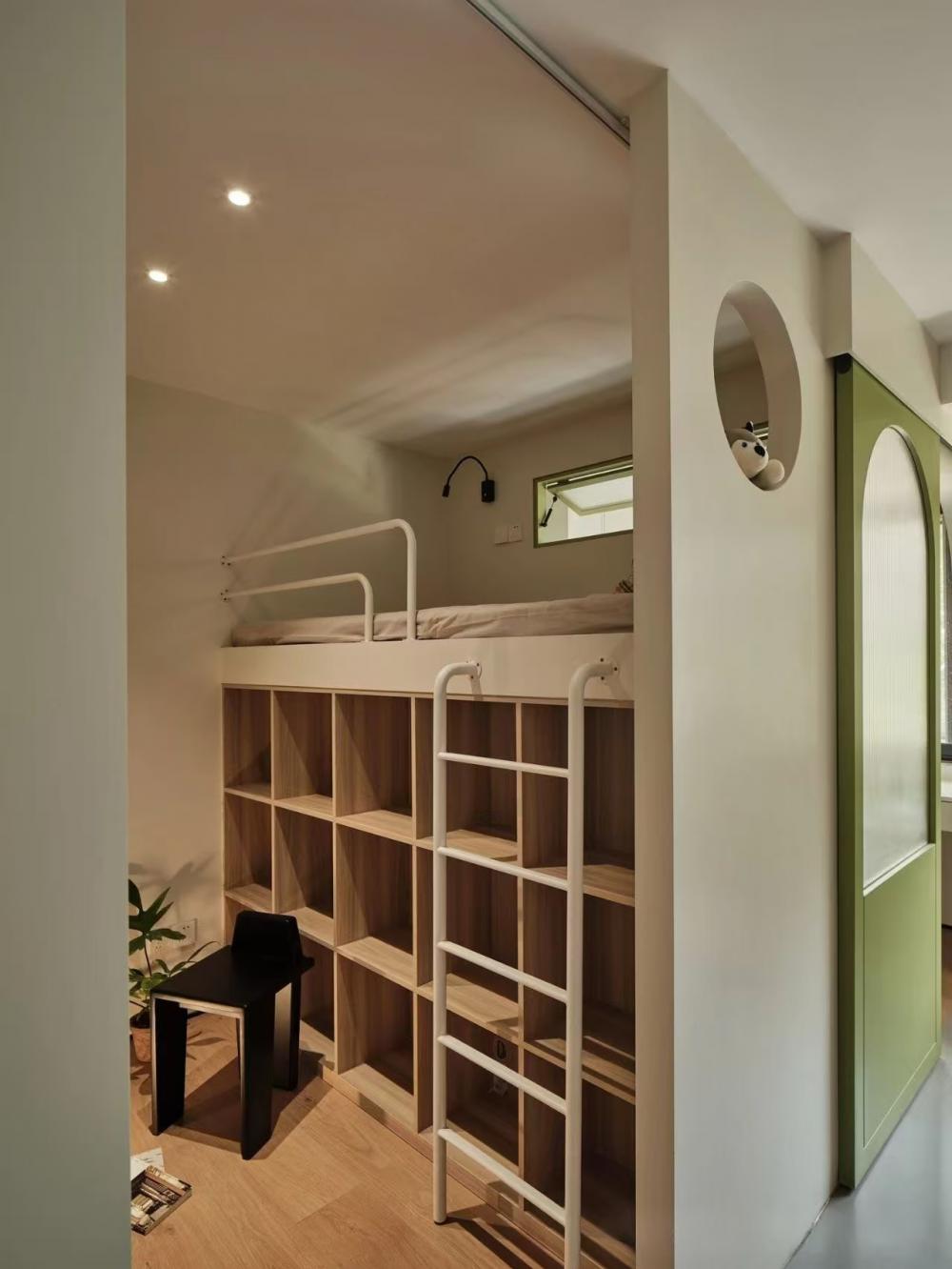 家的營造并非簡單的裝飾和審美提升,更深層次的內(nèi)核是體察每個(gè)家庭具體的生活模式,以及塑造家庭成員對(duì)未來生活的居住期望。利用原陽臺(tái)面積,巧妙安置衣柜與書桌,爬梯床下定制單人床,實(shí)現(xiàn)空間的縱向利用。如何將55㎡“老破小”打造成一個(gè)適宜每位家庭成員的居住空間,是亟待解決的問題。 將最佳采光位置留給大寶的學(xué)習(xí)區(qū),弧形門洞的設(shè)計(jì)不僅柔化了空間線條,更營造出溫馨和諧的氛圍。外掛吊軌移門省空間又實(shí)用,嫩綠長虹玻璃邊框宛如春日里的一抹清新,為學(xué)習(xí)氛圍注入生機(jī)與活力 利用原陽臺(tái)面積,巧妙安置衣柜與書桌,爬梯床下定制單人床,實(shí)現(xiàn)空間的縱向利用。 設(shè)計(jì)師以“S”型上下布局打造二寶房間,充分挖掘有限空間潛力,滿足不同成長階段需求。 探索與趣味并重,爬梯、洞口、側(cè)窗設(shè)計(jì)豐富互動(dòng)體驗(yàn),激發(fā)孩子好奇心,同時(shí)優(yōu)化自然采光。 南臥室以中軸線劃分公私區(qū)域,打破傳統(tǒng)格局,集客廳、書房、親子互動(dòng)、收納、家政等多功能于一體,形成獨(dú)特的生活方式。 業(yè)主的閱讀習(xí)慣在此傳承,成為全家精神的匯聚地。 設(shè)計(jì)師拆除廚房與玄關(guān)間隔墻,光線流通,視野開闊,入戶即享敞亮空間感。 餐廚一體設(shè)計(jì)提升功能效率,暖白與木色搭配營造輕松自由氛圍,讓烹飪與用餐成為家庭共享的歡樂時(shí)光。 借助公共區(qū)域?qū)崿F(xiàn)衛(wèi)浴二分離,加長臺(tái)盆與雙龍頭設(shè)計(jì)提升使用效率,同時(shí)拓寬通往餐廚區(qū)的視覺通道,進(jìn)一步改善采光。隱藏式吊軌推拉門嵌入玄關(guān)鞋柜,節(jié)省空間的同時(shí),復(fù)古黑色金屬門與霧面玻璃彰顯簡約格調(diào)。 主臥朝北,設(shè)計(jì)師通過門外擴(kuò)微調(diào),盡可能增加室內(nèi)面積。整面儲(chǔ)物衣柜中間留白,避免擁堵感,通透明亮。床尾儲(chǔ)物柜上翻蓋設(shè)計(jì),最大化利用空間,打造寧靜舒適的睡眠環(huán)境。