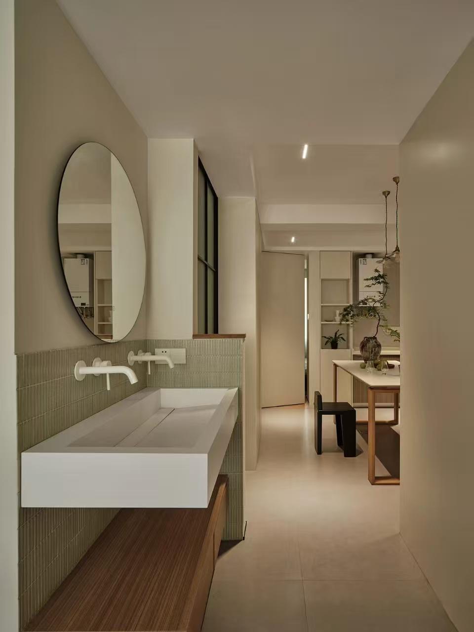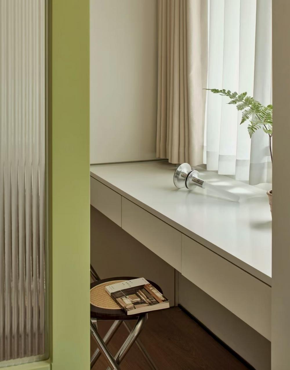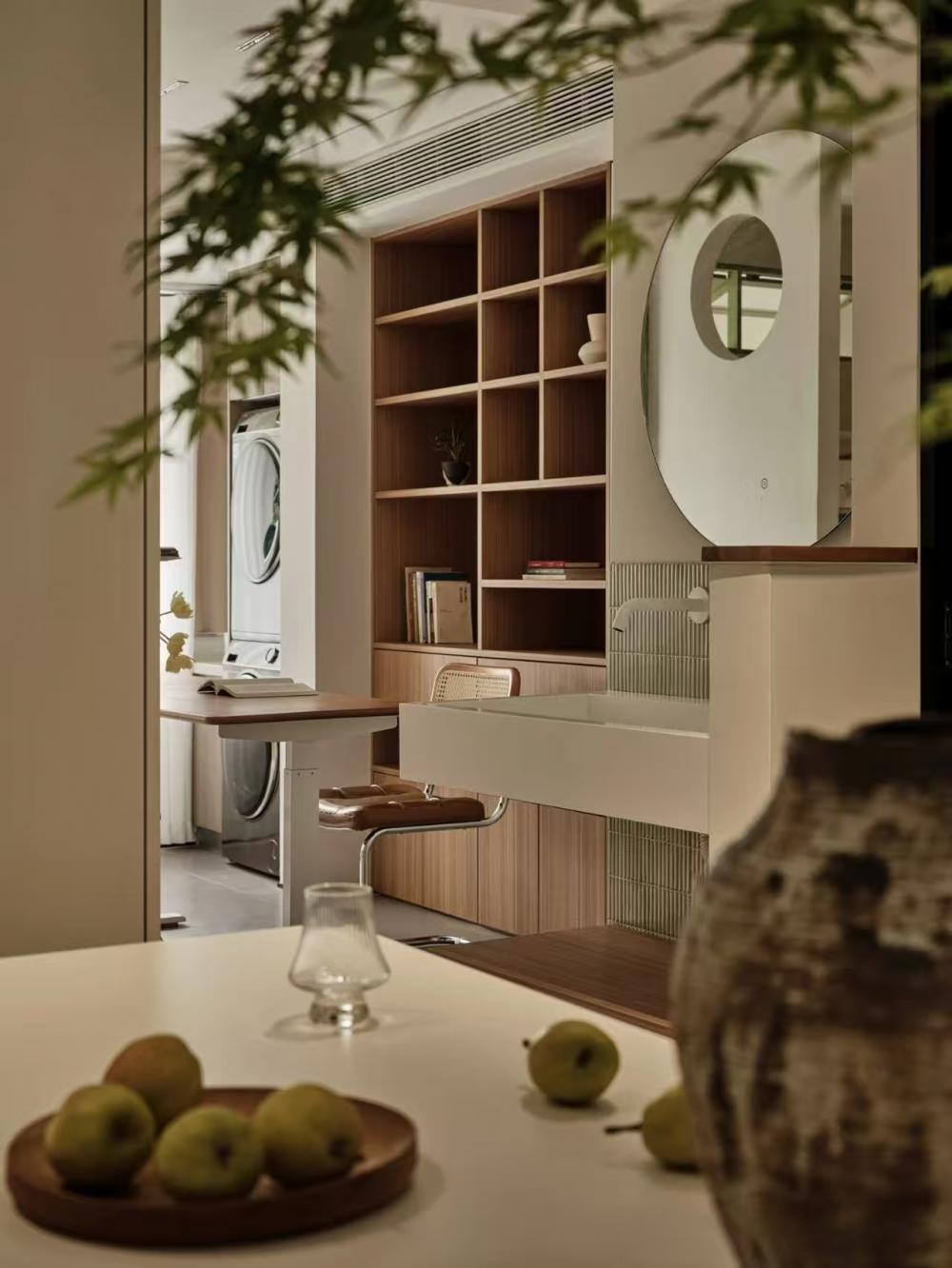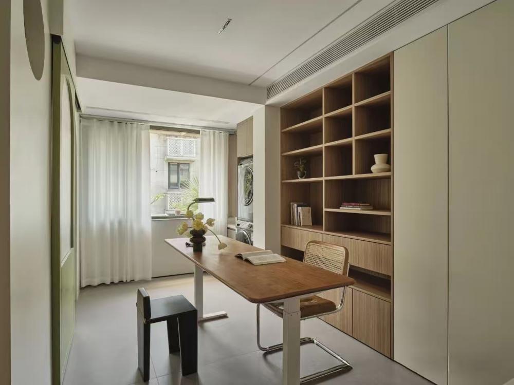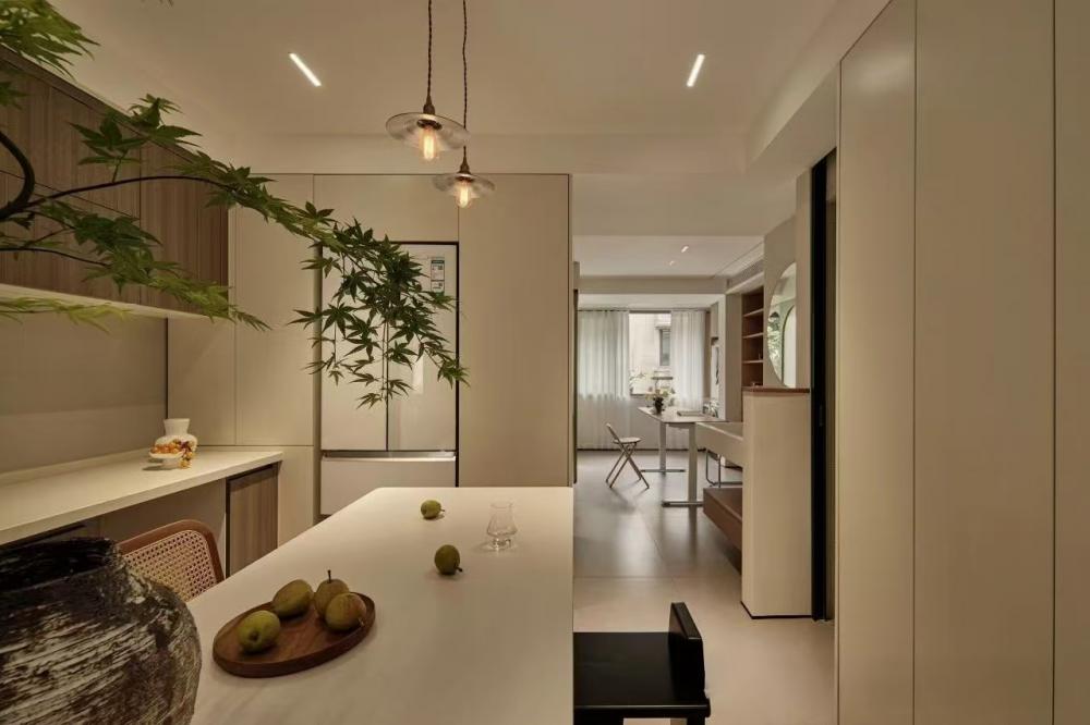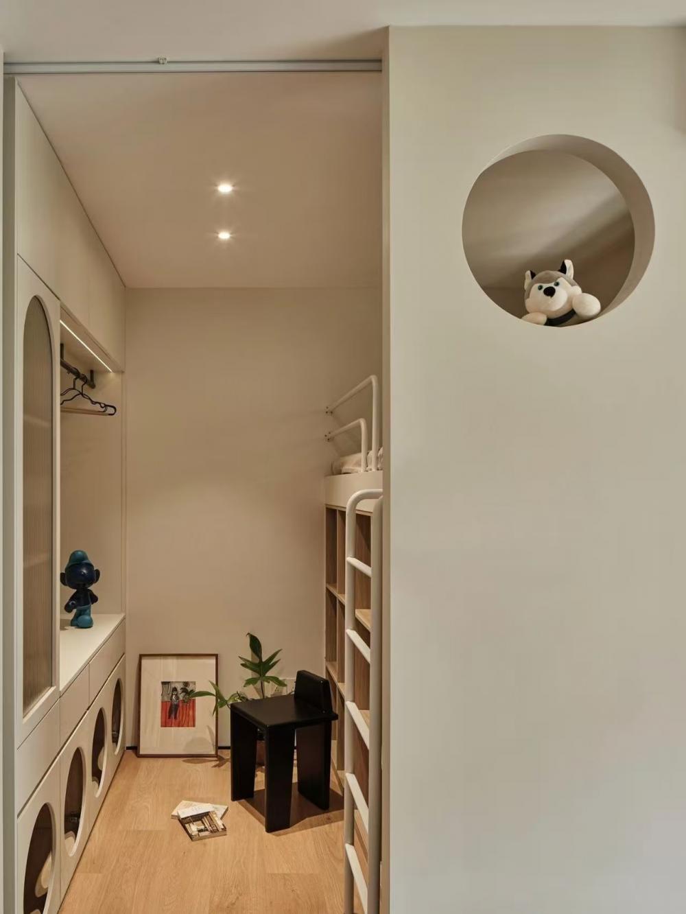 家的營造并非簡單的裝飾和審美提升,更深層次的內(nèi)核是體察每個(gè)家庭具體的生活模式,以及塑造家庭成員對(duì)未來生活的居住期望。利用原陽臺(tái)面積,巧妙安置衣柜與書桌,爬梯床下定制單人床,實(shí)現(xiàn)空間的縱向利用。如何將55㎡“老破小”打造成一個(gè)適宜每位家庭成員的居住空間,是亟待解決的問題。 將最佳采光位置留給大寶的學(xué)習(xí)區(qū),弧形門洞的設(shè)計(jì)不僅柔化了空間線條,更營造出溫馨和諧的氛圍。外掛吊軌移門省空間又實(shí)用,嫩綠長虹玻璃邊框宛如春日里的一抹清新,為學(xué)習(xí)氛圍注入生機(jī)與活力 利用原陽臺(tái)面積,巧妙安置衣柜與書桌,爬梯床下定制單人床,實(shí)現(xiàn)空間的縱向利用。 設(shè)計(jì)師以“S”型上下布局打造二寶房間,充分挖掘有限空間潛力,滿足不同成長階段需求。 探索與趣味并重,爬梯、洞口、側(cè)窗設(shè)計(jì)豐富互動(dòng)體驗(yàn),激發(fā)孩子好奇心,同時(shí)優(yōu)化自然采光。 南臥室以中軸線劃分公私區(qū)域,打破傳統(tǒng)格局,集客廳、書房、親子互動(dòng)、收納、家政等多功能于一體,形成獨(dú)特的生活方式。 業(yè)主的閱讀習(xí)慣在此傳承,成為全家精神的匯聚地。 設(shè)計(jì)師拆除廚房與玄關(guān)間隔墻,光線流通,視野開闊,入戶即享敞亮空間感。 餐廚一體設(shè)計(jì)提升功能效率,暖白與木色搭配營造輕松自由氛圍,讓烹飪與用餐成為家庭共享的歡樂時(shí)光。 借助公共區(qū)域?qū)崿F(xiàn)衛(wèi)浴二分離,加長臺(tái)盆與雙龍頭設(shè)計(jì)提升使用效率,同時(shí)拓寬通往餐廚區(qū)的視覺通道,進(jìn)一步改善采光。隱藏式吊軌推拉門嵌入玄關(guān)鞋柜,節(jié)省空間的同時(shí),復(fù)古黑色金屬門與霧面玻璃彰顯簡約格調(diào)。 主臥朝北,設(shè)計(jì)師通過門外擴(kuò)微調(diào),盡可能增加室內(nèi)面積。整面儲(chǔ)物衣柜中間留白,避免擁堵感,通透明亮。床尾儲(chǔ)物柜上翻蓋設(shè)計(jì),最大化利用空間,打造寧靜舒適的睡眠環(huán)境。