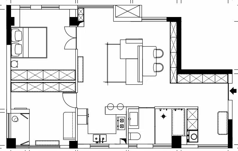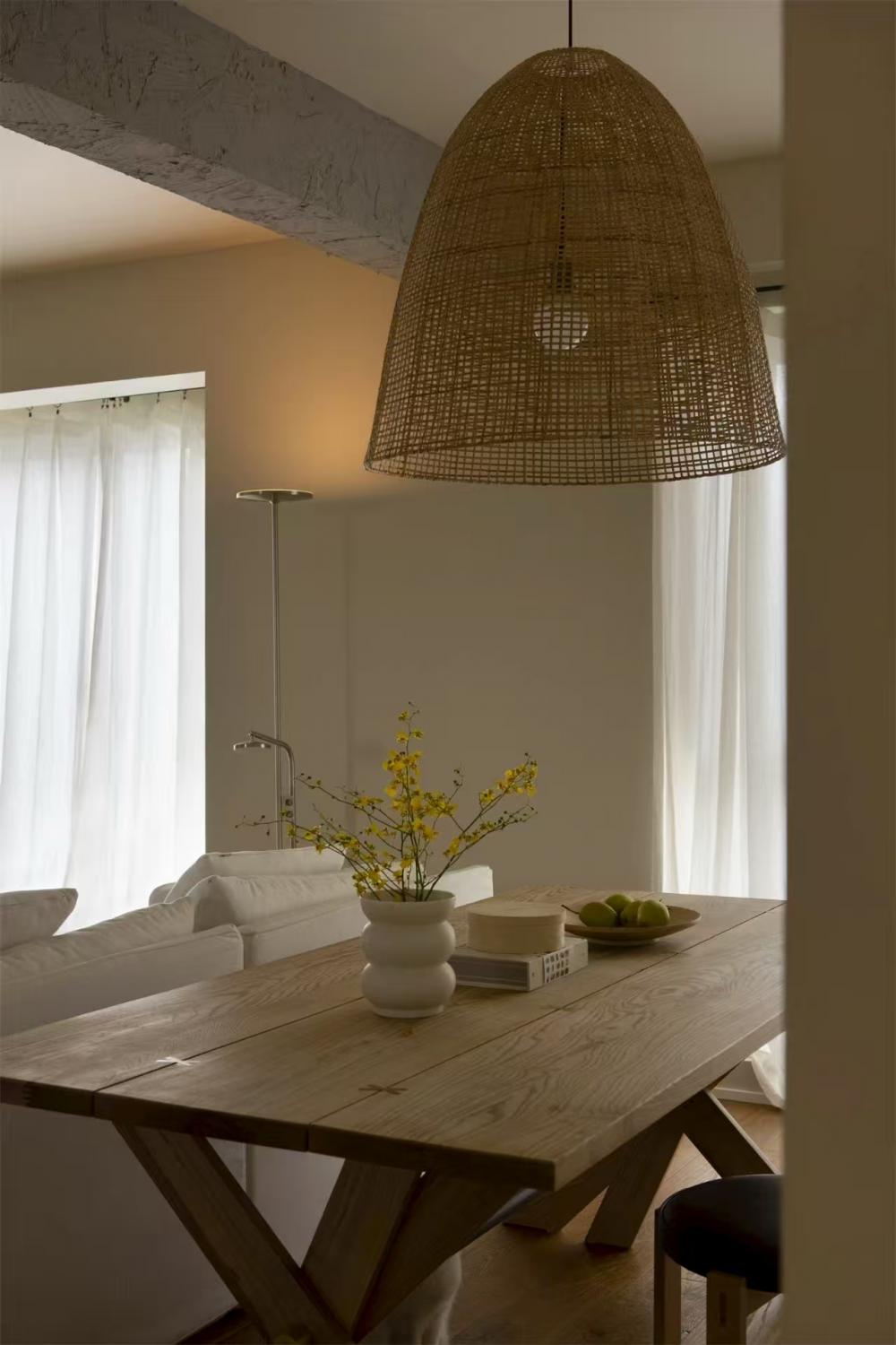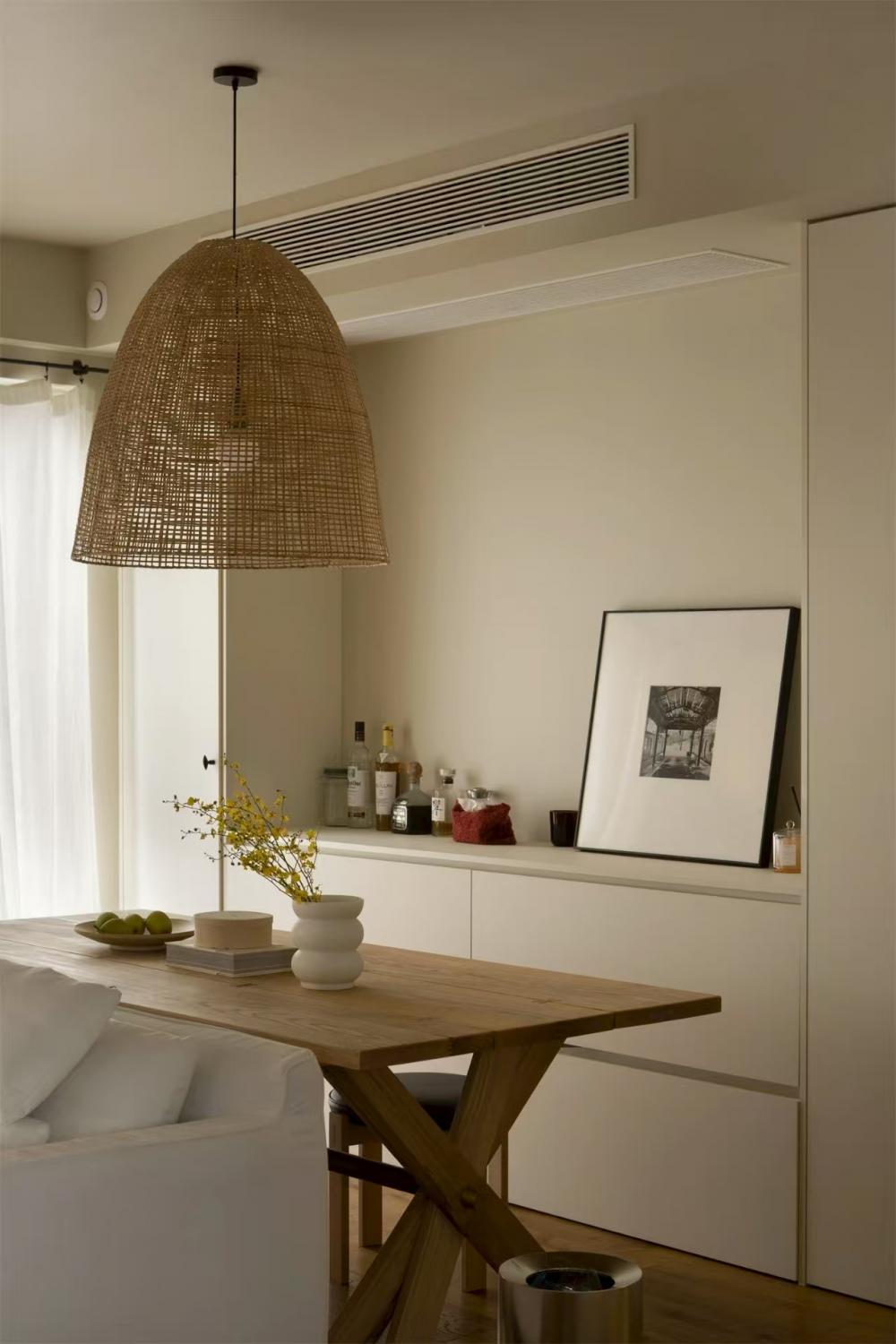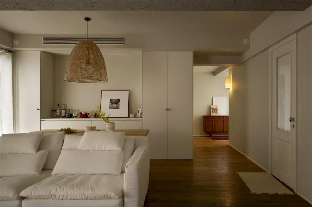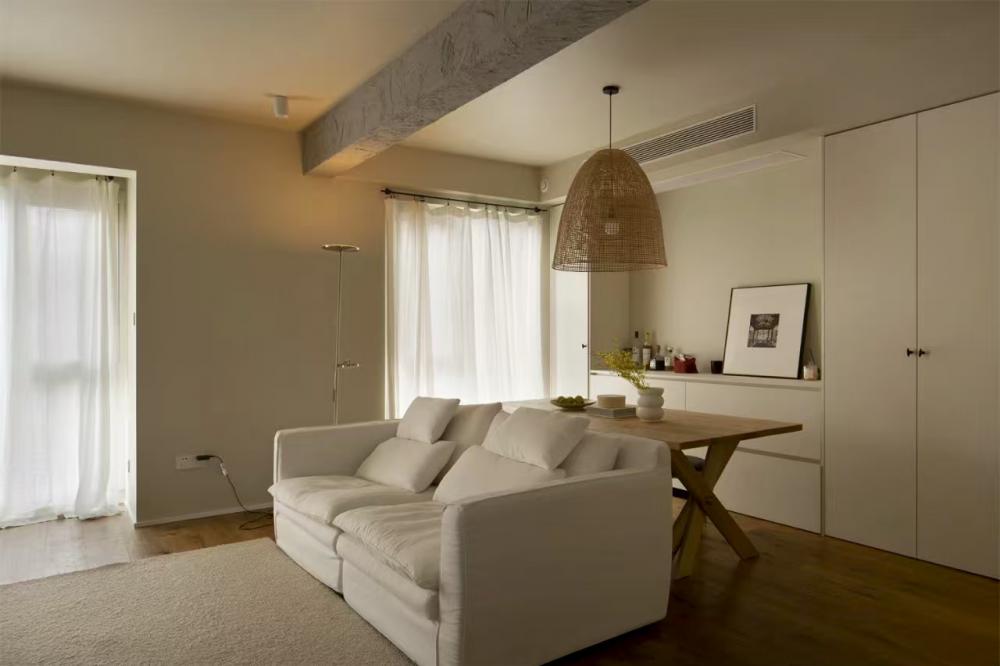 本期案例屋主是一位年輕小姐姐,對房子的裝修風(fēng)格有自己的想法,喜歡簡約、清新的空間,于是設(shè)計師將設(shè)計的側(cè)重點放在了合理的空間布局規(guī)劃上,打造出與屋主本人氣質(zhì)相符的居家感。 玄關(guān)的空間比較開闊,設(shè)計師將這里打造成一個多功能的入戶空間。進(jìn)門右側(cè)做了一個一門到頂?shù)臉O簡玄關(guān)柜,并組合開放格設(shè)計,滿足不同的收納需求。 靠陽臺一側(cè)安排斗柜+洗衣區(qū)+洗手區(qū),入戶放包、換鞋、換衣、洗手,一站式完成進(jìn)門動作。 走進(jìn)客廳,感覺非常的寬敞明亮,設(shè)計師巧用原木家具和簡潔的線條,將現(xiàn)代與自然元素結(jié)合,營造出一種優(yōu)雅而舒適的氛圍。 兩側(cè)的落地窗最大程度引光入室,搭配白色的亞麻窗簾,空間色調(diào)柔和,營造出一種寧靜、舒適的氛圍。取消電視墻,用移動電視支架來滿足日常觀影需求。 客廳的設(shè)計簡潔而實用,全屋奶油白與木色頂級顏值的組合,耐看舒適干凈的韓系風(fēng)格撲面而來。 客餐廳之間的橫梁,選擇采用藝術(shù)漆做自然紋理的處理,顯眼卻不突兀,與原木家具搭配在一起讓整個空間呈現(xiàn)出統(tǒng)一、自然的設(shè)計感。 餐廳在沙發(fā)背后,客餐廳一體的設(shè)計使得空間得到了延伸,不做明顯分隔,空間更靈活自由。一張原木餐桌散發(fā)著自然的氣息,桌面上的木紋清晰可見,與藤編的吊燈、純白餐邊柜相互搭配,恰到好處的融合了干凈自然、溫馨舒適的元素。 開放式的烹飪空間,左側(cè)增加一個小島臺與灶臺連接,擴(kuò)大廚房臺面空間,可做備菜區(qū)又可以充當(dāng)咖啡區(qū),日常生活更便捷。 臥室是一個舒適、安靜的地方,柔和的色調(diào)與簡約的床品搭配毛絨絨的地毯可以增加溫馨感。開兩扇落地窗的設(shè)計,躺在床上就能輕松看到室外風(fēng)景,還提升了整個臥室的格調(diào)和高級感。 選擇純白雙開房門,簡潔干凈的線條,立體感更強(qiáng),也讓整體質(zhì)感得以提升。 衛(wèi)生間洗漱臺與馬桶放在同一側(cè),留出左側(cè)的空間設(shè)置浴缸、淋浴區(qū)。 左右兩側(cè)利用無框玻璃進(jìn)行干濕分離,空間更清爽。墻面設(shè)置物架,既可以防潮,又可以將洗漱用品分開放置,保持臺面的整潔。