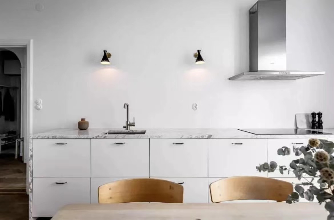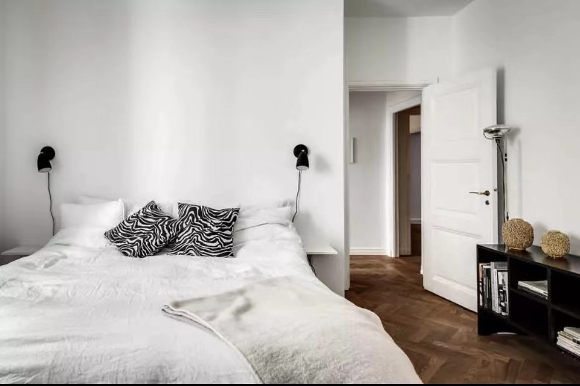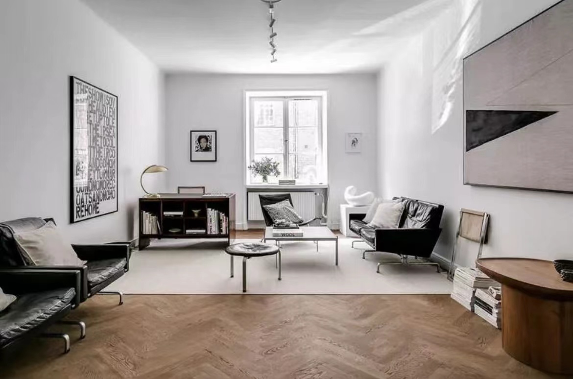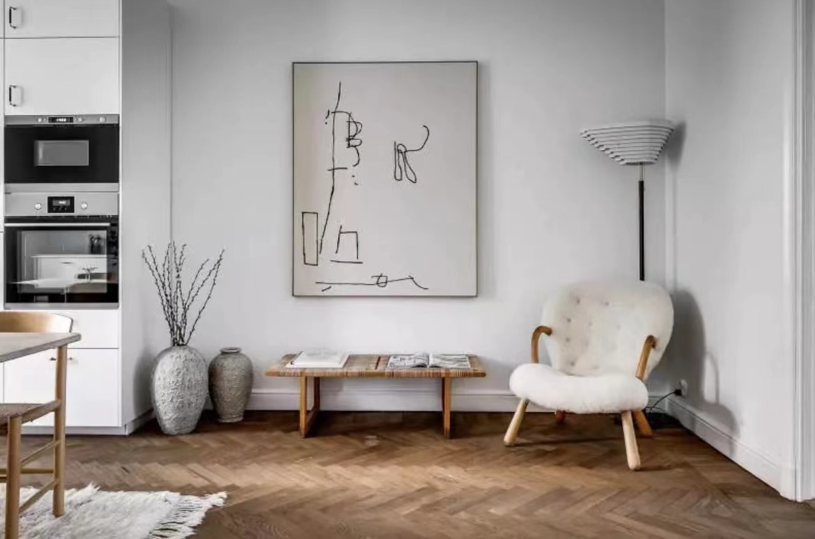 公寓的天花板直接“裸露”出來,沒有采用吊頂,令層高更顯突出。白色+原木色的主調設計,大氣天然。