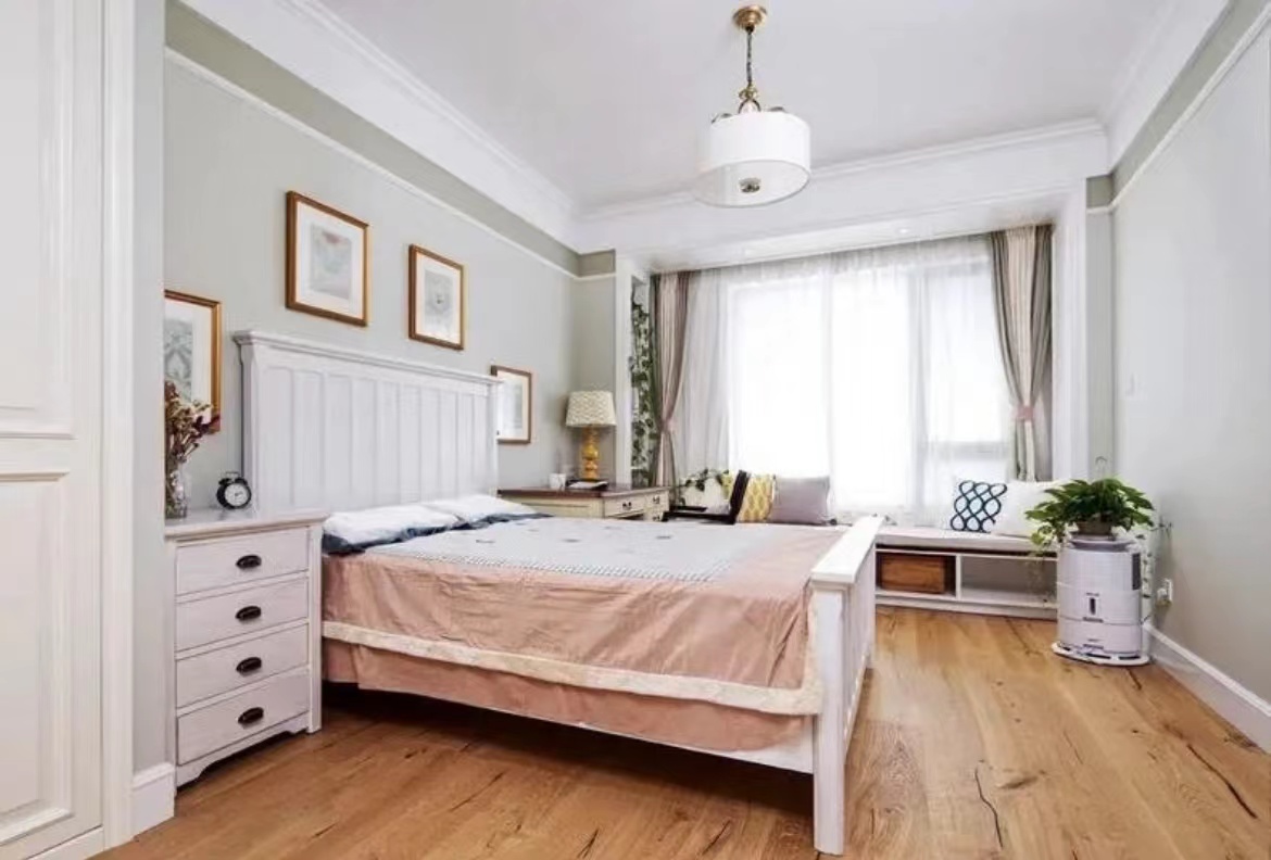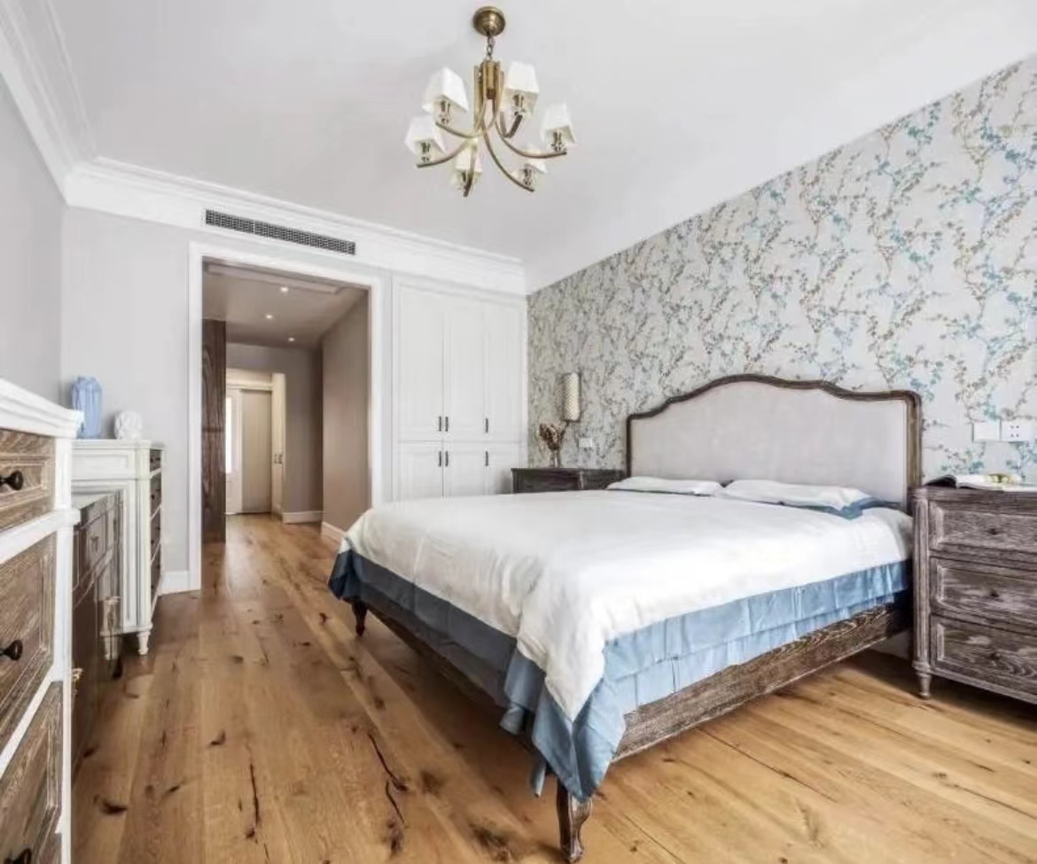臥室空間設(shè)置了豐富的收納形式,出來一柜到底的衣柜,還有多個床頭柜、儲物柜,充分滿足空間的收納需求。床板和柜體都采用了做舊處理,營造 一種復古的氛圍。