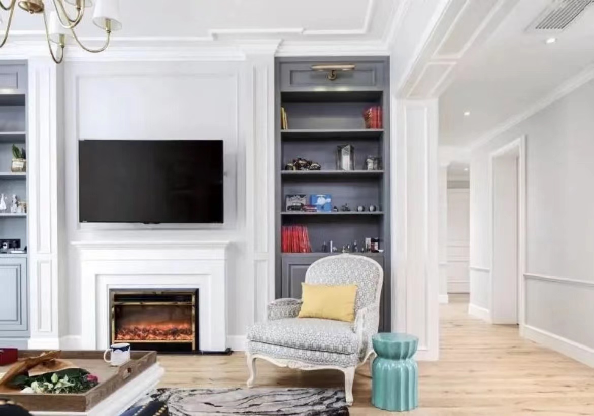 設(shè)計師為了像經(jīng)典美式致敬,在客廳的位置設(shè)計了一個小巧的壁爐,作為電視背景墻的一部分,營造一種復古原始的味道。