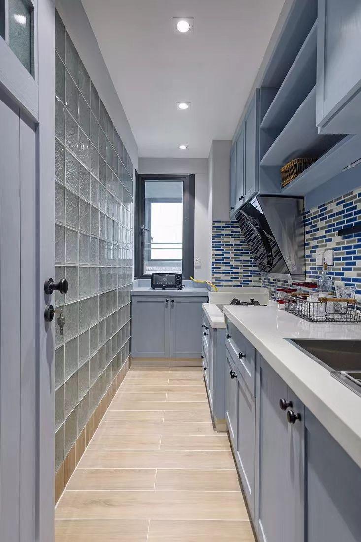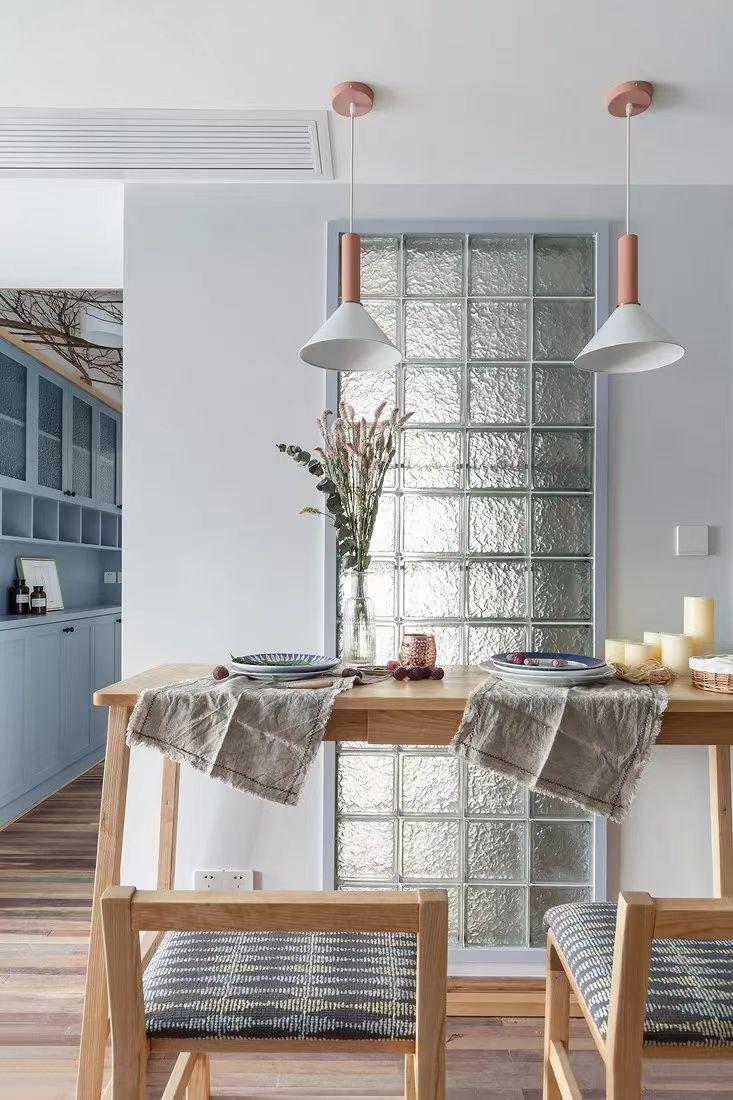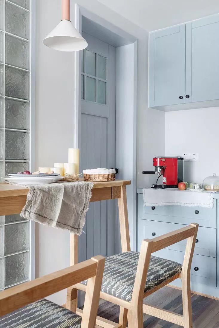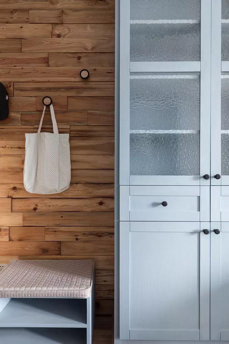 整體以簡(jiǎn)約的空間,結(jié)合灰藍(lán)色與木質(zhì)的自然元素,營(yíng)造出一個(gè)舒適愜意的明朗感受 ▲?玄關(guān)換鞋凳后方的木質(zhì)墻面增加了空間的層次感,掛鉤的安裝方便了屋主衣物的取放。整體藍(lán)灰色的柜體,顯得簡(jiǎn)約而自然。 ▲?客廳取消了電視機(jī),將布藝沙發(fā)與木質(zhì)長(zhǎng)凳相對(duì)而置,利用陽(yáng)臺(tái)空間做了榻榻米設(shè)計(jì),不僅大大增強(qiáng)了收納功能,還可以集辦公、看書、聚會(huì)等多功能為一體,打造了輕松舒適的休閑區(qū)。 ▲?沙發(fā)背景墻上設(shè)計(jì)了三層擱板,是屋主展示書籍和收藏品的區(qū)域。 ▲?餐廳靠近大門一側(cè)的墻面設(shè)計(jì)了餐邊柜,不僅嵌入了冰箱,也提供了收納與展示的功能。餐椅后的木質(zhì)斗柜,與木質(zhì)背景墻形成自然統(tǒng)一的質(zhì)感。 ▲?狹長(zhǎng)的廚房采用了L型的布局,充分利用到拐角的位置。打掉了左側(cè)原始的墻體,換成了半透明的玻璃磚,加大了空間的采光性與通透感。 ▲?走廊墻面被利用起來,裝上了收納展示柜。天花頂采用干樹枝裝扮,彰顯個(gè)性卻不失大雅。 ▲?臥室,飄窗旁的剩余空間做成了一個(gè)小型的休閑沙發(fā)卡座,既美觀也可增加一定的儲(chǔ)物功能。床頭背景墻上的擱板,為空間提供了有趣的收納與裝飾效果。 ▲?床頭柜連同床靠背、飄窗都是一體化銜接,整體淡藍(lán)色格調(diào)顯得安靜又舒適。 ▲?衛(wèi)生間把洗漱臺(tái)外置,考慮到?jīng)]有窗戶,為了不讓整個(gè)空間有壓迫感,同樣采用了玻璃墻磚,使空間做到透光不透視的共享采光。 ▲?洗漱臺(tái)的吊燈,拒絕了傳統(tǒng)模式的燈具,采用一高一低的設(shè)計(jì),精致而有格調(diào)。 ▲?干濕分離的劃分不僅有效防止了水汽散發(fā),讓空間更易于清理,還在一定程度上方便了日常使用。