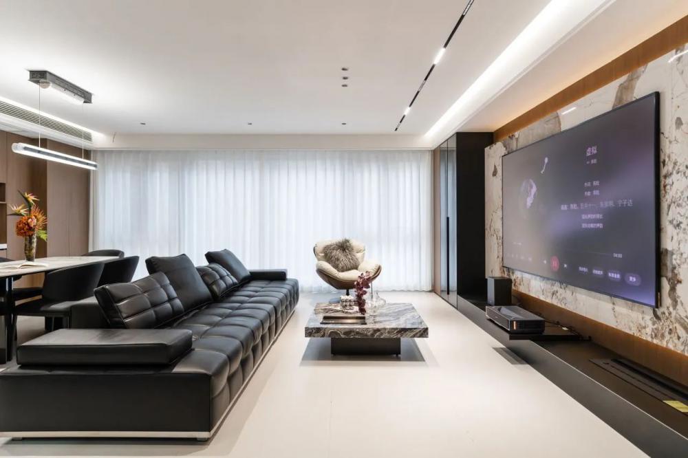 ▲?本案通過三房改四房的巧思布局,巧妙平衡三代同堂的生活需求。動靜分區(qū)清晰,功能完整,保障了每位家庭成員的獨立私密。 ▲?玄關以大面積木飾面包裹,呈現溫潤迎賓的氛圍,簡潔干凈的線條中,藏著收納與美感的巧思,為家的歸屬感悄然鋪墊。 ▲?大理石電視背景墻與黑色皮沙發(fā)相映成趣,營造出客廳的沉穩(wěn)質感,搭配輕盈紗簾柔化氛圍,在理性與感性之間找到平衡。 ▲?開放式客餐廳以木質溫潤收束空間,黑色沙發(fā)與巖板茶幾對比鮮明,呈現出簡約而有層次的視覺節(jié)奏,營造出沉靜舒適的社交場域。 ▲?電視背景墻采用胡桃木飾面與潘多拉巖板拼接,自然肌理與溫潤色調交融,營造出沉穩(wěn)大氣的視覺焦點,盡顯現代質感與藝術格調。 ▲?大橫廳格局串聯(lián)客餐廳,視野開闊通透。餐廳以巖板餐桌搭配皮質座椅,木飾面與燈帶點綴其中,營造出兼具格調與溫度的用餐氛圍。 ▲?餐廳,六人位餐桌滿足多人用餐需求。木色餐邊柜+黑玻柜門設計,與電視背景墻相呼應。一字型吊燈營造溫馨的就餐氛圍。 ▲?堅持客餐廳一體化,并結合大橫廳設計,打造通透開闊的空間格局。淺色大磚通鋪全屋,頂面無主燈設計,讓空間清簡不失層次感。 ▲?廚房,采用同款黑玻四聯(lián)門做隔斷,打造一字型走廊式空間,將有限的空間發(fā)揮到極致。盡頭落地窗設計,優(yōu)化空間采光與通風。 ▲?統(tǒng)一采用淺色系櫥柜,并將電器嵌入式處理,不影響整體美觀度。烹飪區(qū)和備菜區(qū)分開設計,可方便多人協(xié)作,拉近人與人的距離。 ▲?次臥沿窗定制一體書桌,結合百葉簾與收納柜,功能齊備又不失簡潔。木質溫潤質感,搭配百葉簾,讓空間更顯靜謐舒適。 ▲?主臥延續(xù)溫潤木色,低調沉穩(wěn)。床頭燈與氛圍燈帶營造靜謐光感,飄窗設計一體成臺,兼具收納與書寫功能,舒適與實用兼得。 ▲?飄窗一體式設計延伸至衣柜,形成流暢視覺動線。開放格+玻璃柜門組合,兼具展示與收納功能,實用美感并存,盡顯現代精致生活。 ▲?衛(wèi)生間采用干濕分離設計,通透玻璃滑門提升空間感。黑白配色簡約有力,搭配鏡柜與懸空洗手臺,滿足收納與清潔雙重需求。
