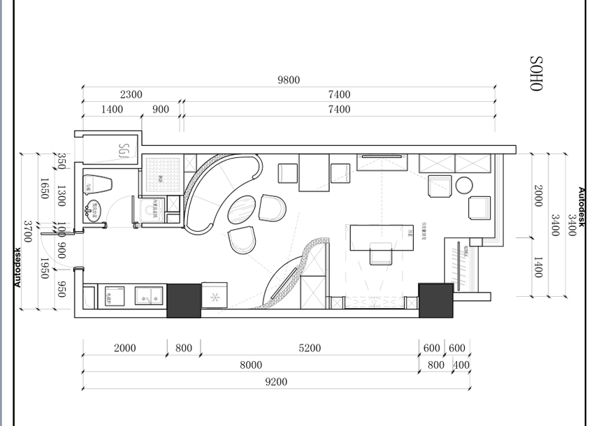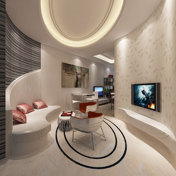現(xiàn)代SOHO,建筑面積:30平公寓,本案例為30平方,為了滿足在家辦公人群的需要。做了一個弧形的進(jìn)門,讓人感覺很現(xiàn)代。書柜部分做了一個翻板床,既滿足了辦公需求有滿足了日常的居住。沙發(fā)是做的弧形的與弧形墻相對應(yīng)。頂于地面也是相呼應(yīng)。