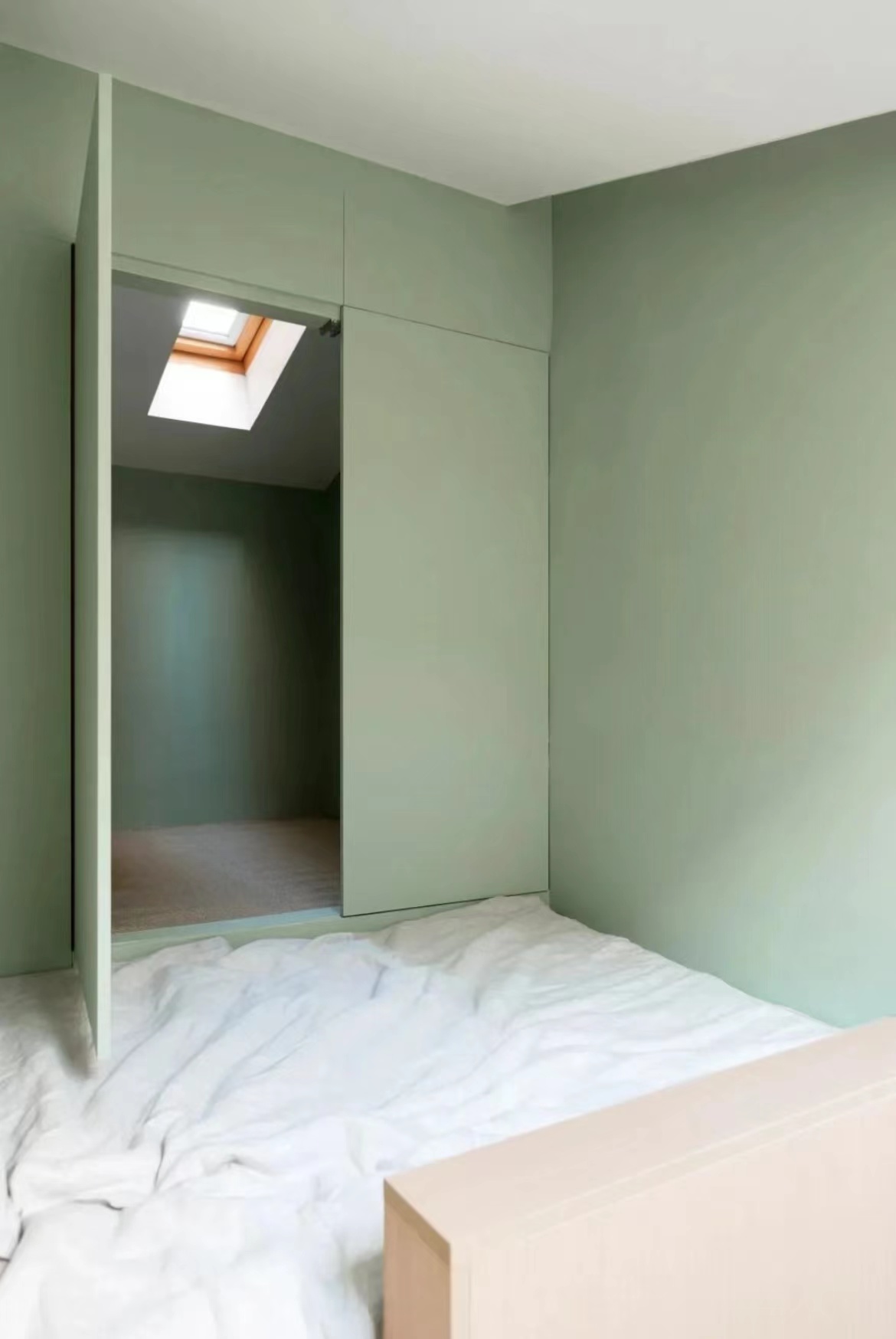 臥室和書房結(jié)合,用一道麻質(zhì)的窗簾作為隔斷,可開可合。