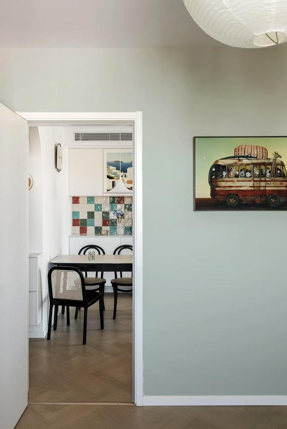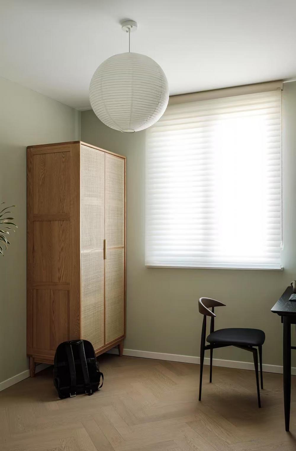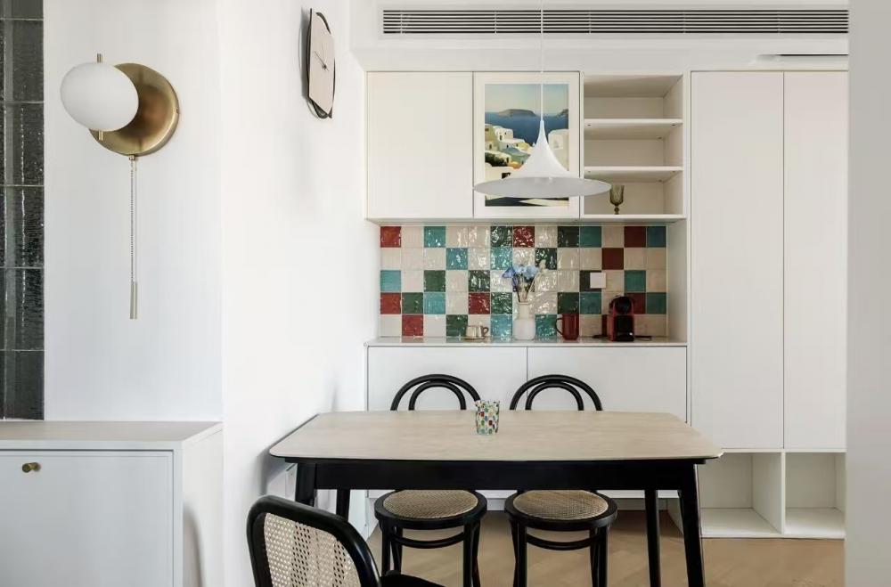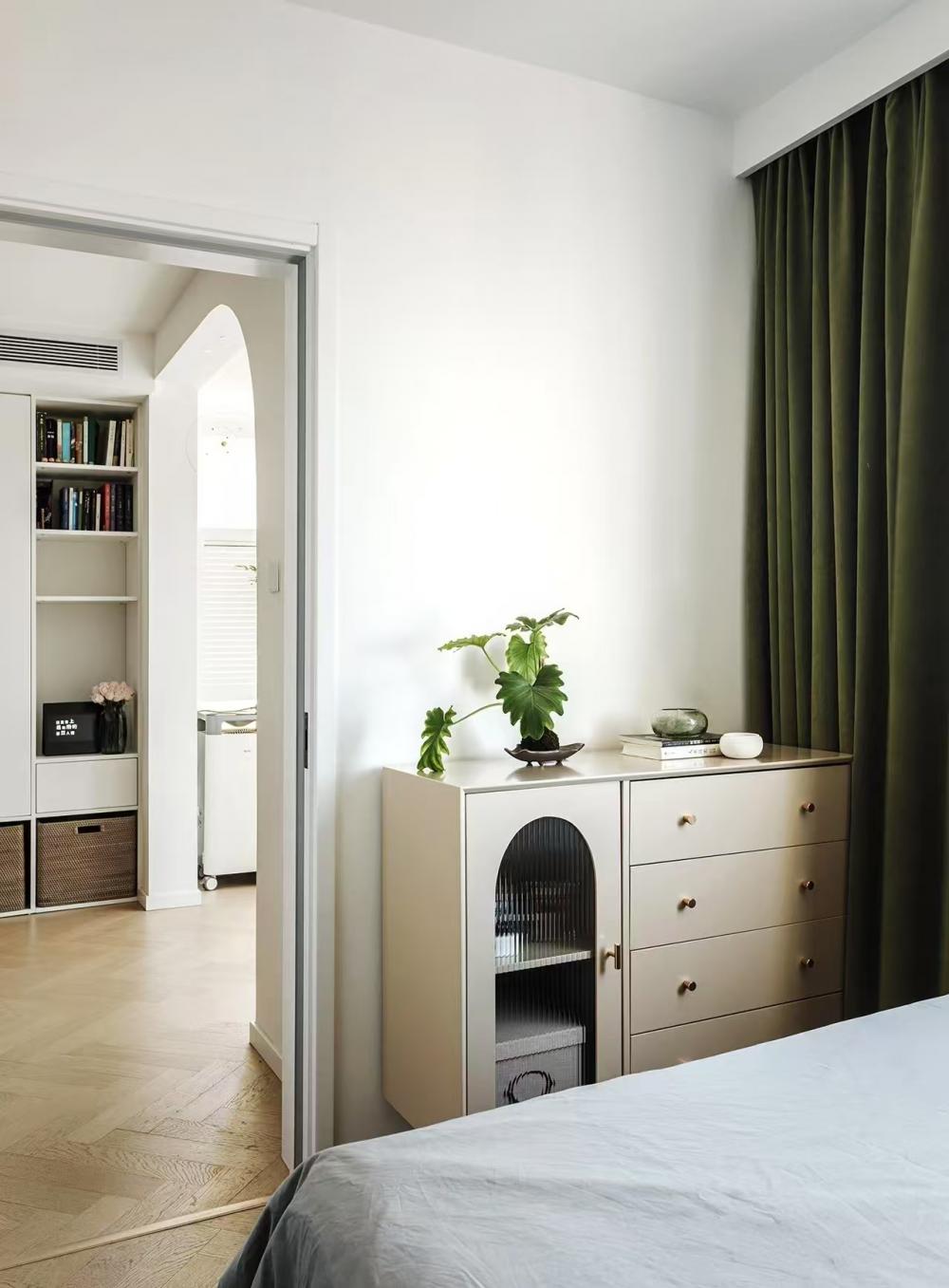 今天要給大家介紹的是一套三居,套內(nèi)63㎡,有3間明窗的獨立臥室,有開敞的公共區(qū)域,算是小戶型三居里的佼佼者了吧,槽點都集中在了入戶區(qū)域,原戶型缺點:玄關(guān)的寬度只有1.1米,無法做正常深度的鞋柜;衛(wèi)生間無窗,而且沒有做干濕分離。 戶型改造: 1、把衛(wèi)生間門左移,再進行合理布局;2、向衛(wèi)生間濕區(qū)借進深(25厘米),讓玄關(guān)擁有了一組45厘米深、1米寬的大收納柜。 改造后的玄關(guān),因為有了正常深度的大收納柜,滿足一家5口鞋包、雜物的收納,功能得以完整。玄關(guān)柜對面的全身鏡方便出門時整理衣冠,旁邊的留言板對于早出晚歸的雙職工家庭來說,是很溫暖的存在。 明亮的衛(wèi)生間干區(qū),有2米長!非常寬敞舒適,2人同時洗漱完全沒問題。 衛(wèi)生間要容納一家5口人各自的洗護用品、臟衣籃、囤貨的紙品等等,設(shè)計時非常注重收納。濕區(qū)選擇了手工窯變磚來鋪貼墻面,和干區(qū)的玻璃磚、玻璃門一樣,都有光影流轉(zhuǎn)的效果,生動不壓抑~ 小戶型就需要見縫插針的收納,衛(wèi)生間右側(cè)還做了一組半高翻斗薄柜,與另一側(cè)柜體齊平。 餐廳位于全屋的中心,在餐邊柜的中間設(shè)置了水吧,方便家里人煮水喝茶。 柜體中間貼了和淋浴房磚同一系列的手工磚,用來隔絕煮水時的水蒸氣,保護墻面。 客廳的收納柜與餐邊柜連為一體,全都選擇白色,體量感很輕,在滿足收納的同時,不會產(chǎn)生壓抑感。投影取代電視,需要時放下,更符合屋主使用習慣。 收納柜靠近陽臺的一側(cè)做成了開放格,放寶寶愛看的繪本,屋主夫婦最近想讀的書。 雖然已經(jīng)有了干衣機,但還是根據(jù)屋主需求在陽臺設(shè)置了一個晾曬區(qū),可以晾曬襯衫、羊絨衫這些比較嬌貴的衣物。 主臥面積不大,屋主偶爾有加班的需求,需要有一張舒適的寫字臺,因此選擇的是1.5米的床。藤編的床頭極具呼吸感,顯得輕盈柔軟。 主臥設(shè)置L型衣柜,留出了一小塊半開放區(qū)掛次凈衣。床尾放上美美的斗柜,陽臺晾好的衣服,收納進來很方便。 次臥現(xiàn)在是老人和孩子一起住,顏色干凈雅致。床對面安裝了電視,老人休息時看。 兒童房現(xiàn)在暫時作為屋主夫婦的書房,布置好了書桌、書架和衣柜。 雙層床等到小朋友愿意獨立睡時再買,保留一些靈活度。 廚房臺面從一字形改成了U字型,提高利用率;設(shè)置高低臺,洗菜不彎腰,更加人性化。