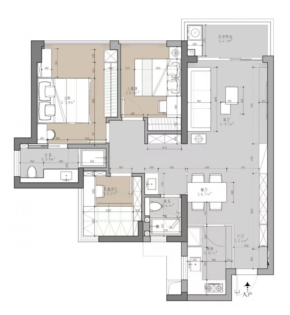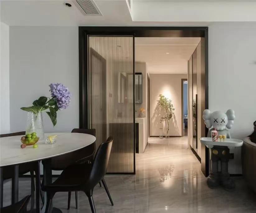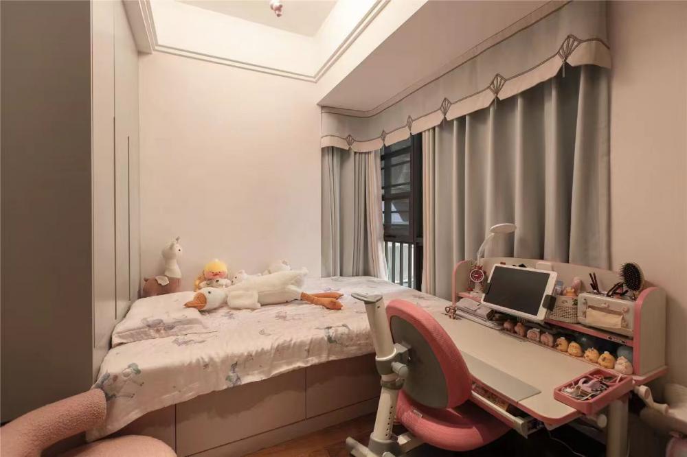 這是一套面積為89平米的三居室,原戶型很方正,優(yōu)化后達(dá)到業(yè)主想要的那種空間大氣的感覺,全家人的儲物空間分配也很合理,玄關(guān)是起點也是亮點,與客廳有著順暢的連續(xù)性,進而讓家的溫度得以串連,現(xiàn)在一起來體驗這個家的豐富與趣味。 入戶進來是餐廳,敲掉了餐桌和洗手盆之間的隔墻,用長虹玻璃進行隔斷,保持通透。 客餐廳之間除了休閑和社交,不加入其它的功能操作,讓每一天都是沉浸式的親子互動時光。 用馬醉木做走道端景,增添家的精致感與活力感,營造出一個舒適放松的公共空間。 將衛(wèi)生間的洗手盆外置,敲掉與餐廳之間的隔墻,方便一家人日常洗手。 L型廚房格局很符合業(yè)主日常的下廚習(xí)慣,置入雙開門冰箱也毫無壓力,廚房收納力更是瞬間翻倍。 深藍(lán)色的睡臥背景,結(jié)合燈帶點綴,看似簡單卻能實現(xiàn)最佳的起夜功能效果。床頭一側(cè),利用飄窗結(jié)合壁柜增加收納空間,方便收納書籍及展示裝飾品。 主衛(wèi)和主臥之間是隔而不斷的,光影的流動和視線的連通能讓人獲得更多身心的自由與放松。 男孩房用收納床的形式,結(jié)合整墻的衣柜設(shè)計,延續(xù)簡約舒適的空間格局,讓孩子在自己的房間內(nèi),學(xué)習(xí)、休息和收納等需求都能滿足。 女孩房是個相對私密又獨立的休憩空間,粉噠噠的色調(diào),是小女孩天真浪漫的標(biāo)簽。大容量的儲物空間作隱形手法,整體更顯簡潔自然。 衛(wèi)生間進行干濕分離,提升空間實用性。白色馬桶與走道上的洗手盆互為呼應(yīng),簡約明快。 陽臺作為全能家政區(qū),滿足洗衣晾曬的需求,又能構(gòu)建起一份生活的悠然與自在。