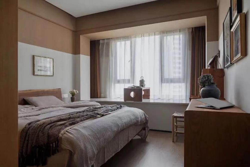 次臥:背景墻選擇分色設(shè)計(jì),保留了飄窗設(shè)計(jì),一盞臺燈足以點(diǎn)亮空間,空間大多選擇自然元素,像床頭,地板,床頭柜都極其貼近自然。