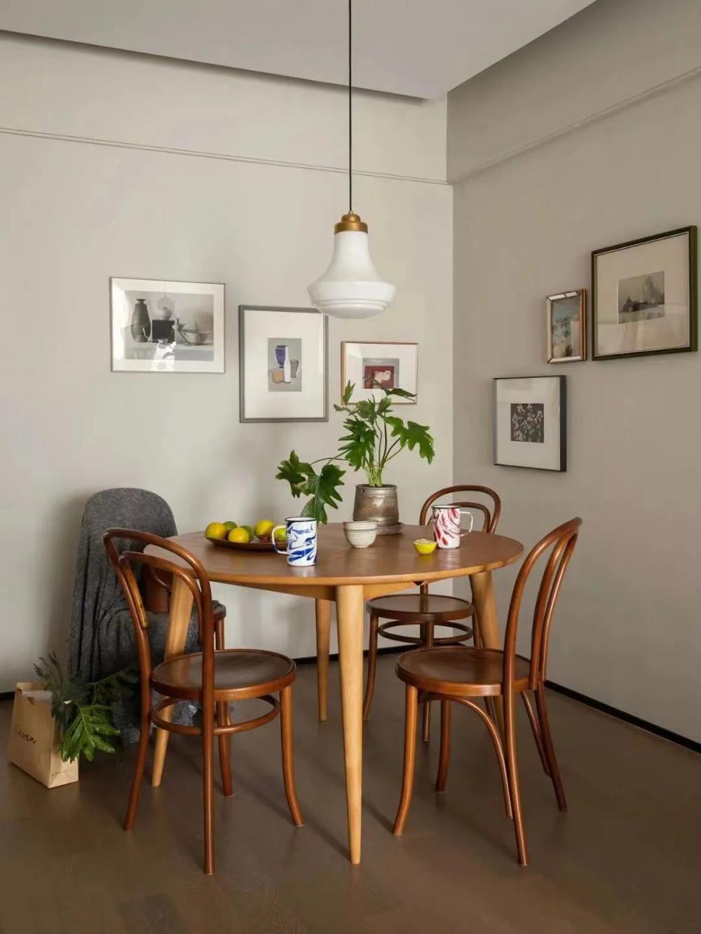 餐廳:木質(zhì)圓形高腳餐桌,兩側(cè)墻壁都選擇小幅裝飾畫裝點(diǎn)空間,白色吊燈垂直而下,水杯一藍(lán)一紅,極其相配,靈動(dòng)舒適。