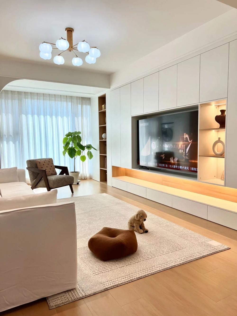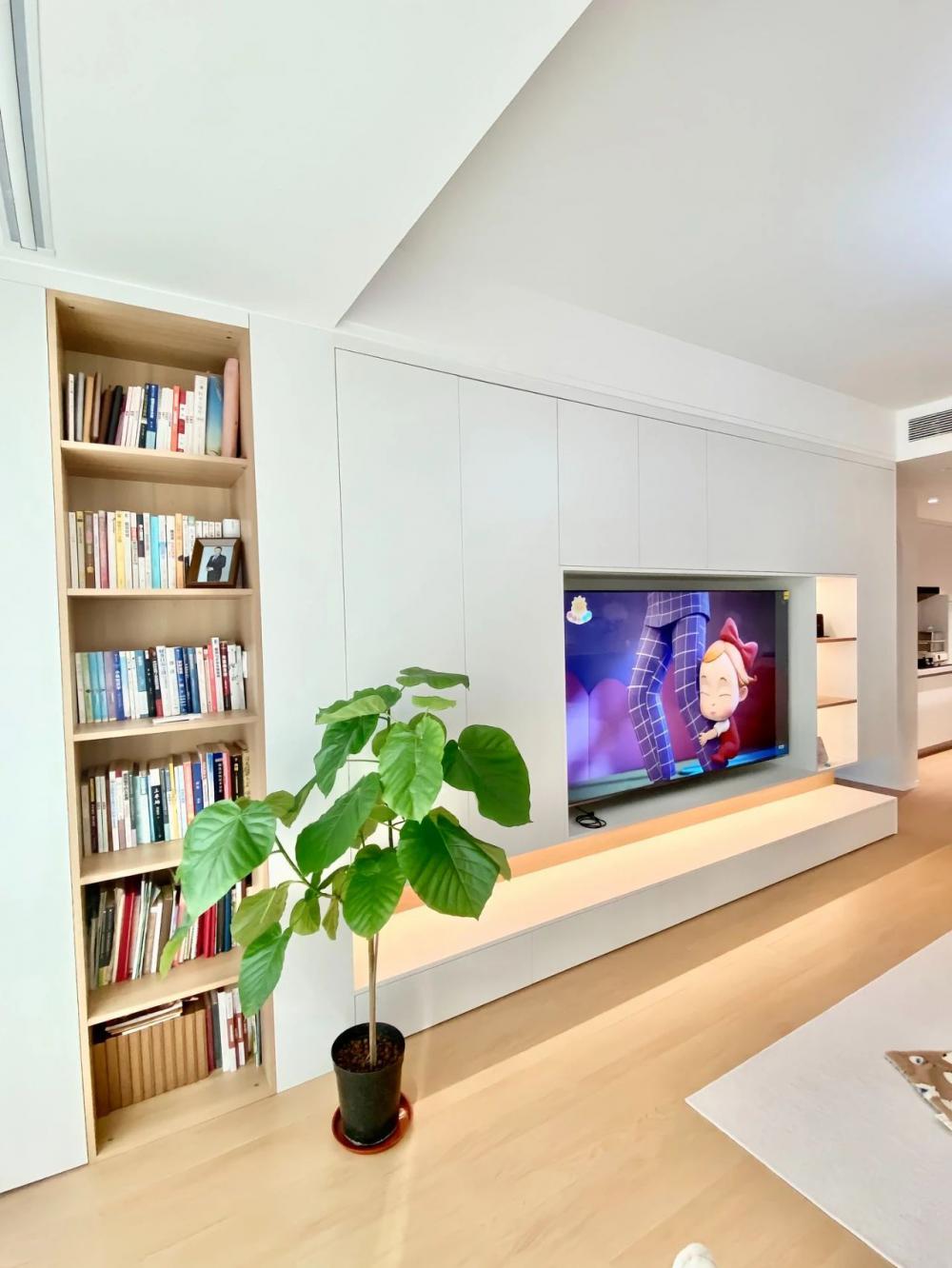 ?這個(gè)小家建筑面積126平,套內(nèi)97平,三室兩廳兩衛(wèi)。 ?客廳開(kāi)間3.55米,沙發(fā)寬1米,75寸電視配上伸縮支架做到與柜門(mén)齊平。 ?全屋通鋪20x120cm 奶油橡木色木紋磚,啞光微肌理,非常有木地板的質(zhì)感,369錯(cuò)縫貼,無(wú)過(guò)門(mén)石;全屋通刷杏子灰,灰調(diào)中帶點(diǎn)綠色很高級(jí),很適合原木風(fēng)。 ?做了5米滿(mǎn)墻電視柜,美觀又實(shí)用,雜七雜八的東西往柜子里一塞,沒(méi)有隨處可見(jiàn)的雜物,真的很省心;柜子深度40cm,柜門(mén)是啞光暖白雙飾面板,無(wú)拉手設(shè)計(jì),反彈器按壓開(kāi)門(mén),層板是活動(dòng)的,可以根據(jù)不同物品調(diào)節(jié)高度。電視柜留開(kāi)放格,不然會(huì)顯得壓抑。 ?陽(yáng)臺(tái),窗戶(hù)都沒(méi)有做門(mén)套,刷乳膠漆收邊,簡(jiǎn)約還好看;在陽(yáng)臺(tái)位置留出來(lái)一排書(shū)柜,躺在搖椅上看書(shū)很愜意。 ?全屋柜子以暖白色為主,做見(jiàn)光板封板,只露出部分原木色,原木色太多的話(huà)容易裝成出租屋;全屋家具以櫻桃木為主,偏紅調(diào),很有質(zhì)感不顯廉價(jià)。 ?走廊盡頭的玄關(guān)用幾個(gè)木板打造了一個(gè)木墩,既能儲(chǔ)物,也能放個(gè)花瓶,插幾支山歸來(lái),妥妥的氛圍感拉滿(mǎn)。 ?半墻的干濕分離衛(wèi)生間,既滿(mǎn)足了實(shí)用性,又讓小家平平無(wú)奇的走廊變得不再單調(diào)。半墻貼了瓷磚,洗手間是用水比較多的地方,貼瓷磚就更好打理一些,不怕濺水。下水管道做成墻排,好打理,下邊還能拿來(lái)放盆或小凳子。在改水電的時(shí)候就留出線(xiàn),安裝智能鏡柜。衛(wèi)生間的門(mén)做單包套,簡(jiǎn)潔美觀還省錢(qián)。 ?11平小臥室,太好睡了。 沒(méi)有復(fù)雜的裝修,簡(jiǎn)單做了一圈雙眼皮吊頂,墻面通刷杏子灰乳膠漆,頂部留的白色,通鋪的369步步高木紋磚,奶茶色的窗簾。夕陽(yáng)西下,影子映射到房間里,一切都是剛剛好的感覺(jué)!忙碌一天回到這樣的小房間,睡上一覺(jué),真是無(wú)比放松、愜意! ?入戶(hù)定制了洞洞板。