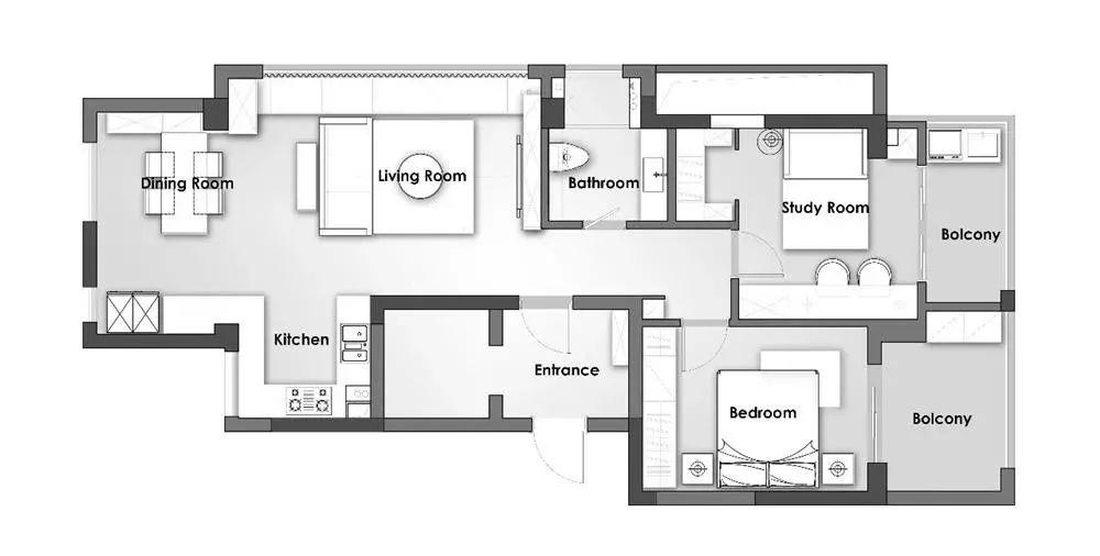 84平的小戶型二居室,客廳里有個長飄窗,輕松擴容