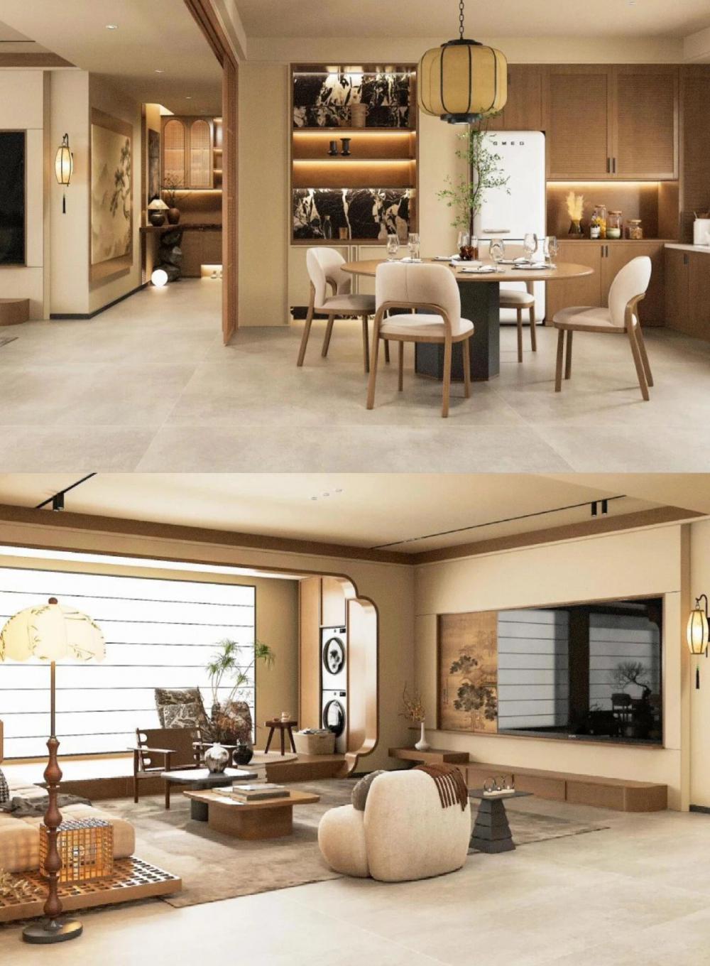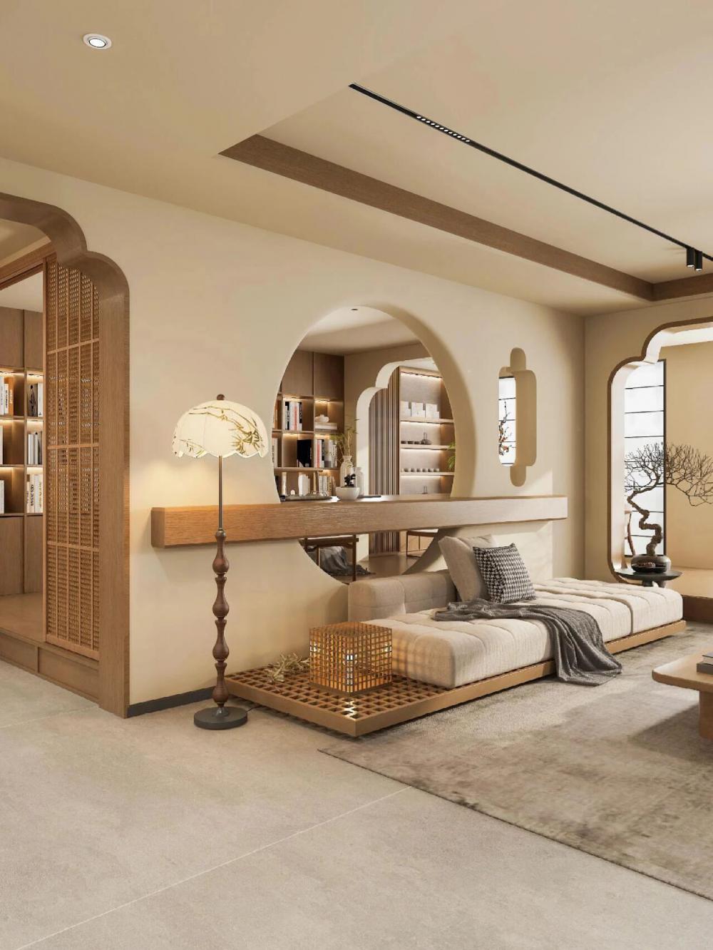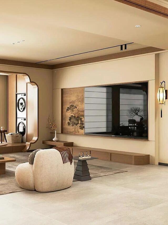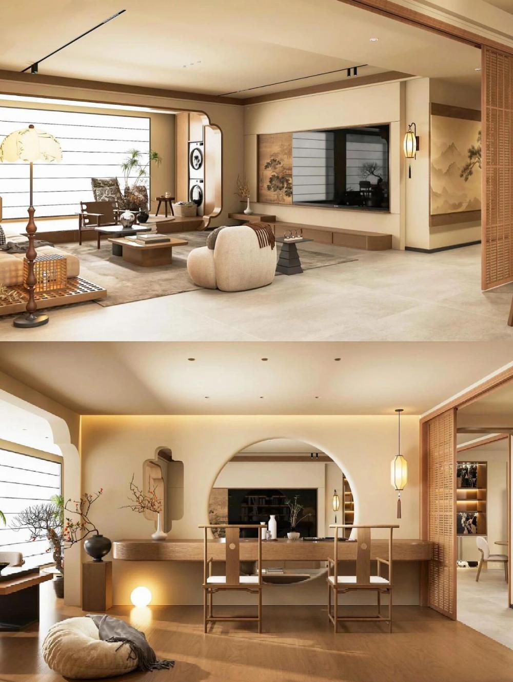 ??小家面積118㎡,原始戶型是較差的,沒(méi)有休閑區(qū)域,為了讓小家“應(yīng)有盡有”,就把小臥室改造成半開放式的書房?茶室?? ??家里的點(diǎn)睛之筆就是書房墻面做了扇形窗洞,增加空間互動(dòng)性,顯貴的同時(shí)連古典韻味都是輕松拿捏,不僅顏值賞心悅目,實(shí)用性也是杠杠的? ?整屋采用開放式布局,奶白色與胡桃木色作為主色調(diào),簡(jiǎn)約而不失穩(wěn)重?? ?客廳地面鋪設(shè)大規(guī)格萊姆石瓷磚,書房采用胡桃色木紋磚,氛圍感滿滿,更顯高級(jí)?? . ?墻面選擇了奶白色乳膠漆,做了無(wú)主燈設(shè)計(jì),黑色踢腳線過(guò)度墻面。搭配大面積山水掛畫,為小家增添不少中式氣息~?? ?書房加入藤編移門和半墻設(shè)計(jì),墻面設(shè)計(jì)圓形窗洞?小軒窗,既美觀又增加空間的通透感?? . ?書桌做了懸浮設(shè)計(jì),擺放兩把胡桃木椅子,面對(duì)客廳,增加空間的互動(dòng)性?? ?將陽(yáng)臺(tái)地面抬高8cm,打造地臺(tái)。在地臺(tái)的左側(cè),定制儲(chǔ)物柜,用來(lái)存放茶具和茶葉。右側(cè)洗衣機(jī)內(nèi)嵌設(shè)計(jì),空間利用率高?? ?廚房砸墻改做推拉移門,將餐廳轉(zhuǎn)移包裹進(jìn)去,增加廚房的功能性,使空間動(dòng)線顯得更加流暢,端菜備菜更加便捷,省時(shí)又省力?? ?衛(wèi)生間做開闊實(shí)用的三分離設(shè)計(jì),做了大理石臺(tái)面方便打,不留水漬!鏡子是四葉草造型搭配燈帶,氛圍感滿滿~??