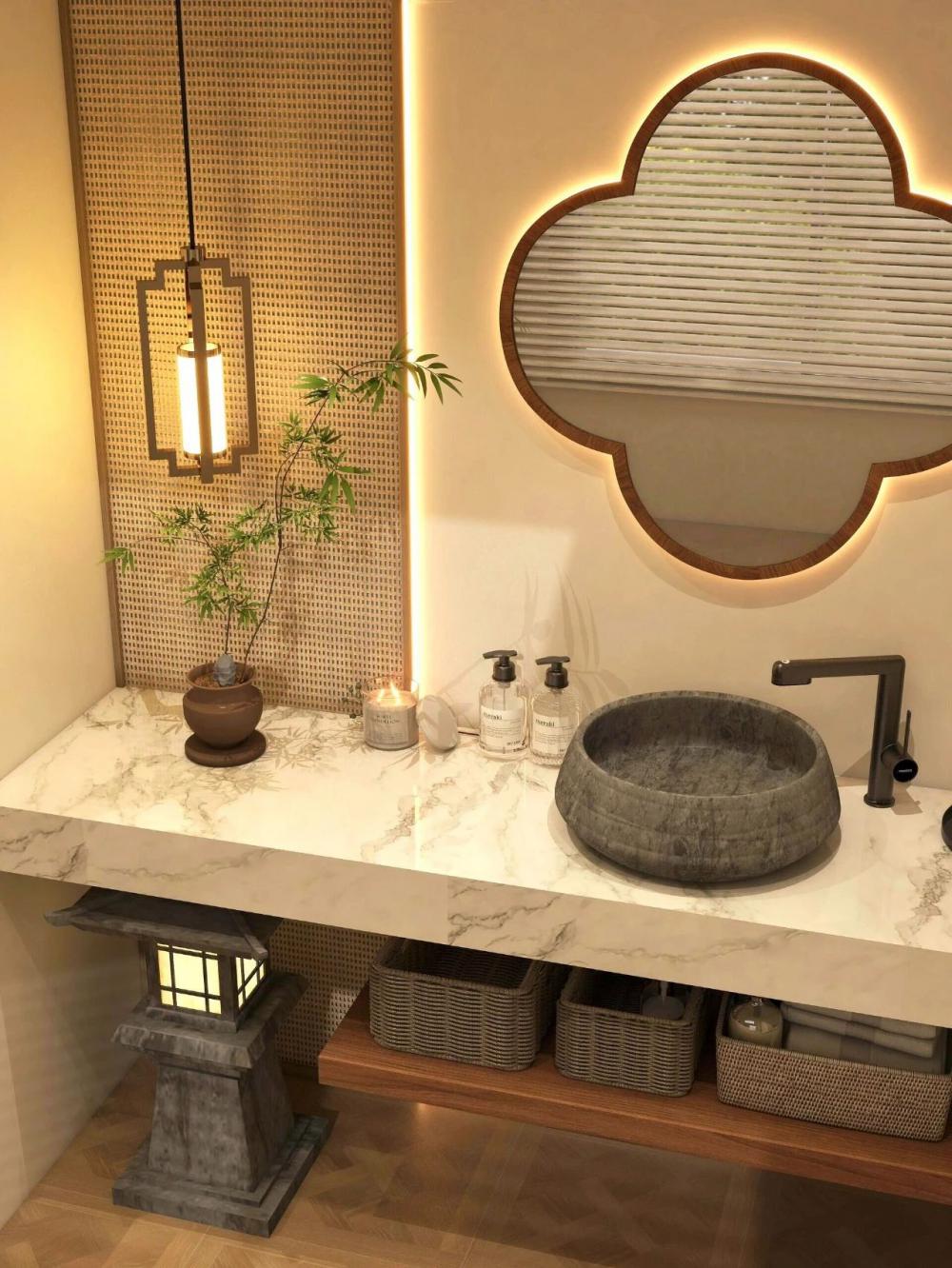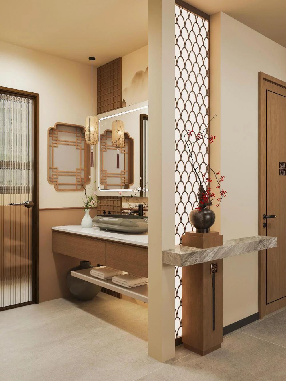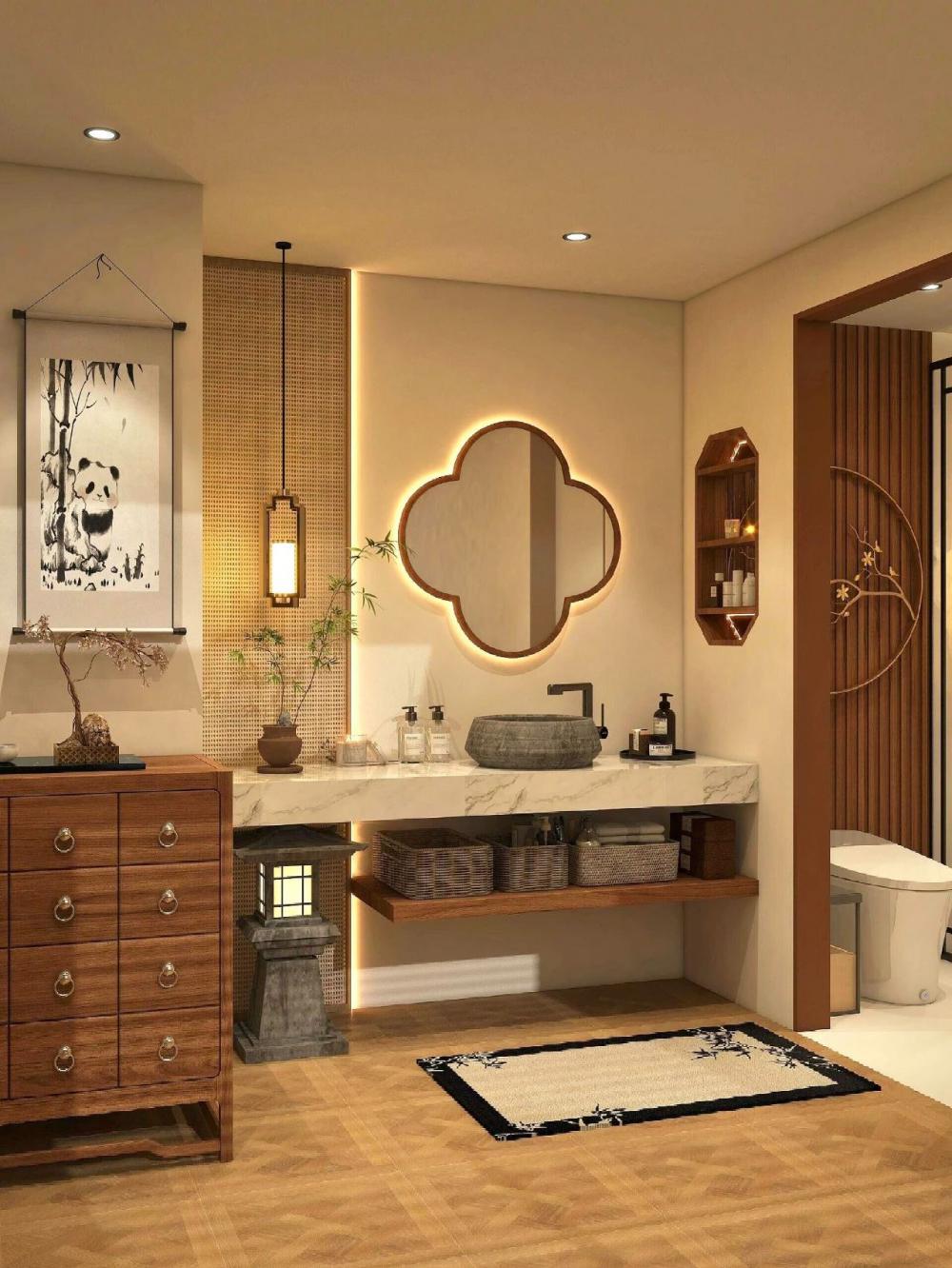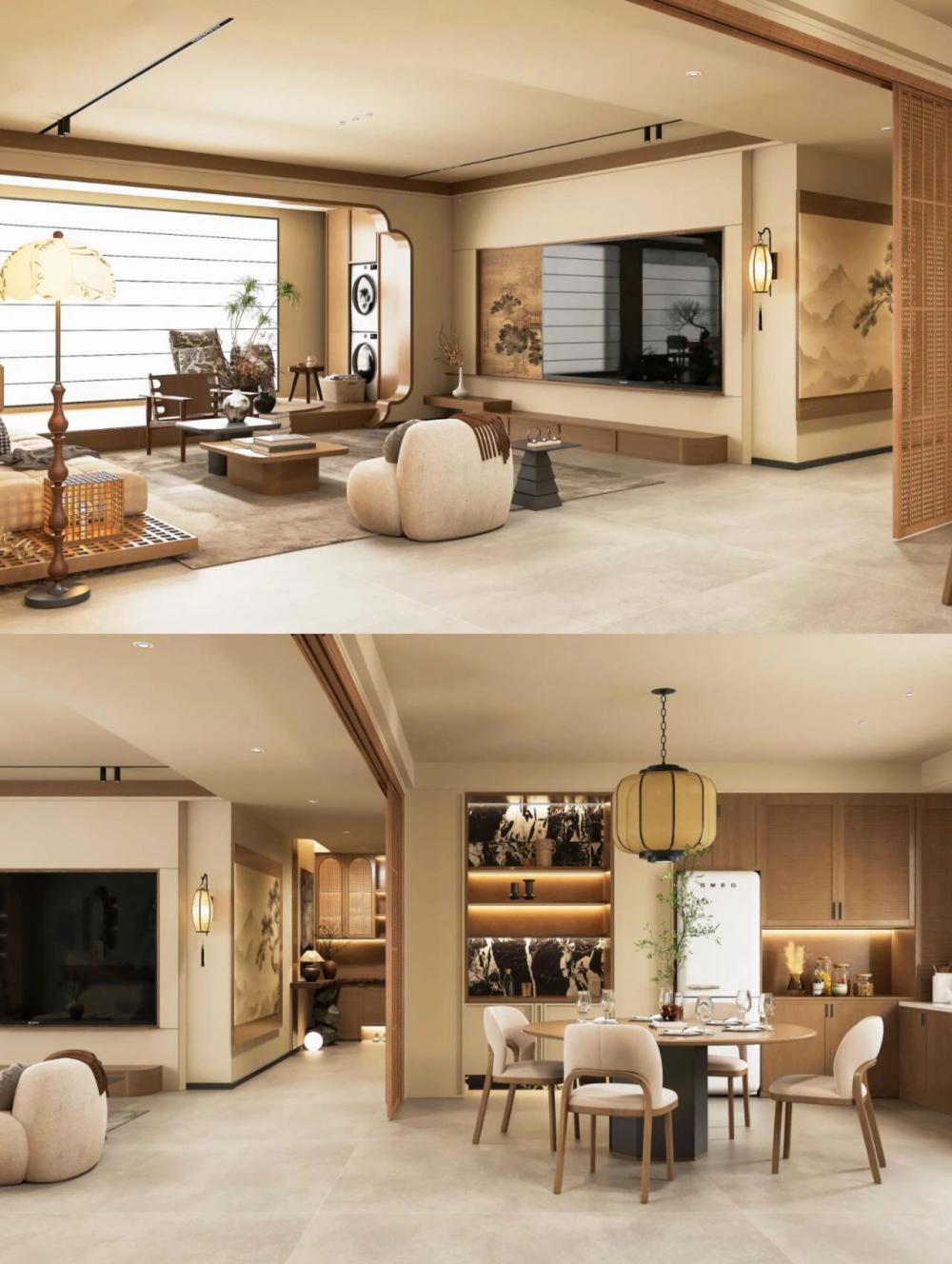 ??小家面積118㎡,原始戶型是較差的,沒(méi)有休閑區(qū)域,為了讓小家“應(yīng)有盡有”,就把小臥室改造成半開放式的書房?茶室?? ??家里的點(diǎn)睛之筆就是書房墻面做了扇形窗洞,增加空間互動(dòng)性,顯貴的同時(shí)連古典韻味都是輕松拿捏,不僅顏值賞心悅目,實(shí)用性也是杠杠的? ?整屋采用開放式布局,奶白色與胡桃木色作為主色調(diào),簡(jiǎn)約而不失穩(wěn)重?? ?客廳地面鋪設(shè)大規(guī)格萊姆石瓷磚,書房采用胡桃色木紋磚,氛圍感滿滿,更顯高級(jí)?? . ?墻面選擇了奶白色乳膠漆,做了無(wú)主燈設(shè)計(jì),黑色踢腳線過(guò)度墻面。搭配大面積山水掛畫,為小家增添不少中式氣息~?? ?書房加入藤編移門和半墻設(shè)計(jì),墻面設(shè)計(jì)圓形窗洞?小軒窗,既美觀又增加空間的通透感?? . ?書桌做了懸浮設(shè)計(jì),擺放兩把胡桃木椅子,面對(duì)客廳,增加空間的互動(dòng)性?? ?將陽(yáng)臺(tái)地面抬高8cm,打造地臺(tái)。在地臺(tái)的左側(cè),定制儲(chǔ)物柜,用來(lái)存放茶具和茶葉。右側(cè)洗衣機(jī)內(nèi)嵌設(shè)計(jì),空間利用率高?? ?廚房砸墻改做推拉移門,將餐廳轉(zhuǎn)移包裹進(jìn)去,增加廚房的功能性,使空間動(dòng)線顯得更加流暢,端菜備菜更加便捷,省時(shí)又省力?? ?衛(wèi)生間做開闊實(shí)用的三分離設(shè)計(jì),做了大理石臺(tái)面方便打,不留水漬!鏡子是四葉草造型搭配燈帶,氛圍感滿滿~??