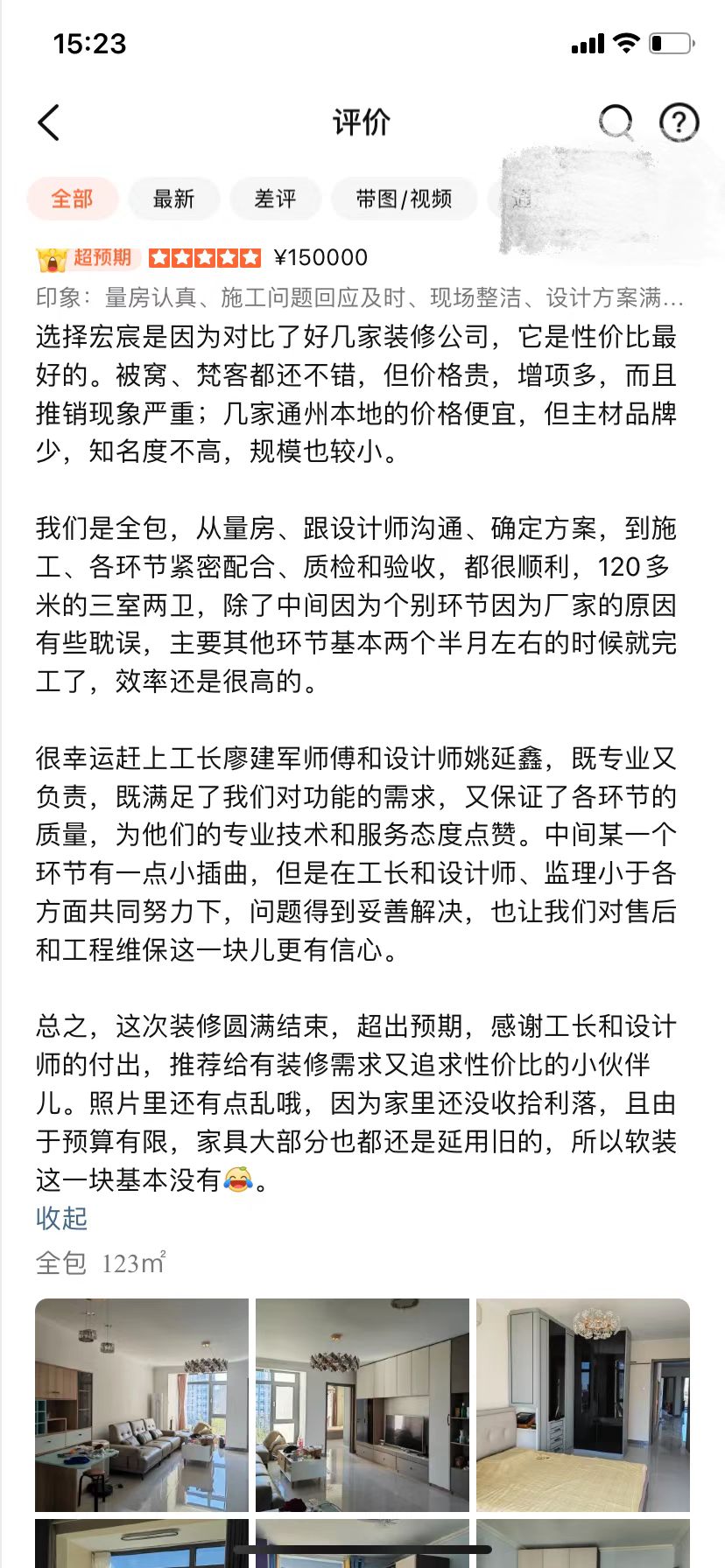 選擇宏宸是因為對比了好幾家裝修公司,它是性價比最好的。被窩、梵客都還不錯,但價格貴,增項多,而且推銷現(xiàn)象嚴重;幾家通州本地的價格便宜,但主材品牌少,知名度不高,規(guī)模也較小。 我們是全包,從量房、跟設(shè)計師溝通、確定方案,到施工、各環(huán)節(jié)緊密配合、質(zhì)檢和驗收,都很順利,120多米的三室兩衛(wèi),除了中間因為個別環(huán)節(jié)因為廠家的原因有些耽誤,主要其他環(huán)節(jié)基本兩個半月左右的時候就完工了,效率還是很高的。 很幸運趕上工長廖建軍師傅和設(shè)計師姚延鑫,既專業(yè)又負責,既滿足了我們對功能的需求,又保證了各環(huán)節(jié)的質(zhì)量,為他們的專業(yè)技術(shù)和服務(wù)態(tài)度點贊。中間某一個環(huán)節(jié)有一點小插曲,但是在工長和設(shè)計師、監(jiān)理小于各方面共同努力下,問題得到妥善解決,也讓我們對售后和工程維保這一塊兒更有信心。 總之,這次裝修圓滿結(jié)束,超出預(yù)期,感謝工長和設(shè)計師的付出,推薦給有裝修需求又追求性價比的小伙伴兒。照片里還有點亂哦,因為家里還沒收拾利落,且由于預(yù)算有限,家具大部分也都還是延用舊的,所以軟裝這一塊基本沒有[笑哭]。