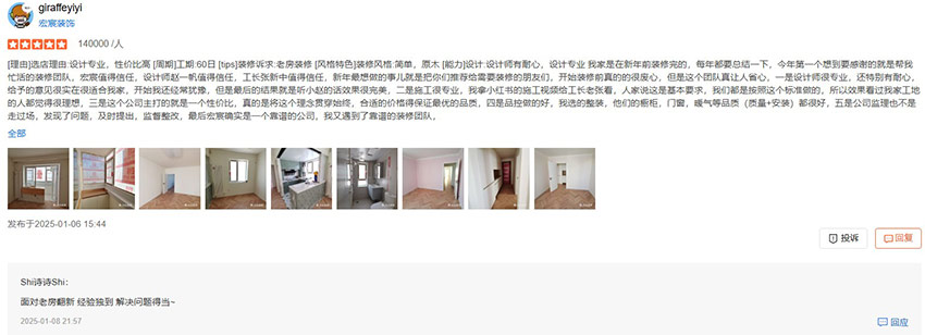 [理由]選店理由:設(shè)計(jì)專業(yè),性價(jià)比高 [周期]工期:60日 [tips]裝修訴求:老房裝修 [風(fēng)格特色]裝修風(fēng)格:簡(jiǎn)單,原木 [能力]設(shè)計(jì):設(shè)計(jì)師有耐心,設(shè)計(jì)專業(yè) 我家是在新年前裝修完的,每年都要總結(jié)一下,今年第一個(gè)想到要感謝的就是幫我忙活的裝修團(tuán)隊(duì),宏宸值得信任,設(shè)計(jì)師趙一帆值得信任,工長(zhǎng)張新中值得信任,新年最想做的事兒就是把你們推薦給需要裝修的朋友們,開始裝修前真的的很廢心,但是這個(gè)團(tuán)隊(duì)真讓人省心,一是設(shè)計(jì)師很專業(yè),還特別有耐心,給予的意見很實(shí)在很適合我家,開始我還經(jīng)常猶豫,但是最后的結(jié)果就是聽小趙的話效果很完美,二是施工很專業(yè),我拿小紅書的施工視頻給工長(zhǎng)老張看,人家說這是基本要求,我們都是按照這個(gè)標(biāo)準(zhǔn)做的,所以效果看過我家工地的人都覺得很理想,三是這個(gè)公司主打的就是一個(gè)性價(jià)比,真的是將這個(gè)理念貫穿始終,合適的價(jià)格得保證最優(yōu)的品質(zhì),四是品控做的好,我選的整裝,他們的櫥柜,門窗,暖氣等品質(zhì)(質(zhì)量+安裝)都很好,五是公司監(jiān)理也不是走過場(chǎng),發(fā)現(xiàn)了問題,及時(shí)提出,監(jiān)督整改,最后宏宸確實(shí)是一個(gè)靠譜的公司,我又遇到了靠譜的裝修團(tuán)隊(duì),