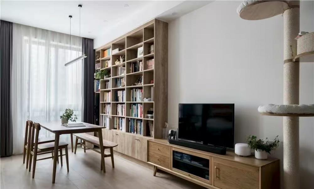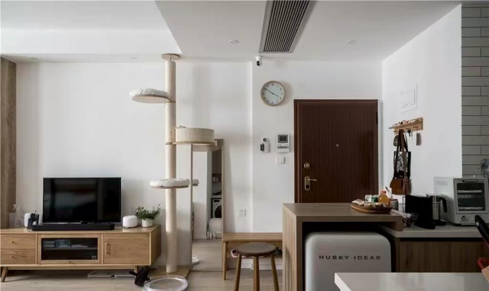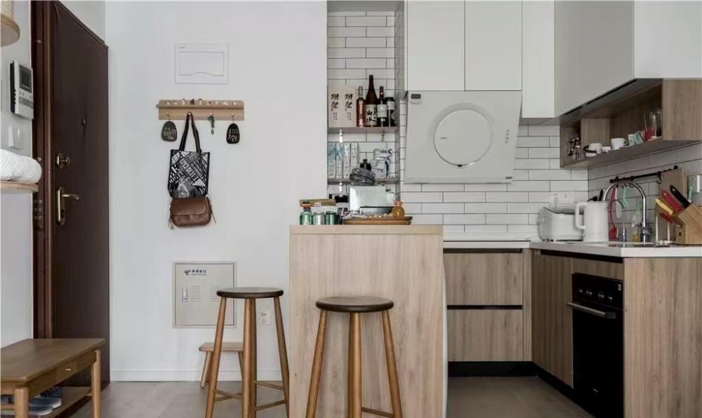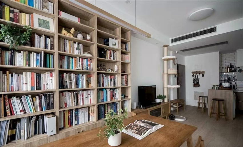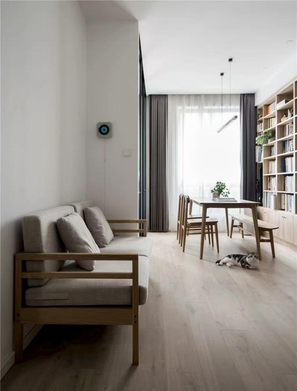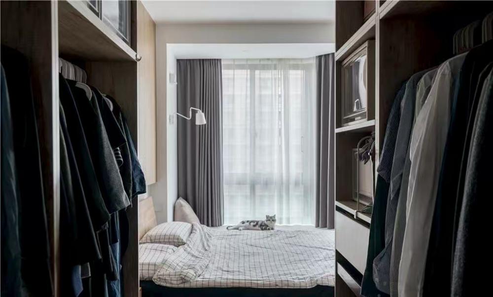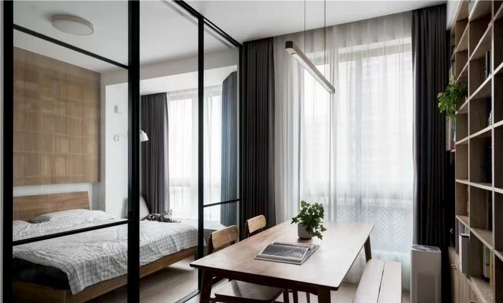 本案是一套建面為60平米,使用面積僅45平米的一居室小戶型,家庭成員是小兩口和兩只貓。風(fēng)格定義為自然簡約的日式風(fēng),適合小戶型,加上開放式廚房設(shè)計和玻璃隔斷墻的使用,這個不大的一居,變得開闊通透了許多。 打通客廳與書房,沒有了隔墻,原來狹小局促的空間一下子開闊了許多。淺淡的白色和木色,搭配簡單的布藝沙發(fā),開放明亮、文藝清新。 客廳與書房、廚房是全開放式的,整個室內(nèi)空間以白色與木色為主,自然樸素,同時在視覺上也給人非常干凈明快的感覺。 電視柜與書柜并排擺放,低矮的電視柜與通頂?shù)臅裥纬慑e落的感覺,實用性強,但又不會過滿,適當(dāng)?shù)牧舭祝@得更簡潔靈動。 電視柜旁邊做了一個貓爬架,每一層都架棉墊子,給喵星人們舒適的休息玩樂區(qū)。 一個大大的書桌,代替客廳占據(jù)落地窗前絕佳區(qū)域。悠閑的假日,學(xué)會在這里”虛度時光”,攤開一本書,一直消磨到月升日落。 書桌后面是一大面的開放書架,內(nèi)部尺寸也經(jīng)過仔細(xì)規(guī)劃,一小格尺寸基本為40*25公分,隔板過長或因承重而變形,但高度可自行調(diào)整。 書桌除了看書辦公之用,也可以就餐,一桌多用。 入戶正對廚房,特地做出來的吧臺,不僅可以做為小兩口的簡餐區(qū),還增加了操作空間,形成U型廚房設(shè)計,將電器都嵌入地柜之中,整潔且有序。 吧臺下面是冰箱位,旁邊還有面包機、咖啡機、微波爐,還利用隔板做了收納架 原來衛(wèi)生間過于擁擠,將干區(qū)分離,結(jié)合洗衣機,放在過道上,利用率很高。 衛(wèi)生間選用掛壁馬桶,一方面因為做了移位方便排污,一方面節(jié)省馬桶占用空間。 臥室和公共空間通過玻璃隔斷劃分,既滿足了開放的需求,讓視線無限延伸,又免去了貓主子進(jìn)衣帽間和臥室“造反”的困擾。 臥室也做了休閑飄窗,為了不破壞絕對C位——書房的采光和視野,屋主選擇將晾衣區(qū)放在這里,壁燈上面就是可伸縮的晾衣架,需要時抽出,也很方便。 利用原有餐區(qū)制作衣帽間,為了通行方便,衣帽間沒有完全封閉,而是在兩側(cè)用移門隔斷。