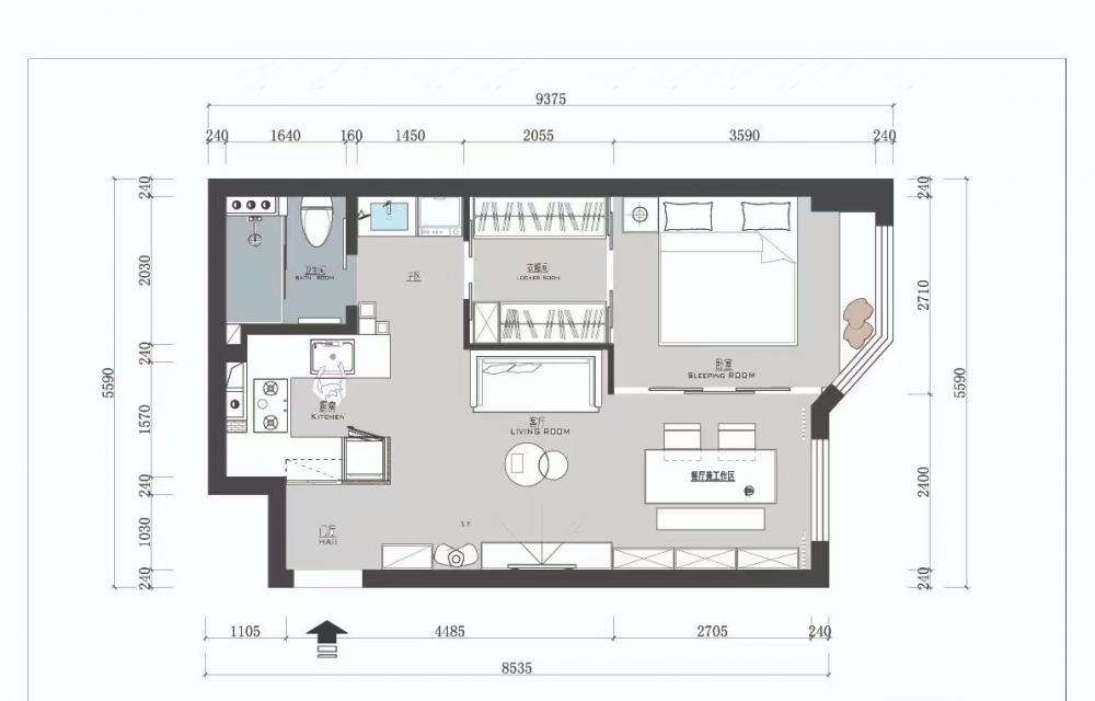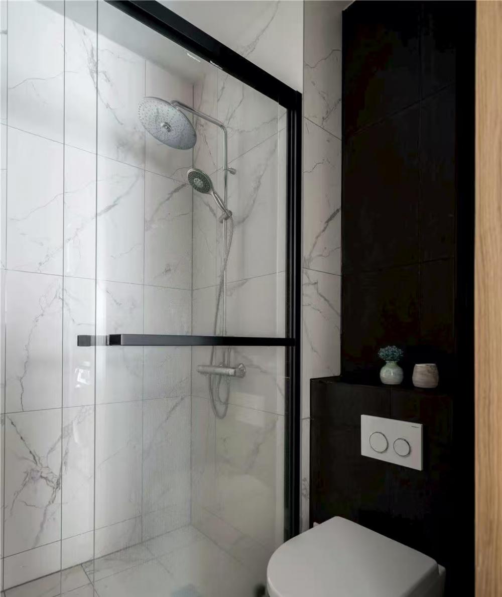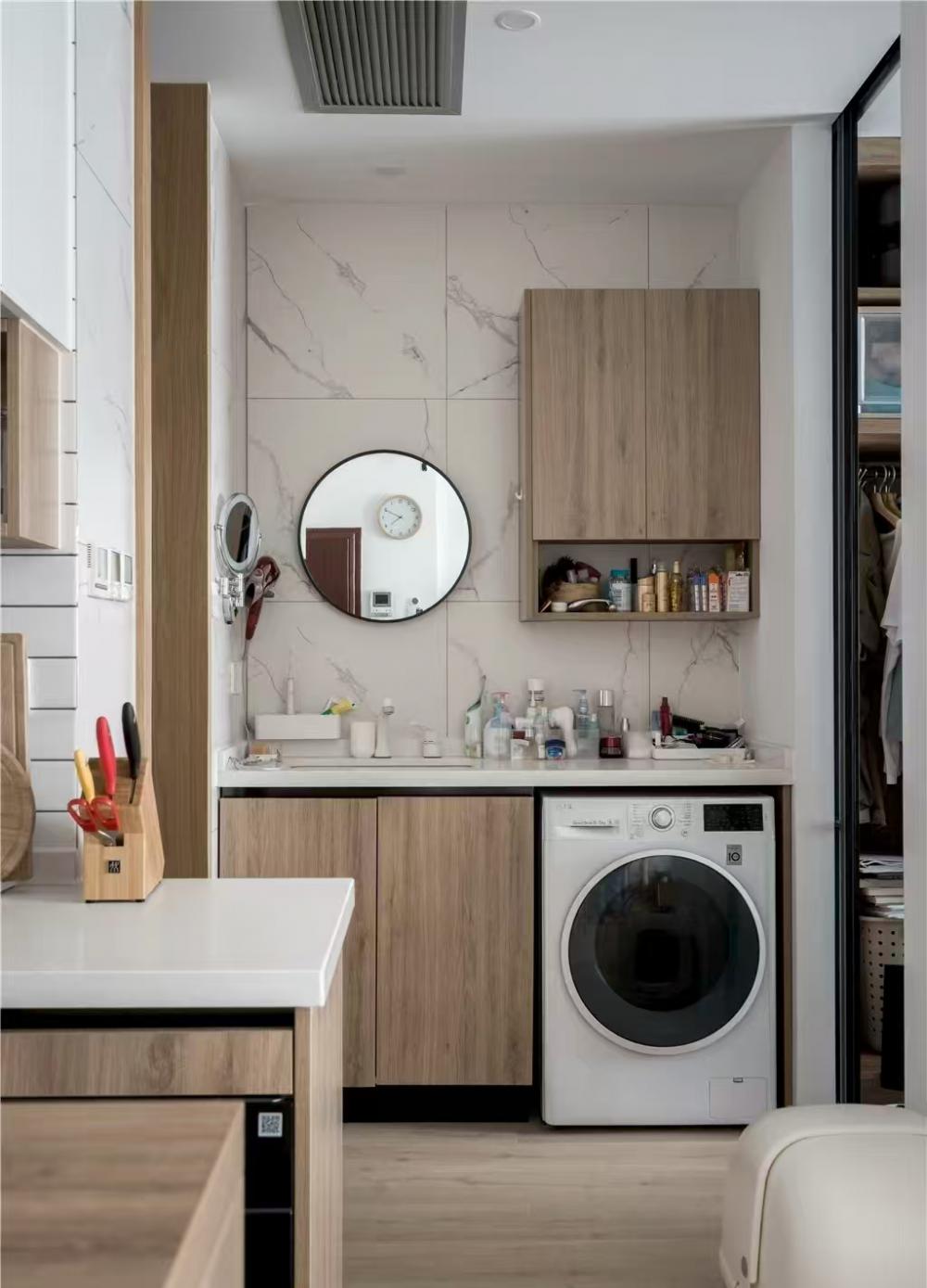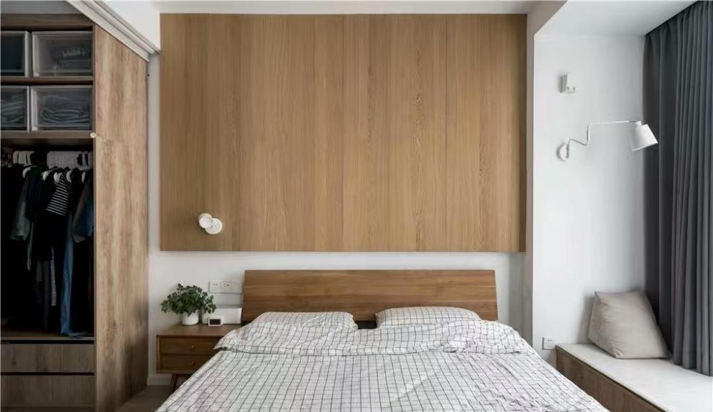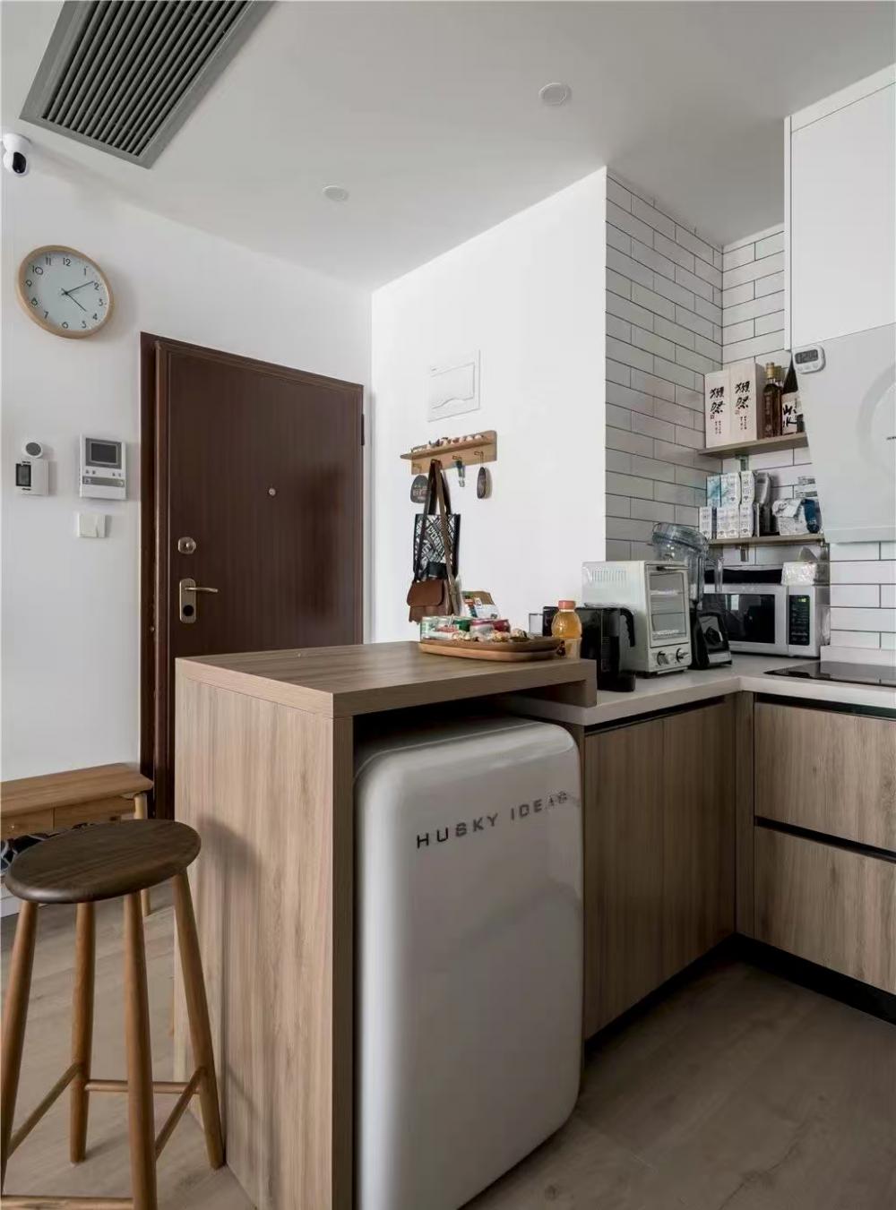 本案是一套建面為60平米,使用面積僅45平米的一居室小戶型,家庭成員是小兩口和兩只貓。風(fēng)格定義為自然簡約的日式風(fēng),適合小戶型,加上開放式廚房設(shè)計和玻璃隔斷墻的使用,這個不大的一居,變得開闊通透了許多。 打通客廳與書房,沒有了隔墻,原來狹小局促的空間一下子開闊了許多。淺淡的白色和木色,搭配簡單的布藝沙發(fā),開放明亮、文藝清新。 客廳與書房、廚房是全開放式的,整個室內(nèi)空間以白色與木色為主,自然樸素,同時在視覺上也給人非常干凈明快的感覺。 電視柜與書柜并排擺放,低矮的電視柜與通頂?shù)臅裥纬慑e落的感覺,實用性強,但又不會過滿,適當(dāng)?shù)牧舭祝@得更簡潔靈動。 電視柜旁邊做了一個貓爬架,每一層都架棉墊子,給喵星人們舒適的休息玩樂區(qū)。 一個大大的書桌,代替客廳占據(jù)落地窗前絕佳區(qū)域。悠閑的假日,學(xué)會在這里”虛度時光”,攤開一本書,一直消磨到月升日落。 書桌后面是一大面的開放書架,內(nèi)部尺寸也經(jīng)過仔細(xì)規(guī)劃,一小格尺寸基本為40*25公分,隔板過長或因承重而變形,但高度可自行調(diào)整。 書桌除了看書辦公之用,也可以就餐,一桌多用。 入戶正對廚房,特地做出來的吧臺,不僅可以做為小兩口的簡餐區(qū),還增加了操作空間,形成U型廚房設(shè)計,將電器都嵌入地柜之中,整潔且有序。 吧臺下面是冰箱位,旁邊還有面包機、咖啡機、微波爐,還利用隔板做了收納架 原來衛(wèi)生間過于擁擠,將干區(qū)分離,結(jié)合洗衣機,放在過道上,利用率很高。 衛(wèi)生間選用掛壁馬桶,一方面因為做了移位方便排污,一方面節(jié)省馬桶占用空間。 臥室和公共空間通過玻璃隔斷劃分,既滿足了開放的需求,讓視線無限延伸,又免去了貓主子進(jìn)衣帽間和臥室“造反”的困擾。 臥室也做了休閑飄窗,為了不破壞絕對C位——書房的采光和視野,屋主選擇將晾衣區(qū)放在這里,壁燈上面就是可伸縮的晾衣架,需要時抽出,也很方便。 利用原有餐區(qū)制作衣帽間,為了通行方便,衣帽間沒有完全封閉,而是在兩側(cè)用移門隔斷。